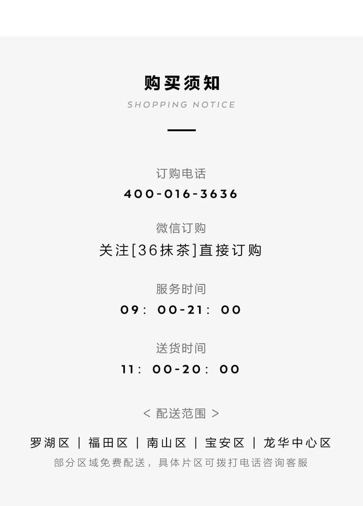 我们目前拥有36MATCHART和36cake两个品牌,主营抹茶甜品与新鲜蛋糕,深受数百万抹茶控和甜品控的拥趸。好吃安心,奶油只选法国铁塔。全城3小时免 费速达。客服热线400-016-3636