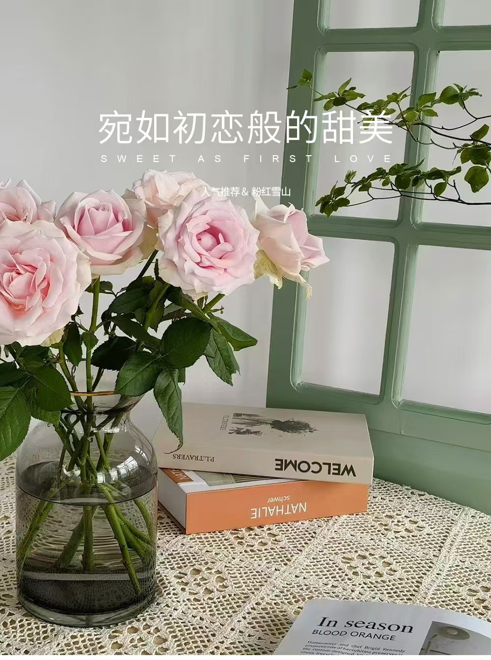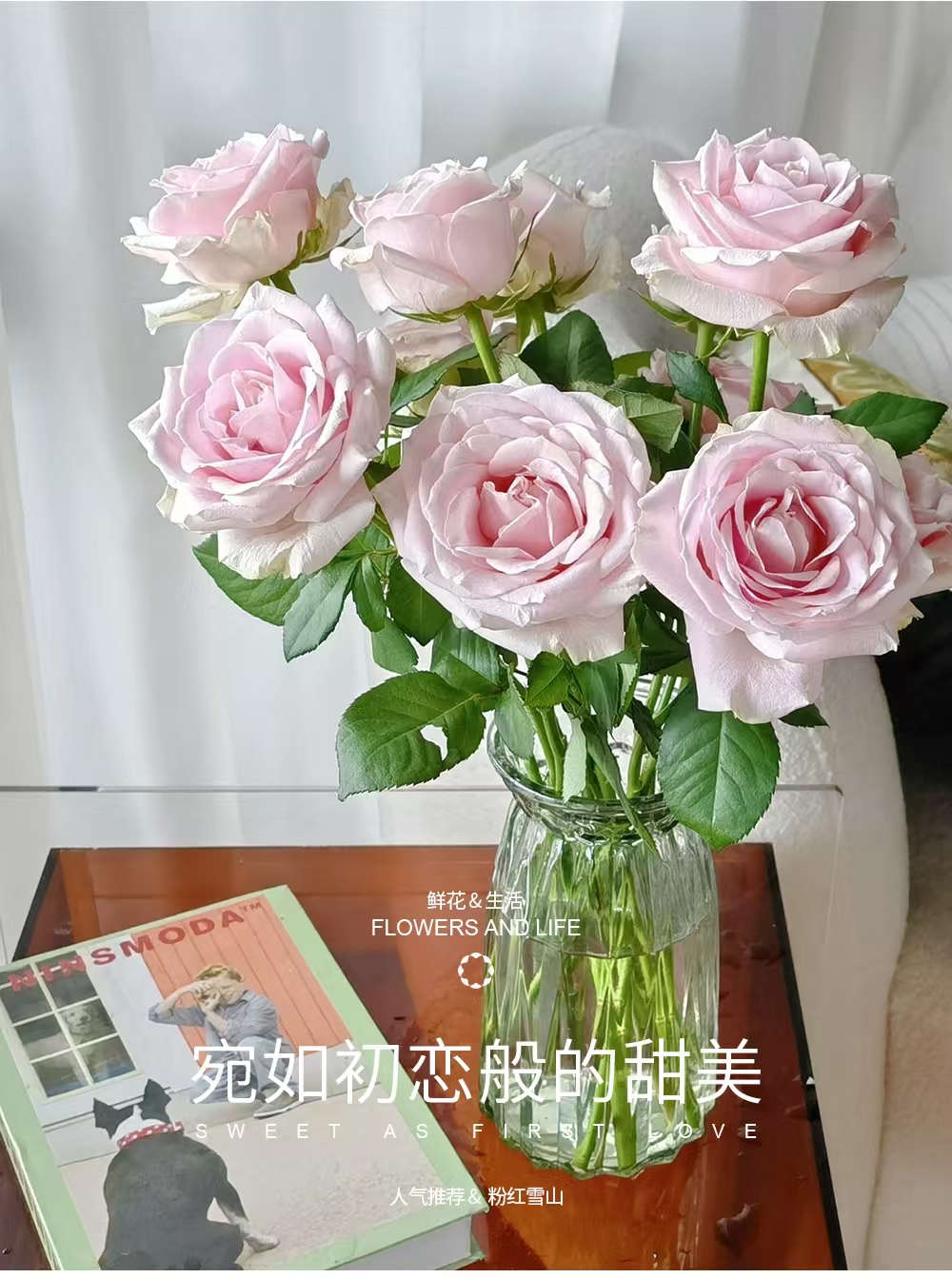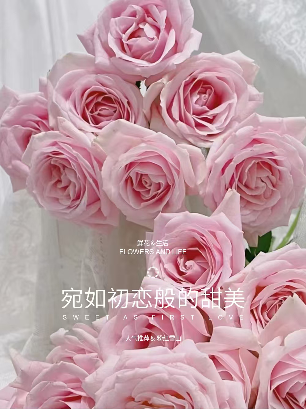 【英文】Sweet Avalanche Rose 【花语】初恋、优雅高贵、感谢 【外观特点】花色为浅粉色,是粉色系中颜色浅的花材之一;花型为高杯花环状,非常标准的玫瑰高杯状花 型,带有淡淡的香味。