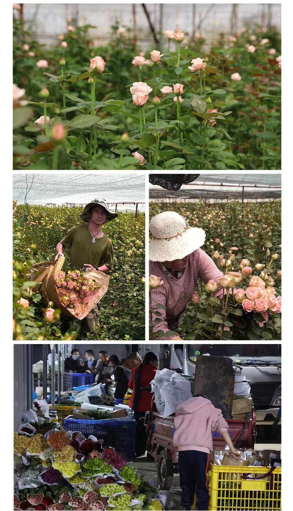 花瓣厚度中等,带明显的玫瑰尖。 开放度高,可以开炸,但一般不会露花芯。 颜色浅,耐运性一般,比较容易擦边折痕,剥掉保护花瓣即可