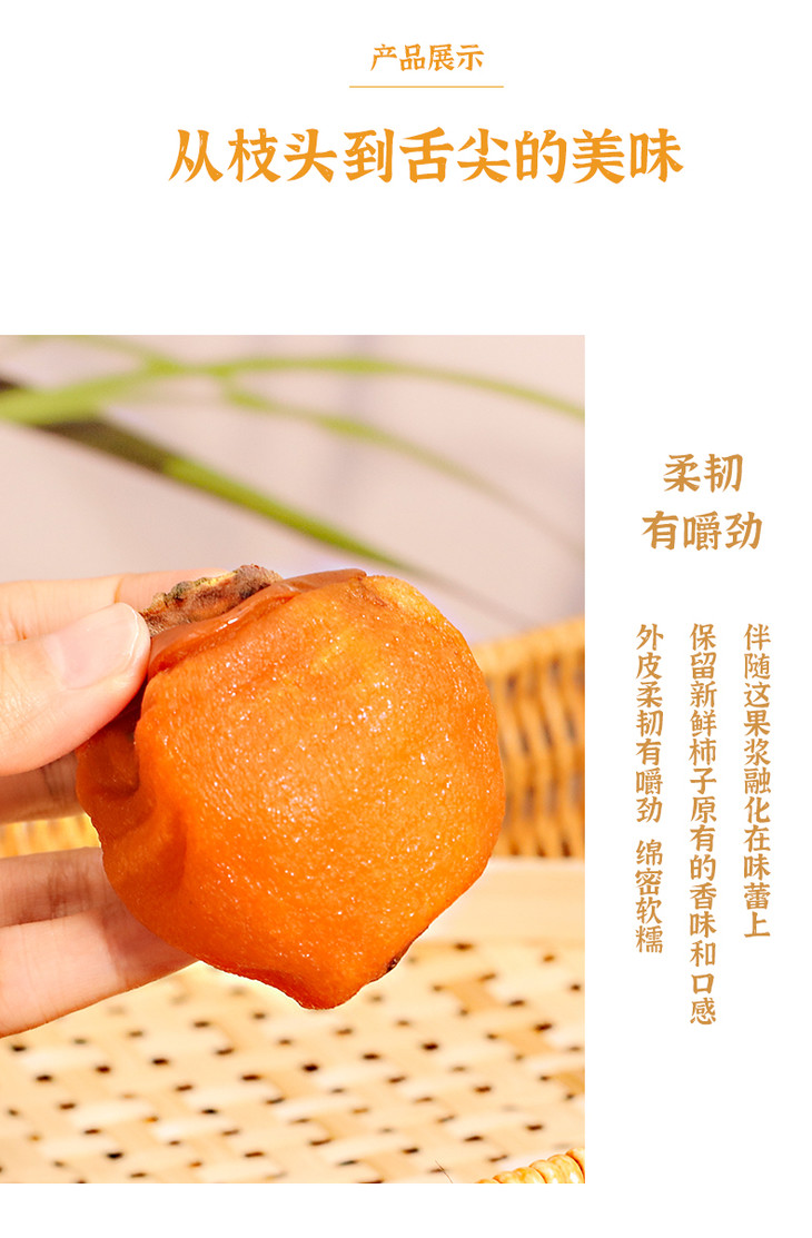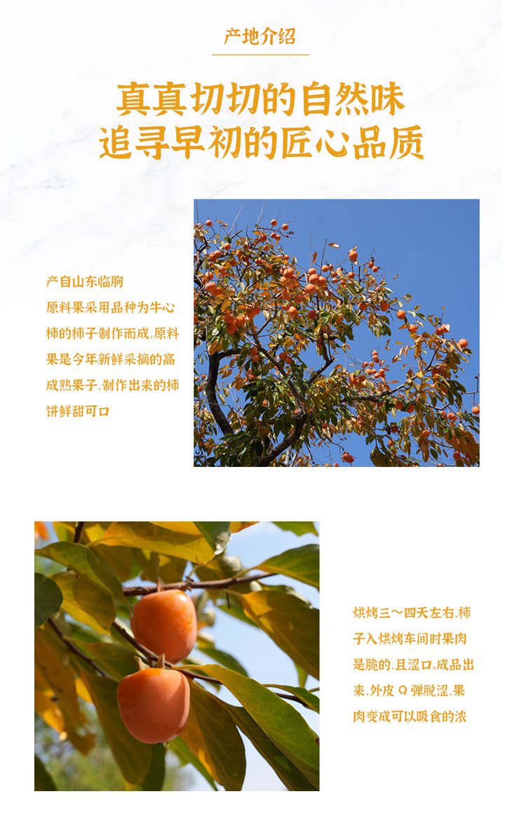 鲜食柿来自山东临朐,采用的是当季鲜甜树上熟成牛心柿,比起一般柿饼,鲜食柿饼更能凸显柿子的原味和口感,既有鲜柿的柔软,又有柿饼的韧性,对工艺要求也是很高,从人工采摘-三道清洗-光电分拣-数控削皮-手工吊饼-智能烘烤,各个环节工序都非常严苛,加工过程不添加任何防腐剂,10万级洁净包装车间,始终保持10度恒温,最后,在零下18度专用低温条件下储存。也正是因为制作工艺特殊,鲜食柿饼的含水量,比普通柿饼高出不少!