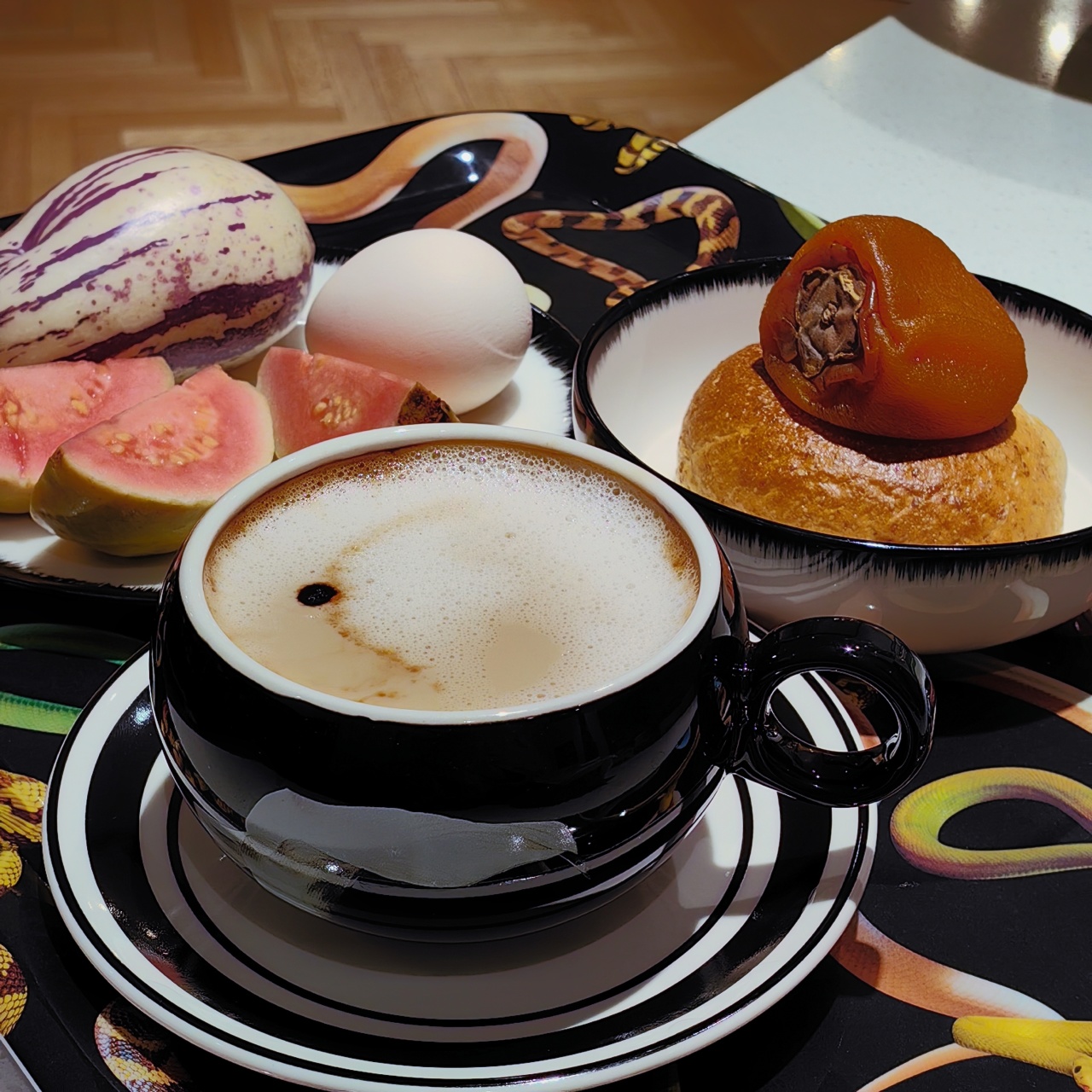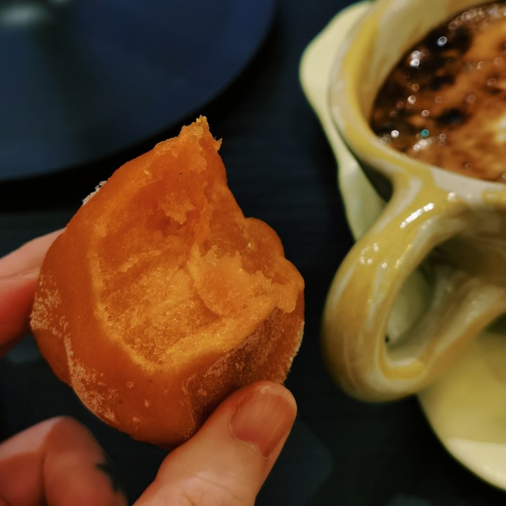 我D1次吃到鲜食柿子的时候,真的惊艳!收到时刚好化冻,柿子已经软到可以戳出酒窝,真的好吃!外皮是柿饼的韧韧口感,内里软糯爆浆,柿肉像奶油在嘴里化开,又像果冻一样Q弹,口感层次超级丰富,但却一点儿都不甜腻,冰冰凉凉,甜甜蜜蜜,弹弹又糯糯!因为大爱今朝的抹茶柿子司康,我也试了黄油柿子吐司,非常非常美味,就是吃完得洗手!
