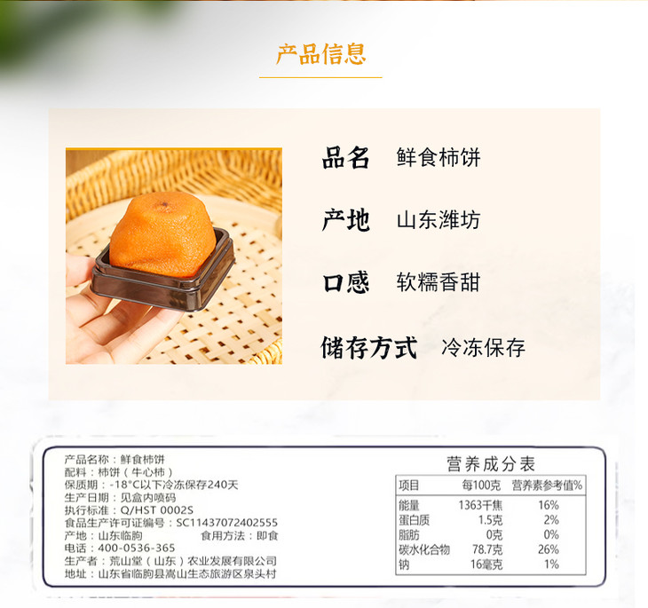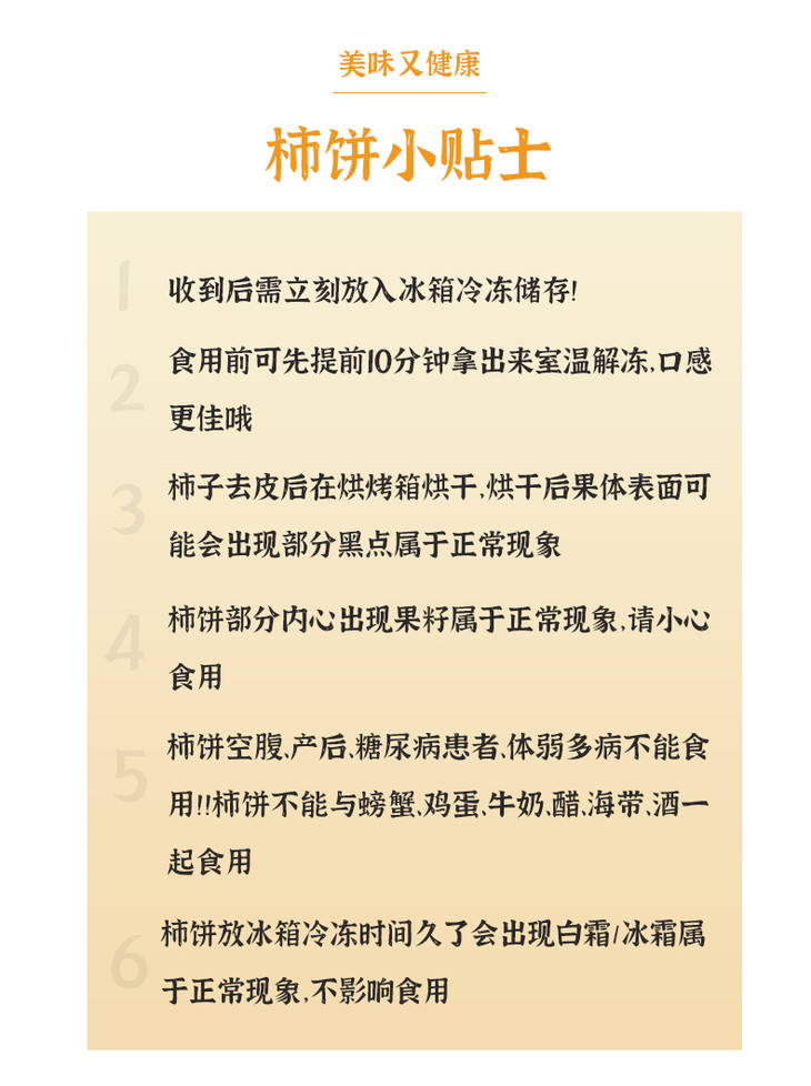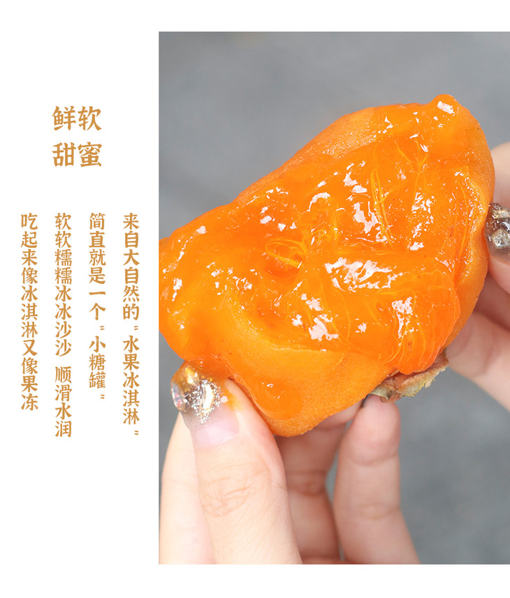 鲜食柿饼单枚净重70g左右,有6枚装也有20枚装,全程冷链,大家收到后一定要放冰箱冷冻,吃之前提前20分钟拿出来室温解冻,体验感会更好哦!比柿子方便,比柿饼水嫩,真的,值得吃吃!