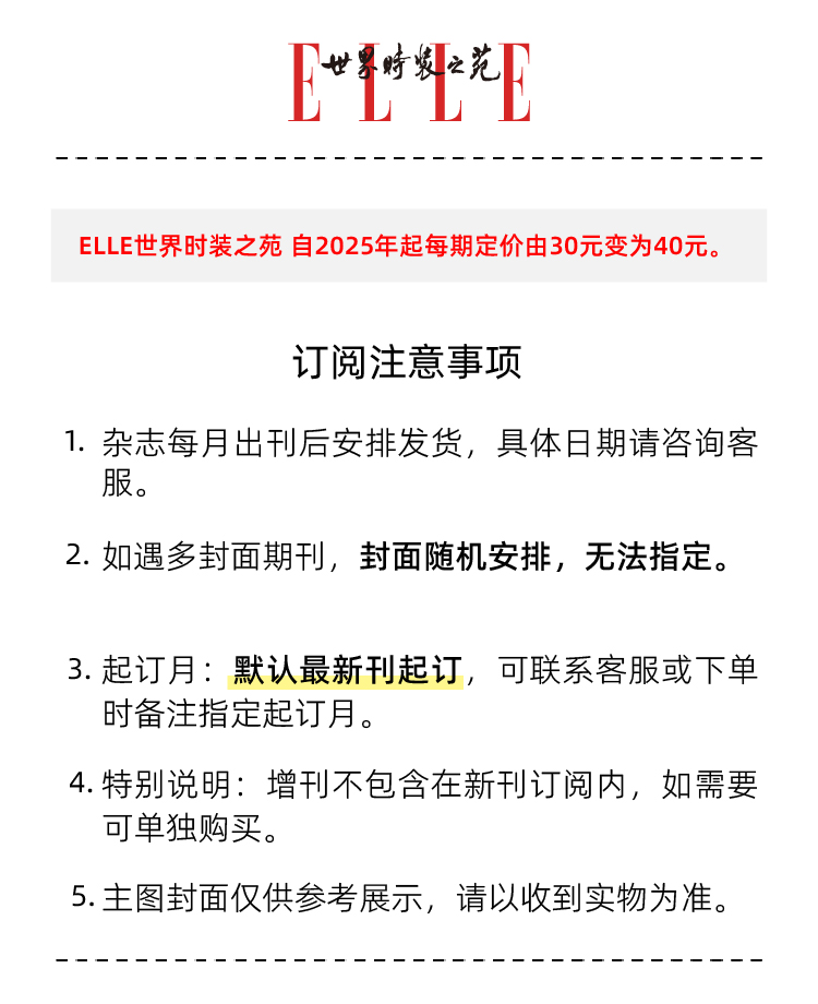 2026年 ELLE世界时装之苑杂志 新刊订阅15期 送ERBAMIGINA卓效紧致50%高浓细胞精华 女性时尚穿搭杂志