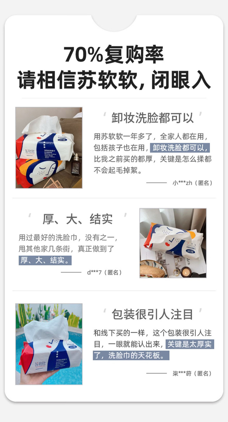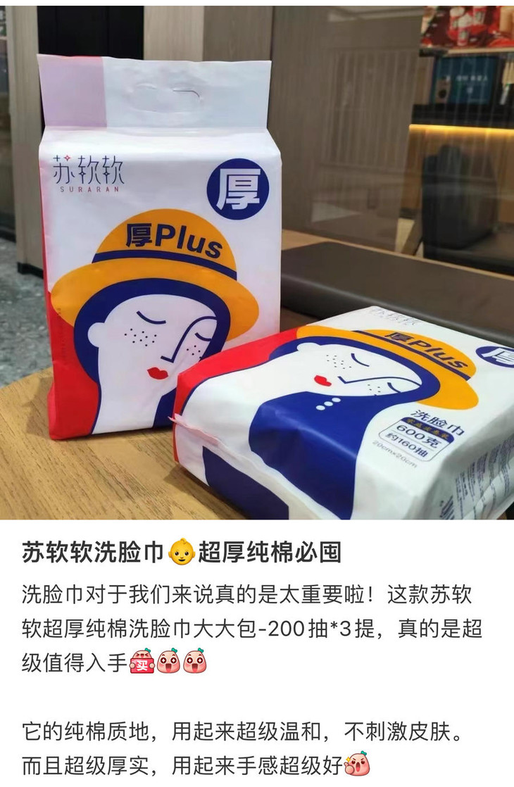 苏软软的洗脸巾,蛮久以前就想上了,喜欢这包装,而且比起无染和绒呼吸,真的便宜太多!无染60抽3盒69.9,而苏软软60抽4包,是39.9,家庭款大包更划算,200抽*3包才69.9哦!重点是,也很好用,必须冲啊!我是十几年没用过毛巾了,洗脸巾是真方便,而且干净,不会湿哒哒沤出细菌!
