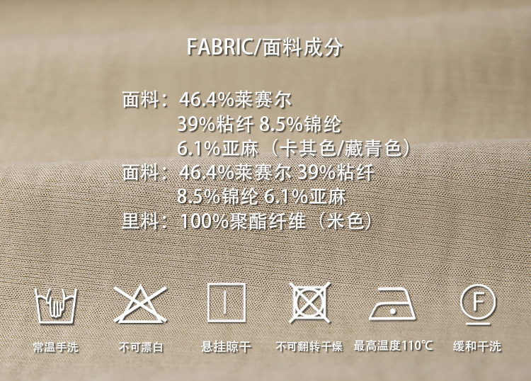 面料:46.4%莱赛尔39%粘纤8.5%锦纶 6.1%亚麻