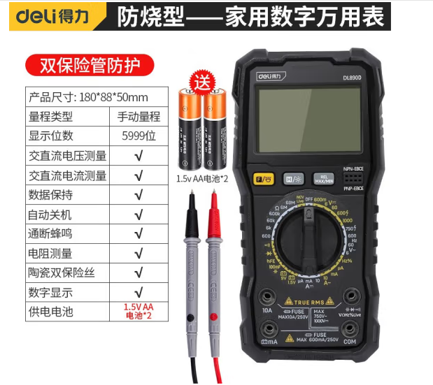 得力DL890C+数字万用表5999位温度测试(红黑)