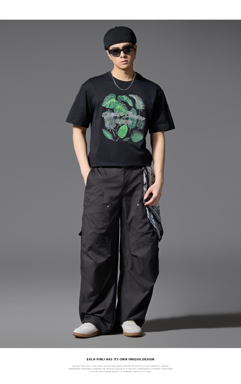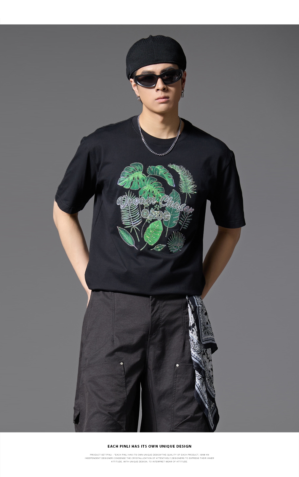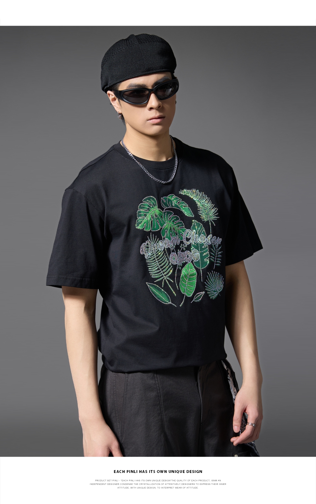 PINLI品立2025春夏新款树叶烫钻短袖T恤男士潮牌纯棉休闲百搭上衣BG252111006