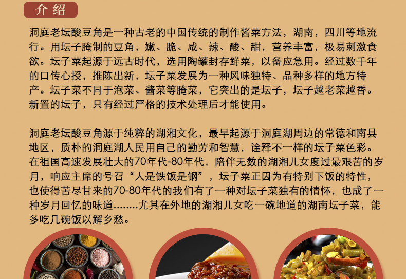 洞庭老坛酸豆角 是一种古老的中国传统的制作酱菜方法,湖南,四川等地流行。用坛子腌制的豆角,嫩、脆、咸、辣、酸、甜,营养丰富,极易刺激食欲。坛子菜起源于远古时代,选用陶罐封存鲜菜,以备应急用。经过数千年的口传心授,推陈出新,坛子菜发展为一种风味独特、品种多样的地方特产。坛子菜不同于泡菜、酱菜等腌菜,它突出的是坛子,坛子越老菜越香。新置的坛子,只有经过严格的技术处理后才能使用。洞庭老坛酸豆角 源于纯粹的湖湘文化,最早起源于洞庭湖周边的常德和南县地区,质朴的洞庭湖人民用自己的勤劳和智慧,诠释不一样的坛子菜色彩。在祖国高速发展壮大的70年代-80年代,陪伴无数的湖湘儿女度过最艰苦的岁月,响应主席的号召“人是铁饭是钢”,坛子菜正因为有特别下饭的特性,也使得苦尽甘来的70-80年代的我们有了一种对坛子菜独有的情怀,也成了一种岁月回忆的味道........尤其在外地的湖湘儿女吃一碗地道的湖南坛子菜,能多吃几碗饭以解乡愁。