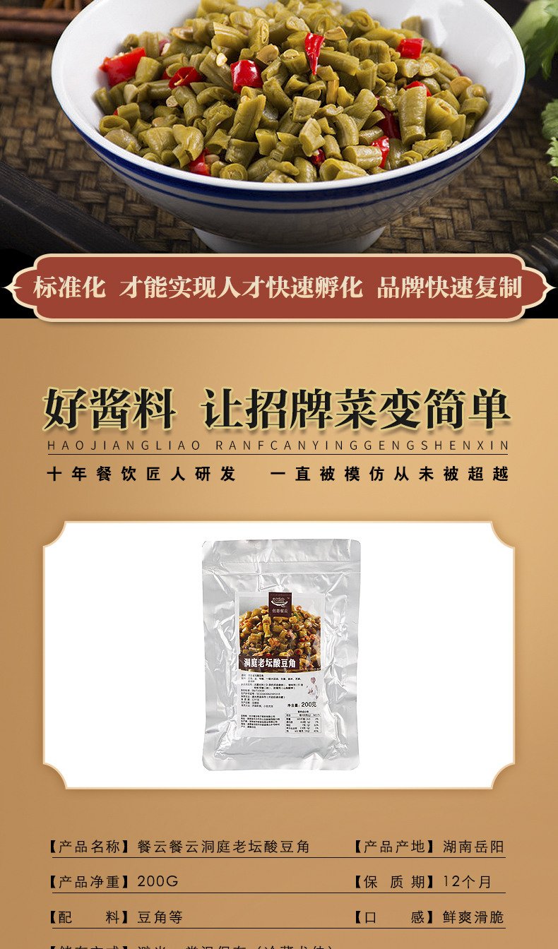 餐云洞庭老坛酸豆角 餐云系列老坛子菜品中的经典产品 广泛应用于招牌下饭菜创新 深受年轻消费群体的钟爱(200克装一包做1份)