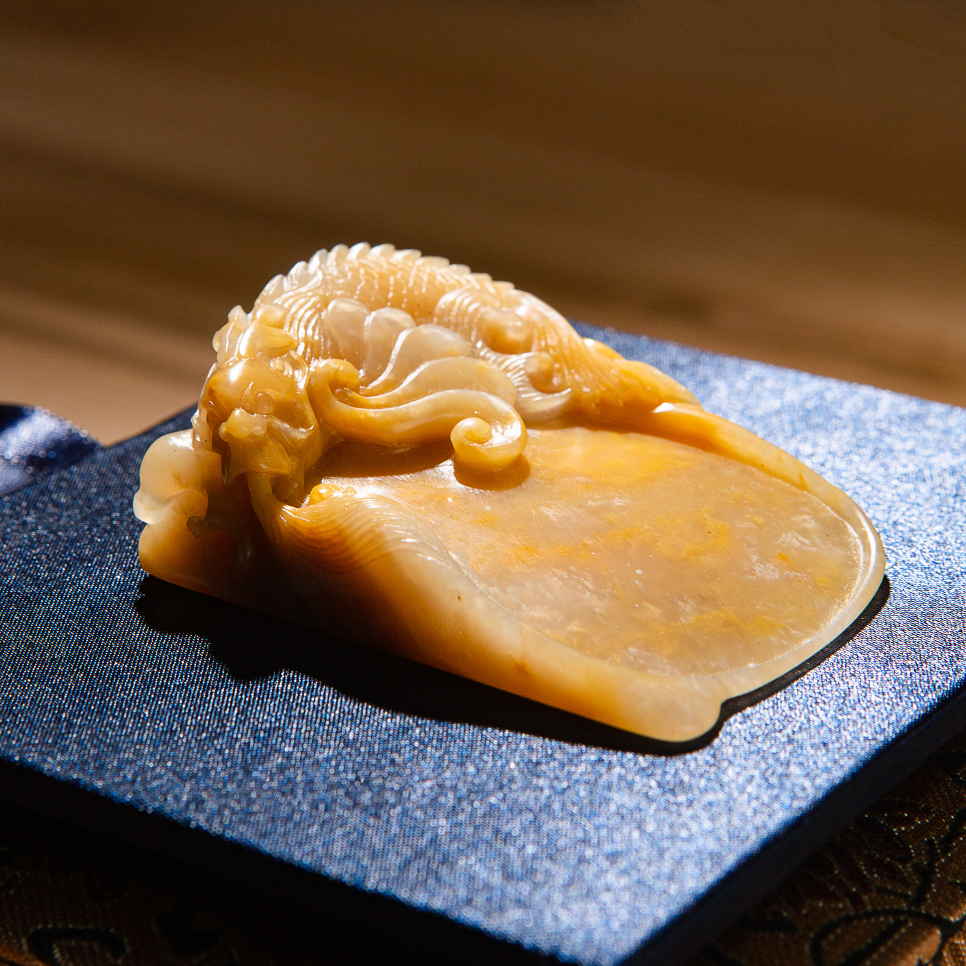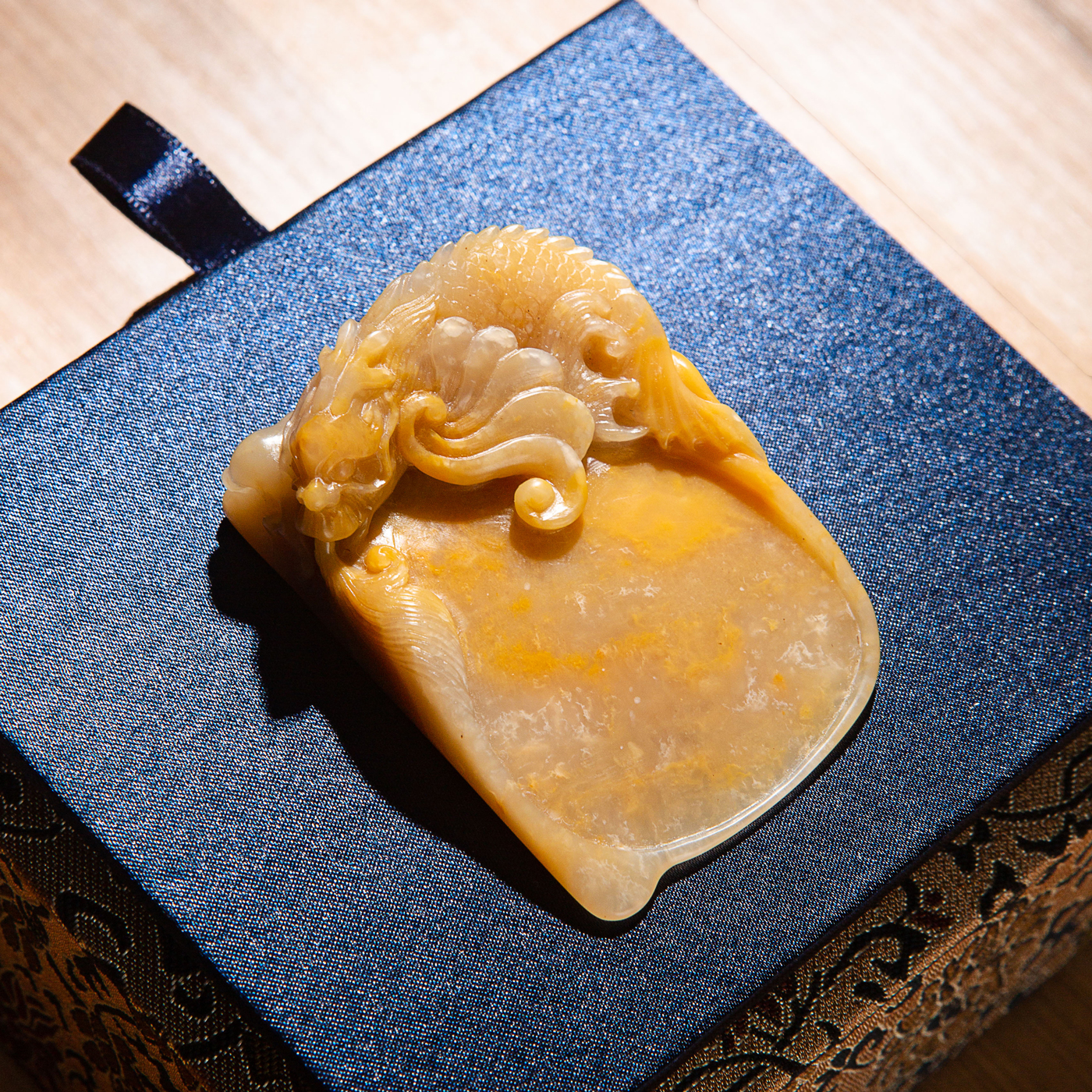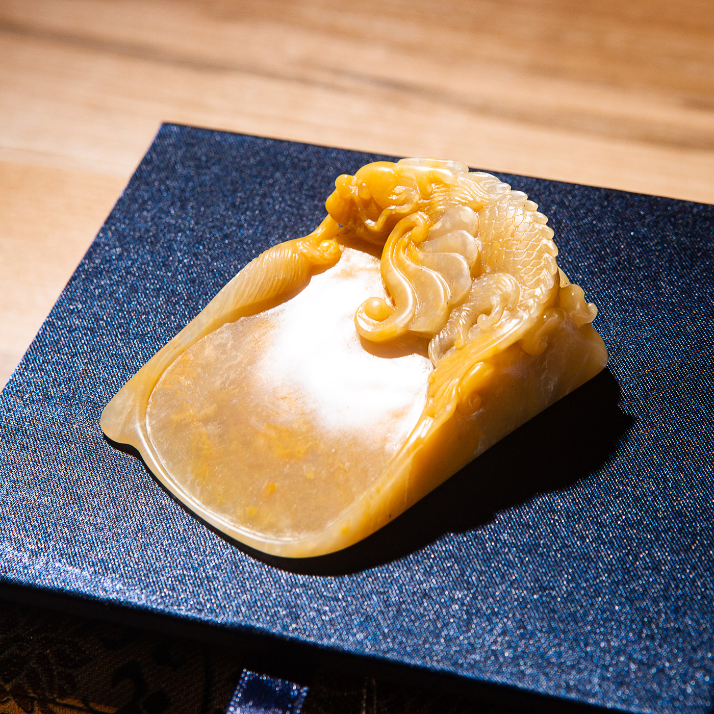 巴林福黄老料手雕“敖龙”笔舔,选料为存放几十年之老料,料质极佳。其雕工精细,题材刻画生动,极具艺术效果和实用性。