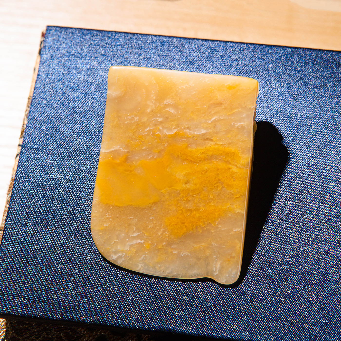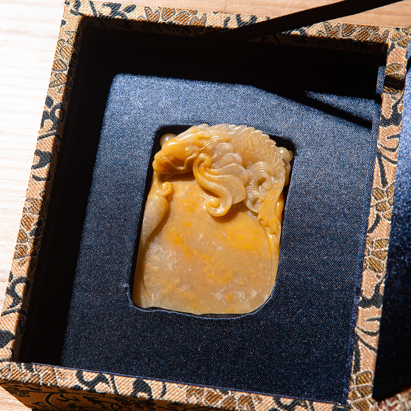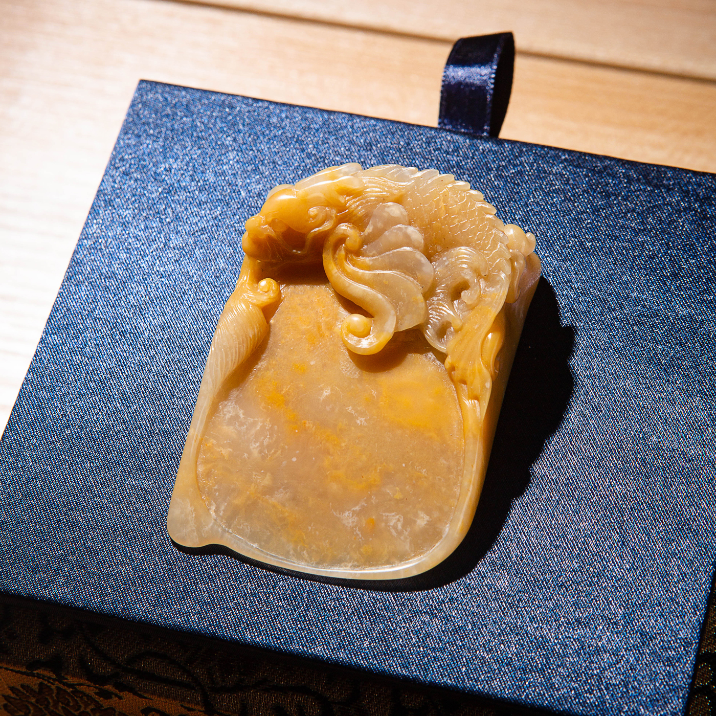 巴林福黄老料手雕“敖龙”笔舔,选料为存放几十年之老料,料质极佳。其雕工精细,题材刻画生动,极具艺术效果和实用性。