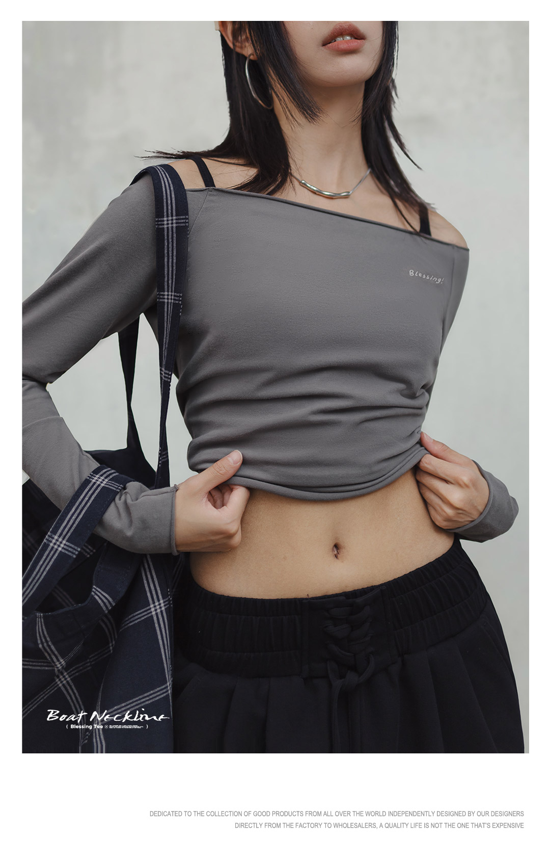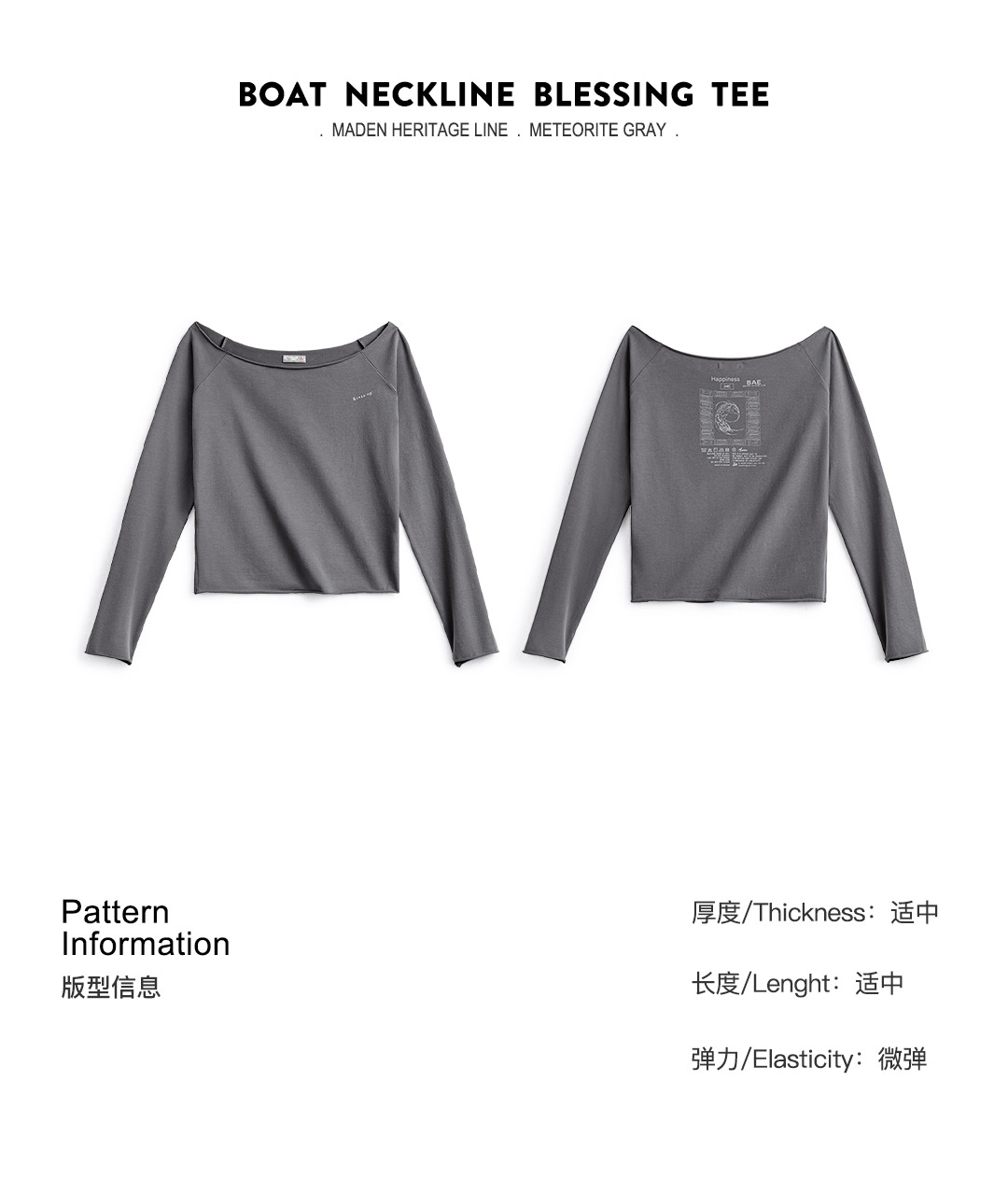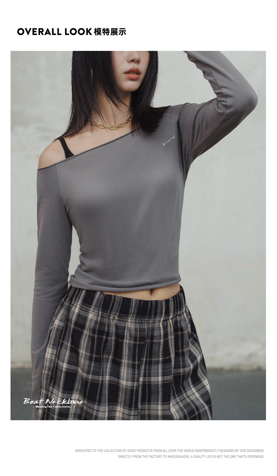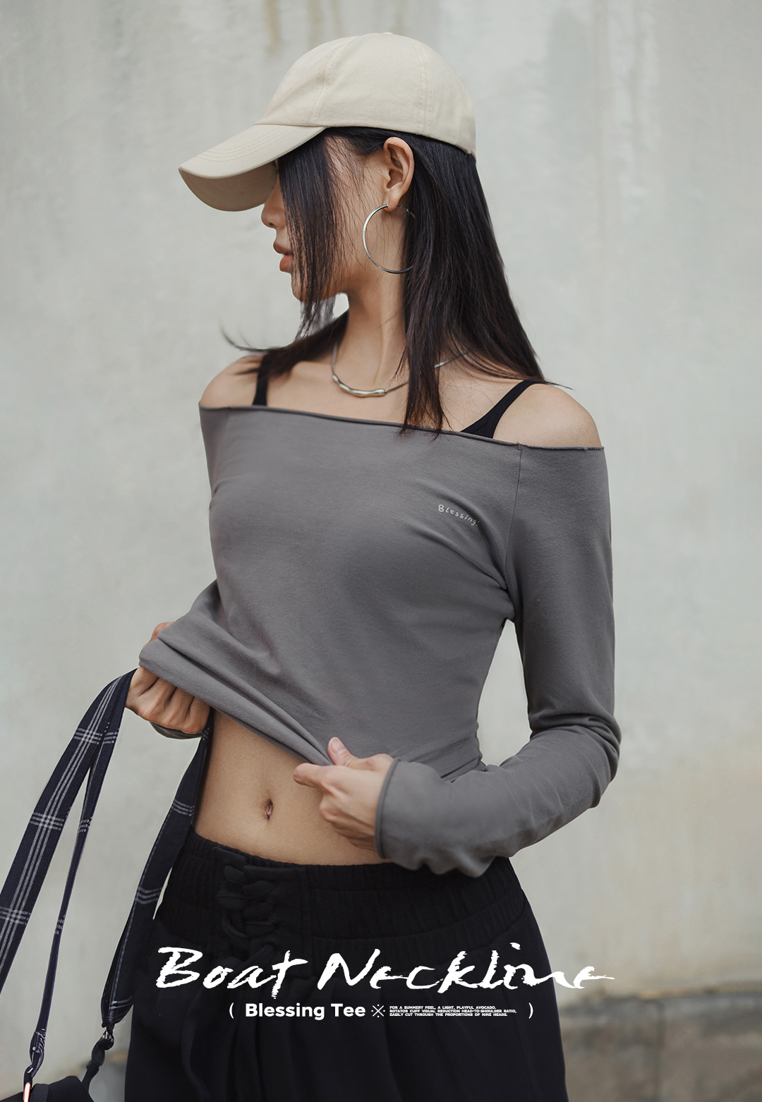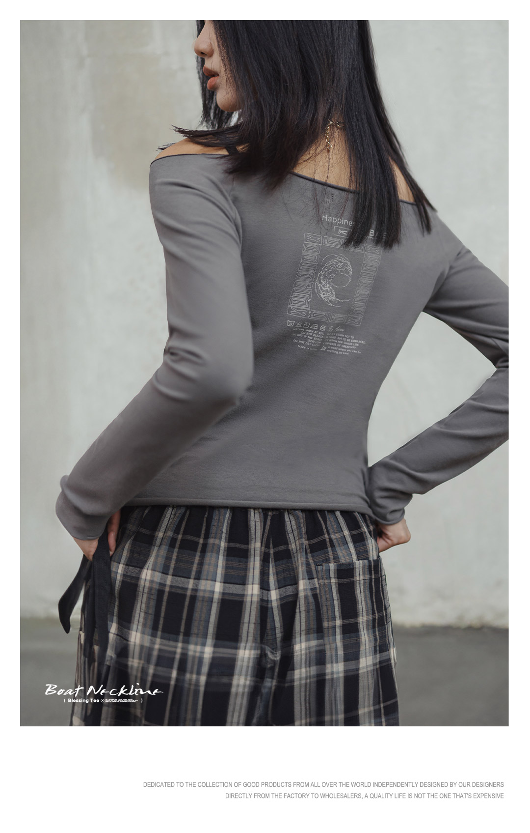 马登一字领幸运锦鲤印花长袖设计感气质t恤纯色修身显瘦打底衫春秋女