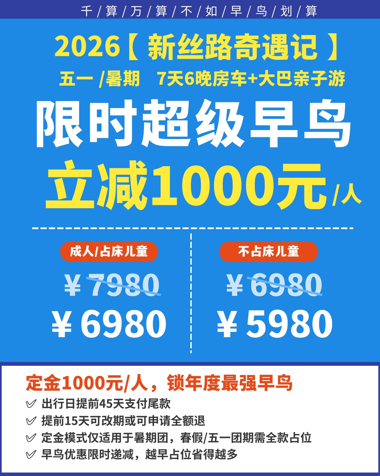 五一/暑假【定金锁首发早鸟】立减1000!家长爆赞【新丝路奇遇记】带娃必游~房车+大巴,青海湖到莫高窟,一次拿下!青海湖、茶卡盐湖、七彩丹霞、嘉峪关、莫高窟、鸣沙山…