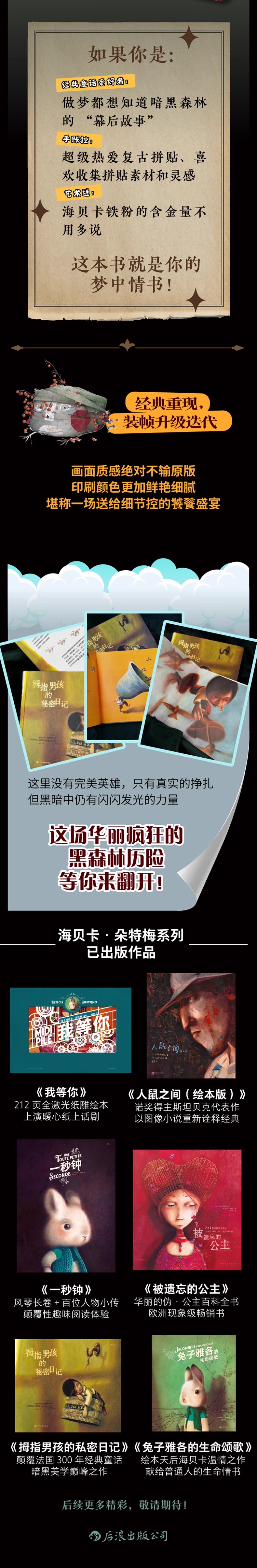 完美承载了海贝卡对《小拇指》故事阴郁迷人、哥特美学式的颠覆性诠释。这是一场献给插画爱好者的视觉盛宴。——《出版人周刊》