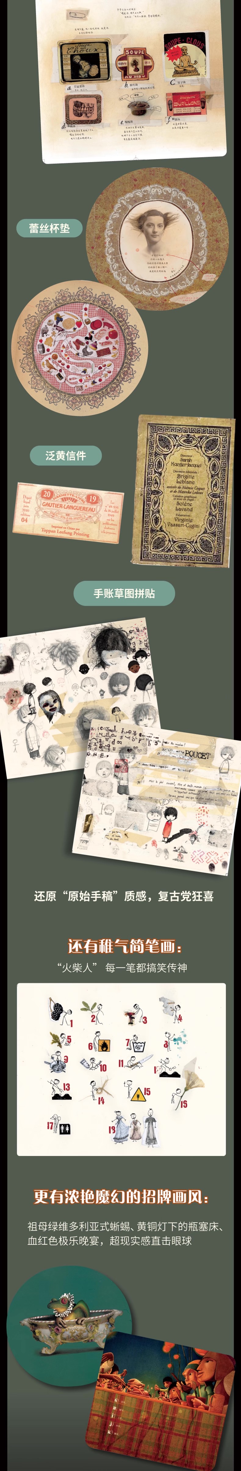 复古拼贴风格:复古爱好者狂喜!海贝卡用浓郁色彩和做旧工艺,制作上百幅拼贴图:罐头商标×蕾丝杯垫×信件档案×菜单食谱×海报照片×印章贴纸,复古味道十足,并特意保留折痕、油迹、墨点、咖啡渍、胶带印等纹路,塑造更丰富的画面层次的同时,质感加倍真实,如同入手作者原始手稿。