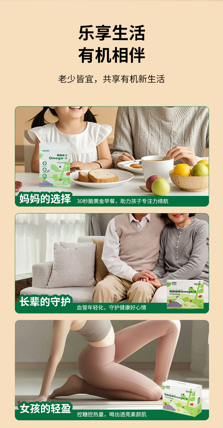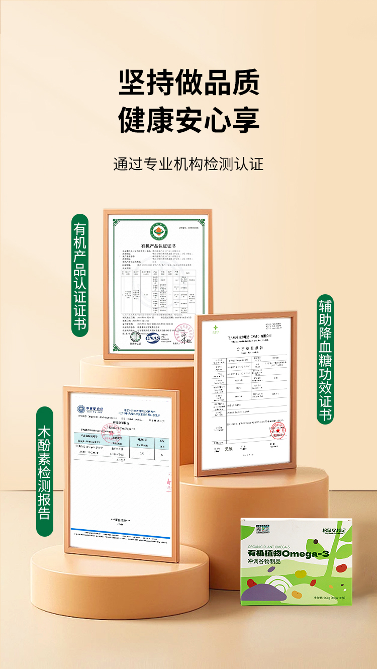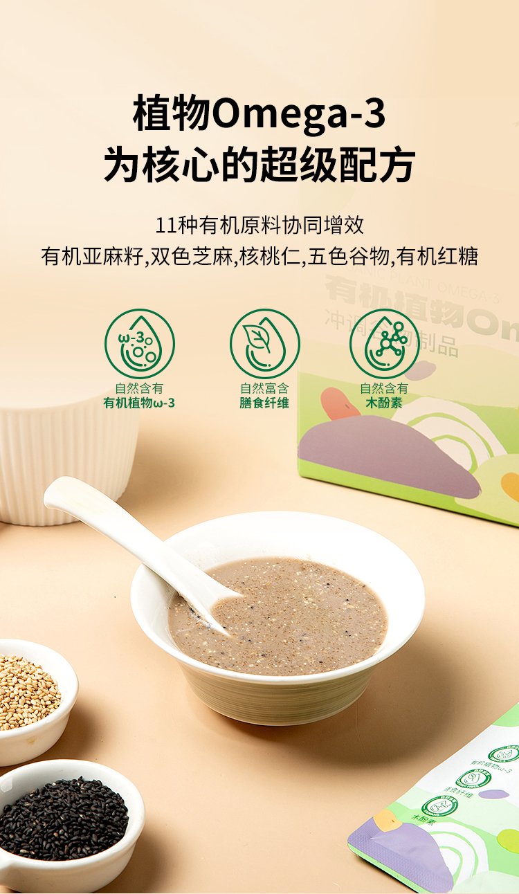 有机植物Omega-3冲调谷物制品,口感醇厚浓郁,满满谷物天然香气,11种有机天然食材,从种子到餐桌全程透明