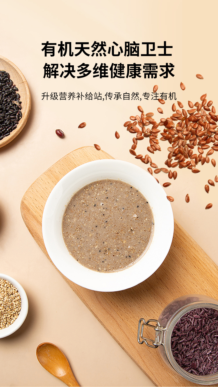 配料:有机亚麻籽、有机黑芝麻、有机白芝麻、有机核桃仁、有机黑米、有机红小豆、有机黑豆、有机红米、有机黑小米、有机紫米、有机红糖粉