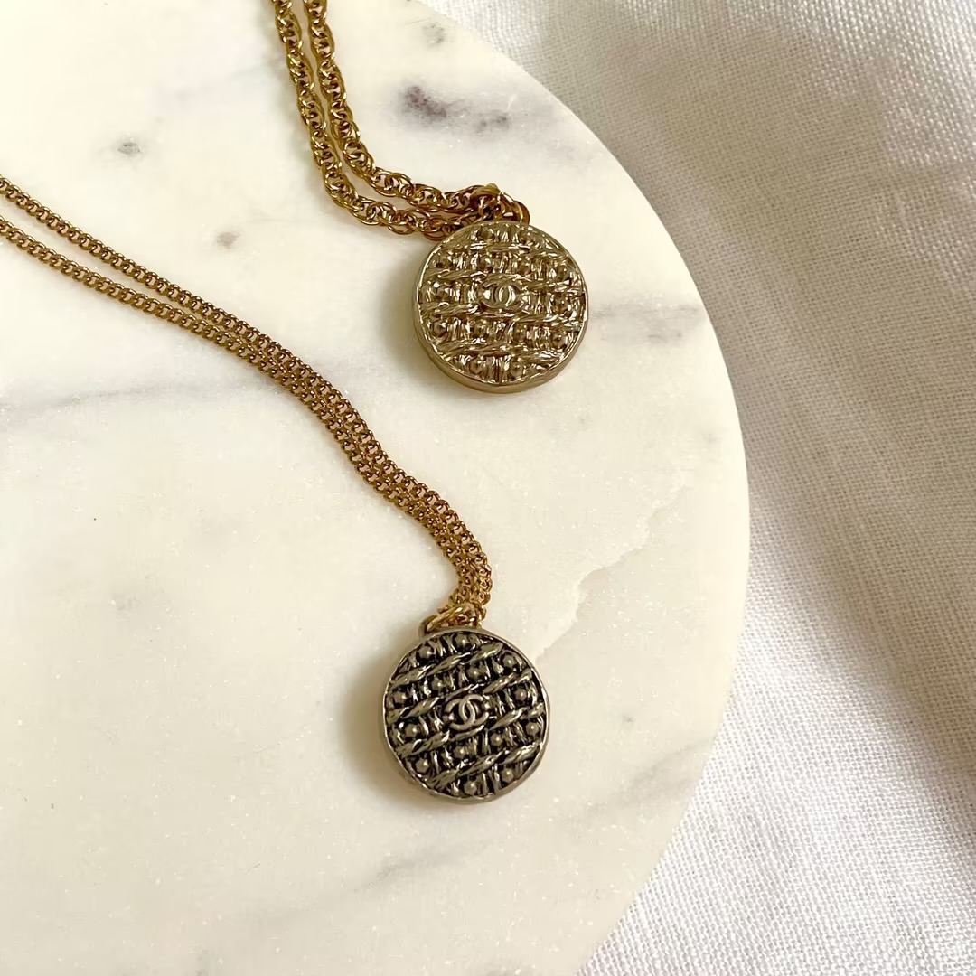 北京仓|Gigi Paris-Tweed 双C Logo-银灰色 Vintage纽扣 项链[法国设计师]