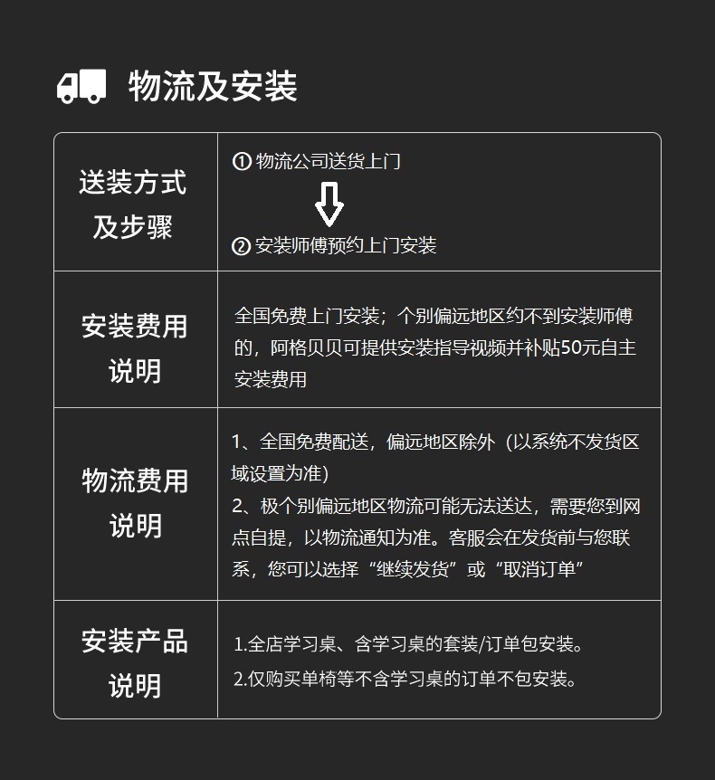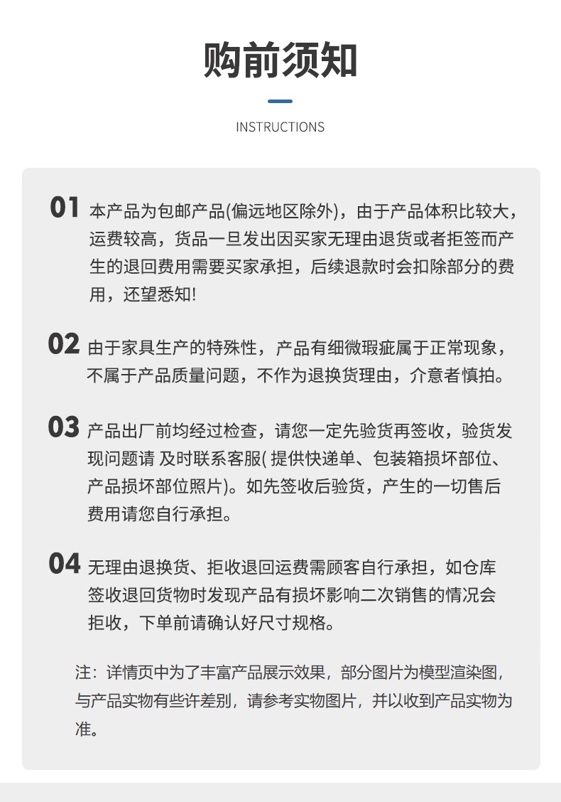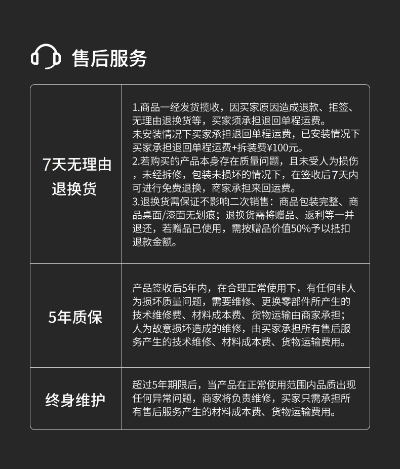 (1)商品一经发货揽收,因买家原因造成退款、拒签、 无理由退换货等,买家须承担退回单程运费。未安装情况下买家承担退回单程运费,已安装情况下 买家承担退回单程运费+拆装费¥100元。退换货需保证不影响二次销售:商品包装完整、商 品桌面/漆面无划痕;退换货需将赠品、返利等一并 退还,若赠品已使用,需按赠品价值50%予以抵扣 退款金额。