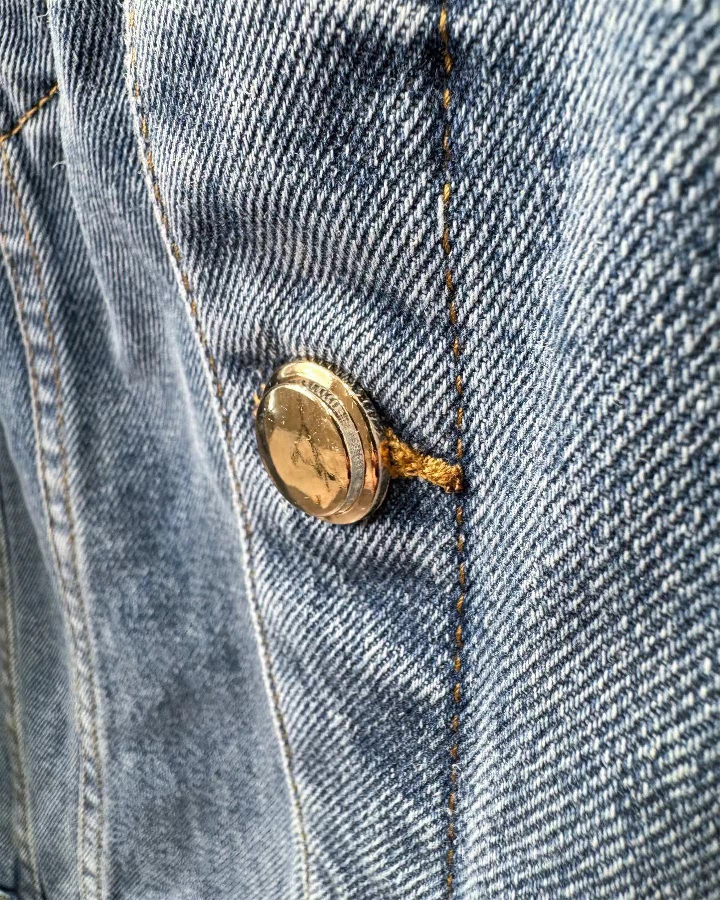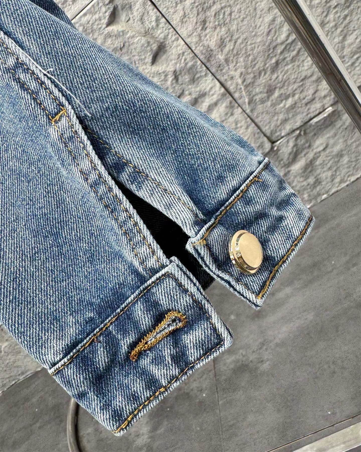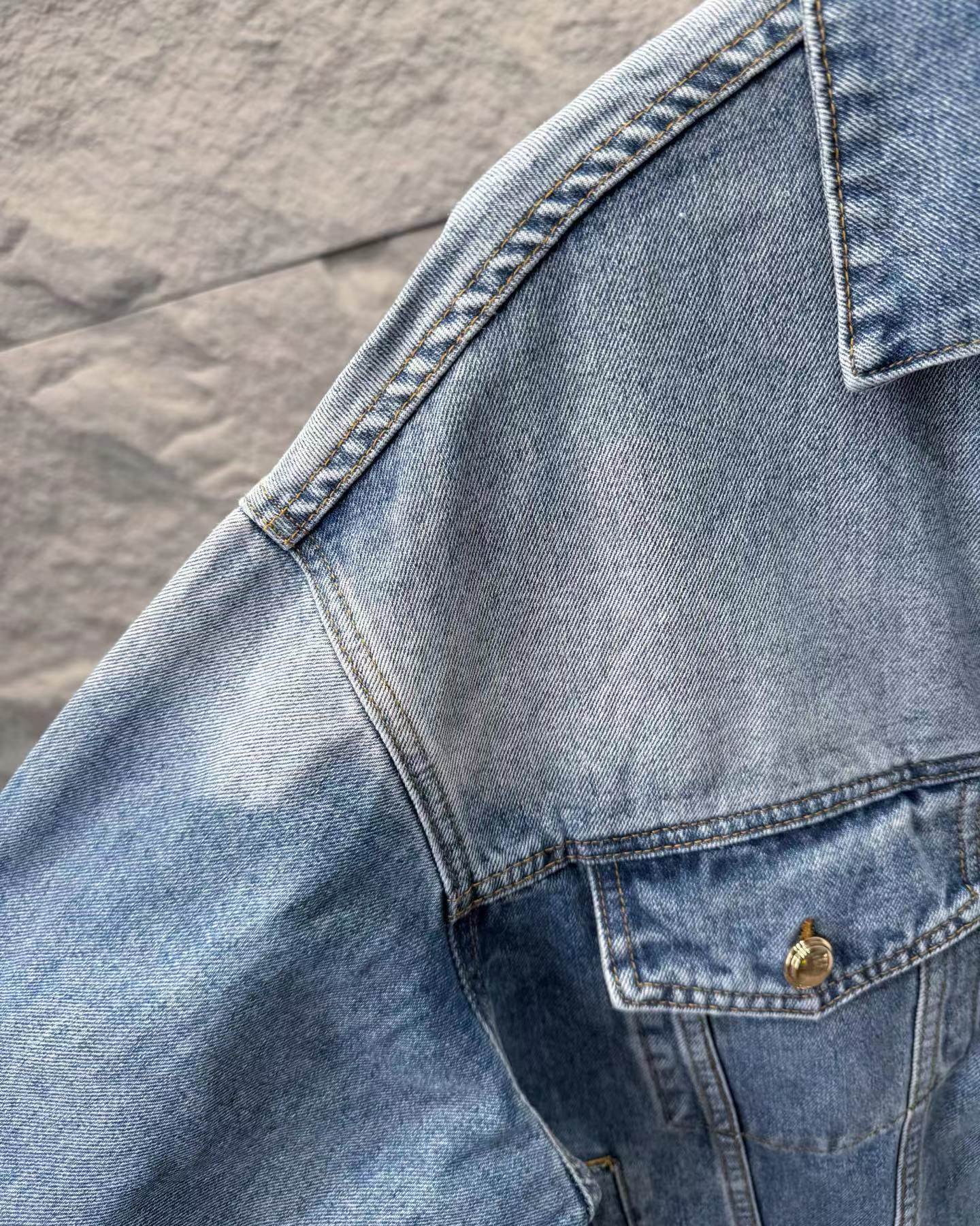 字母贴布绣拼色牛仔夹克外套!来自水洗蓝牛仔外套!在复古水洗中保留了 清新元素的色彩感 背后的皮标真是这款设计的点缀啊!水洗牛仔还是挺在意纹路的衔接感 自然的渐变!对于这款的评价 真是被淡蓝的水洗色吸引!版型属于微宽松效果 内搭一件短T恤 巨好看!面料采用100纯棉斜纹丹宁材质 高密度器械制造 原胚底不含氨纶几乎无弹 传达牛仔单品本身的拙朴质感 赛络纺面料 成衣还要经过水洗脱浆后才可后道进行锁眼 全件磨边效果 酵石磨多位磨破 通过洗水及砂石打磨 形成做旧质感 色泽过度自然
