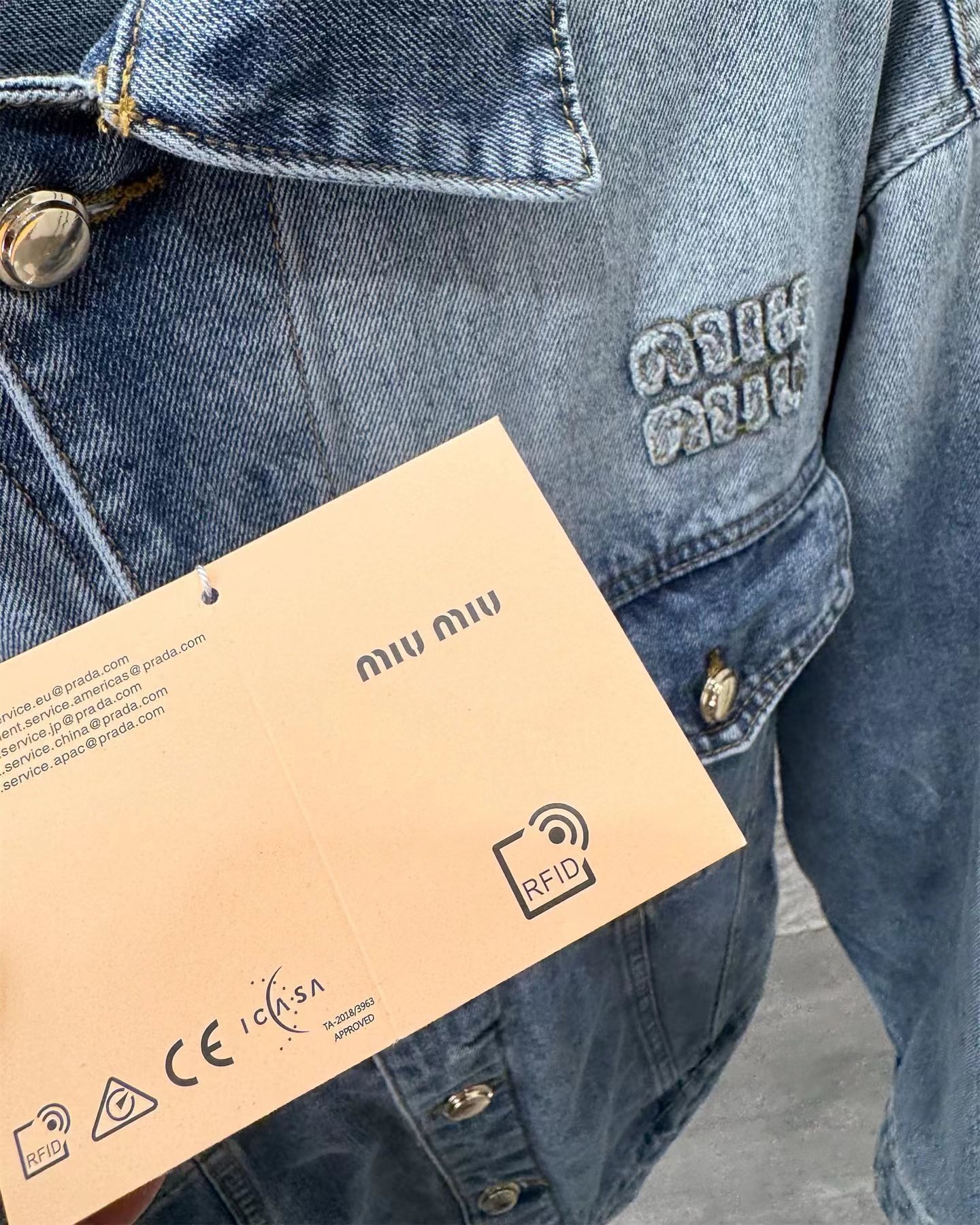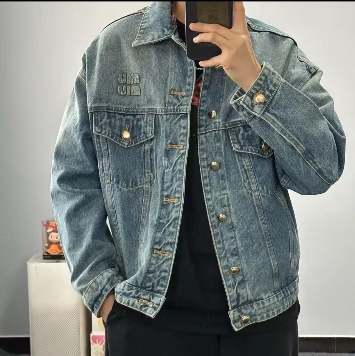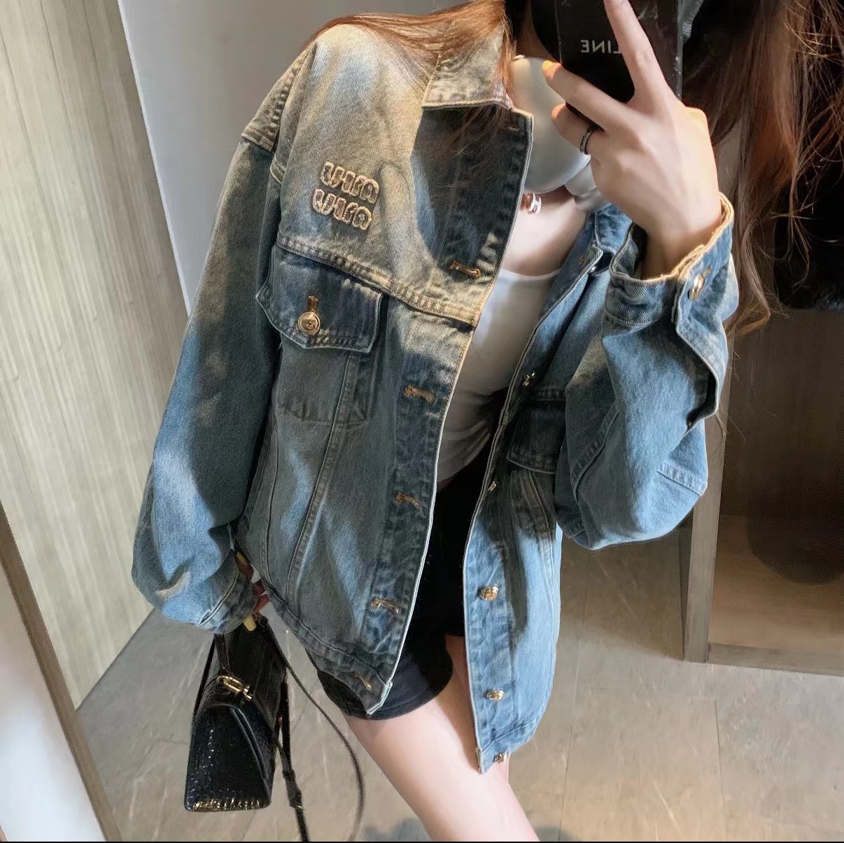 字母贴布绣拼色牛仔夹克外套!来自水洗蓝牛仔外套!在复古水洗中保留了 清新元素的色彩感 背后的皮标真是这款设计的点缀啊!水洗牛仔还是挺在意纹路的衔接感 自然的渐变!对于这款的评价 真是被淡蓝的水洗色吸引!版型属于微宽松效果 内搭一件短T恤 巨好看!面料采用100纯棉斜纹丹宁材质 高密度器械制造 原胚底不含氨纶几乎无弹 传达牛仔单品本身的拙朴质感 赛络纺面料 成衣还要经过水洗脱浆后才可后道进行锁眼 全件磨边效果 酵石磨多位磨破 通过洗水及砂石打磨 形成做旧质感 色泽过度自然