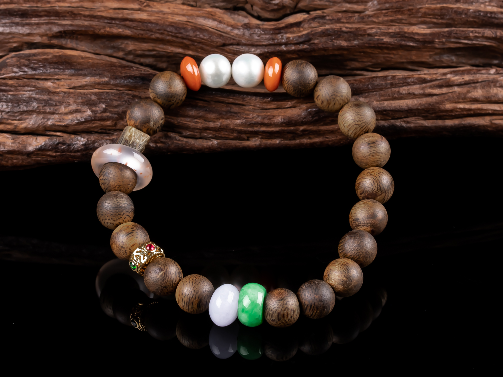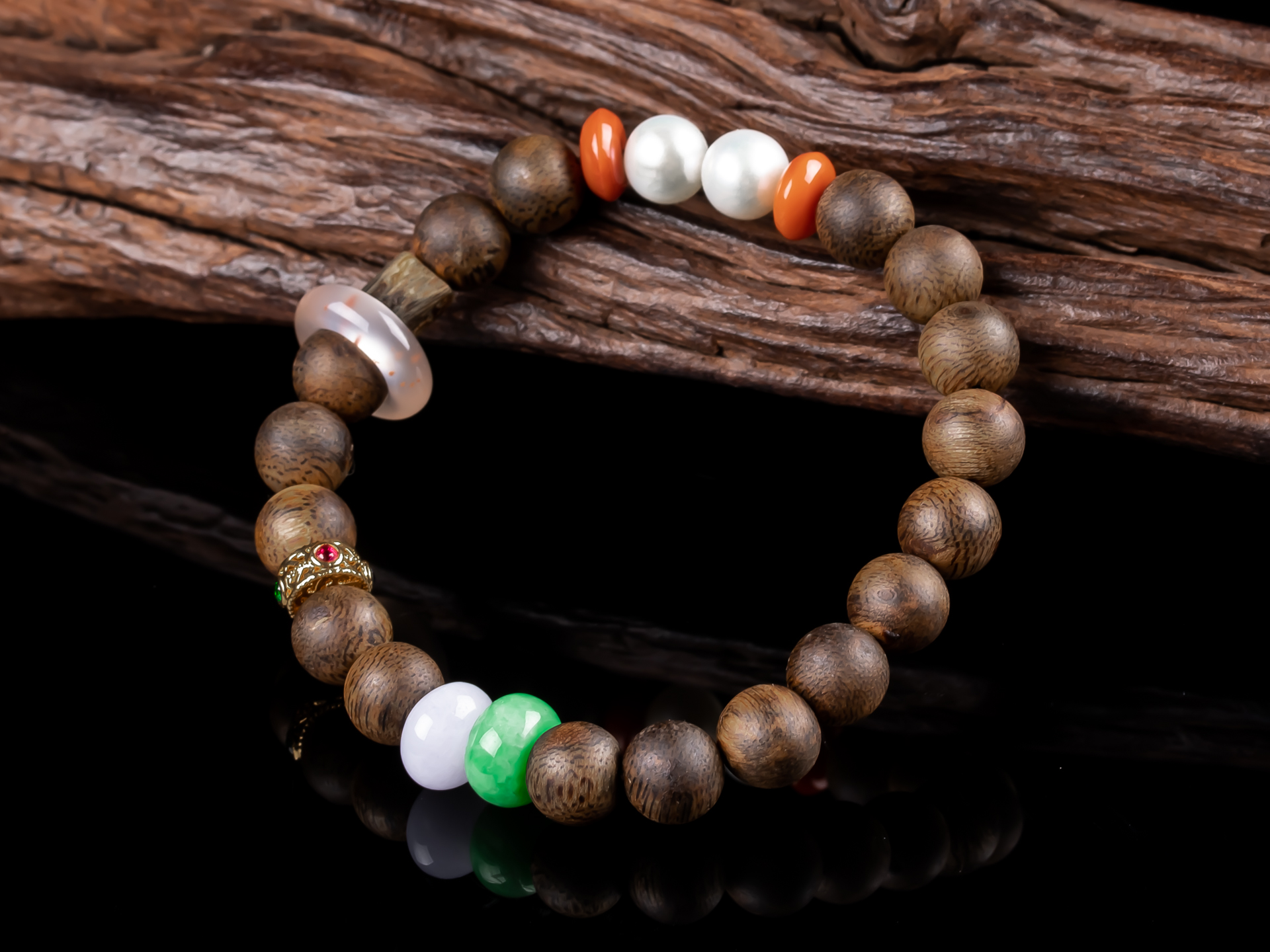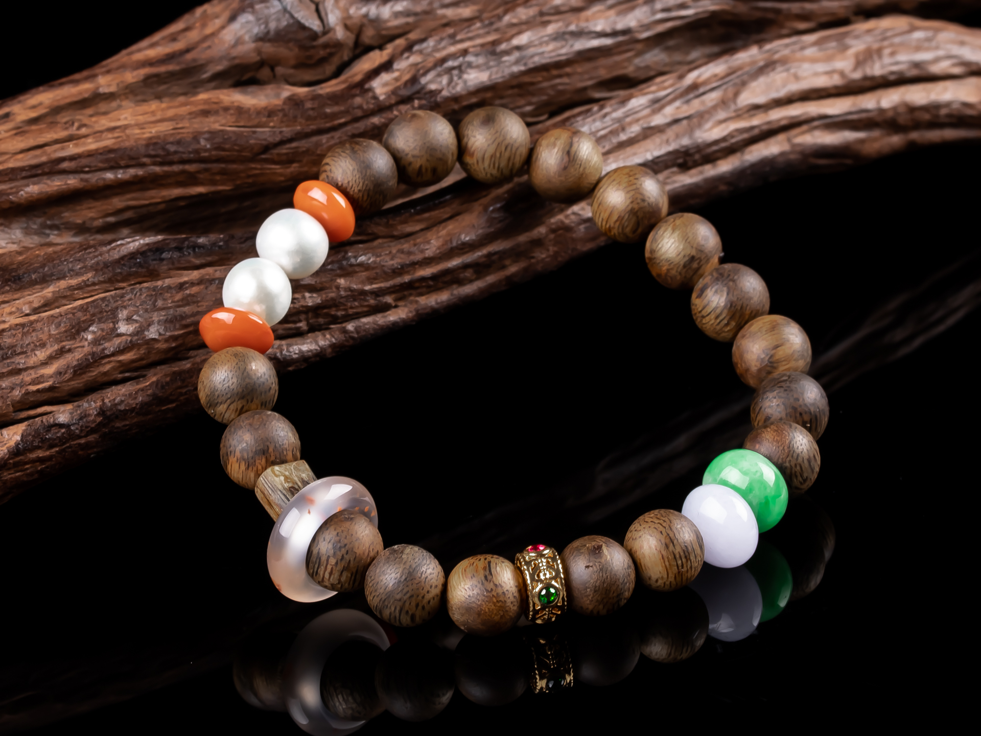 原创沉香DIY翡翠珍珠手串天然沉香珠子,珠子约8.5mm,手围15,原色原味,香味清甜自然,搭18K金隔片,翡翠珠子色泽靓丽+冰飘南红跑环-时来运转,搭配两颗珍珠,款式古朴素雅又不失时尚感,佩戴腕间尽显雅致。💰600