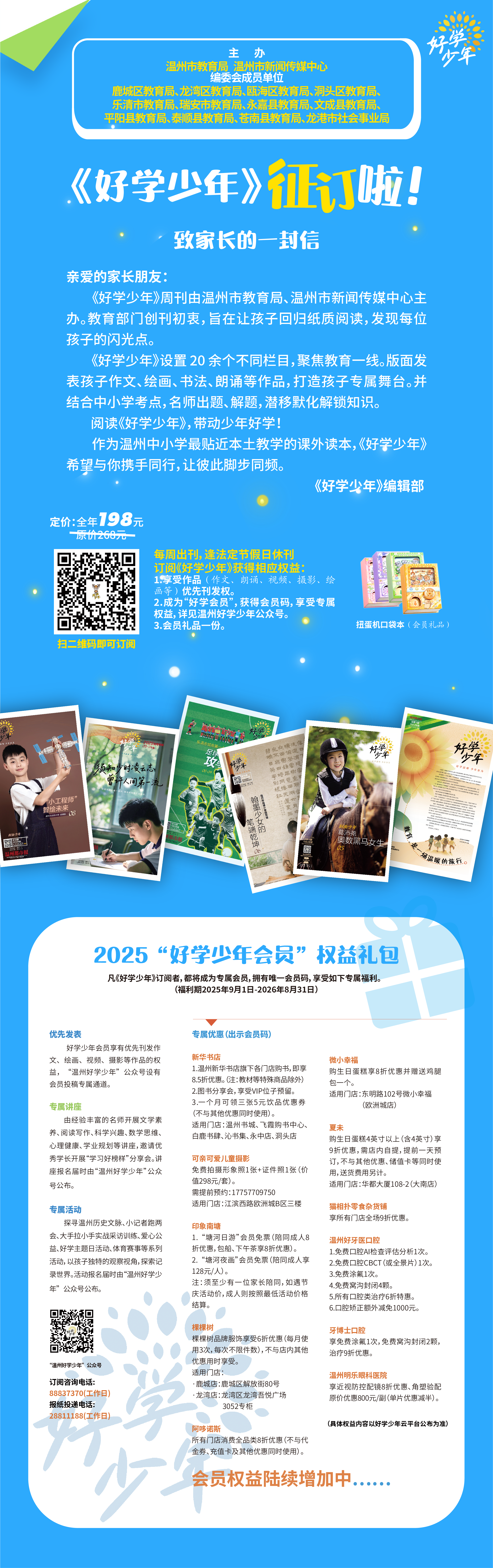 《好学少年周刊》为本周四前征订下周开始投递的即订即送报纸,如遇到未收到报纸,请联系0577-28811188。