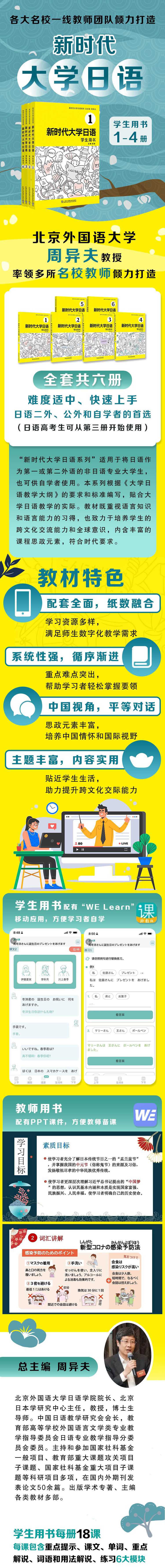"新时代大学日语系列"是大学日语教材,面向将日语作为或第二外语的非日语专业大学生。本系列根据《大学日语教学大纲》的要求和标准编写,贴合大学日语教学的实际。教材既重视语言知识和语言能力的习得,也致力于培养学生的跨文化交流能力和全球意识,内含丰富的课程思政元素,符合时代要求。