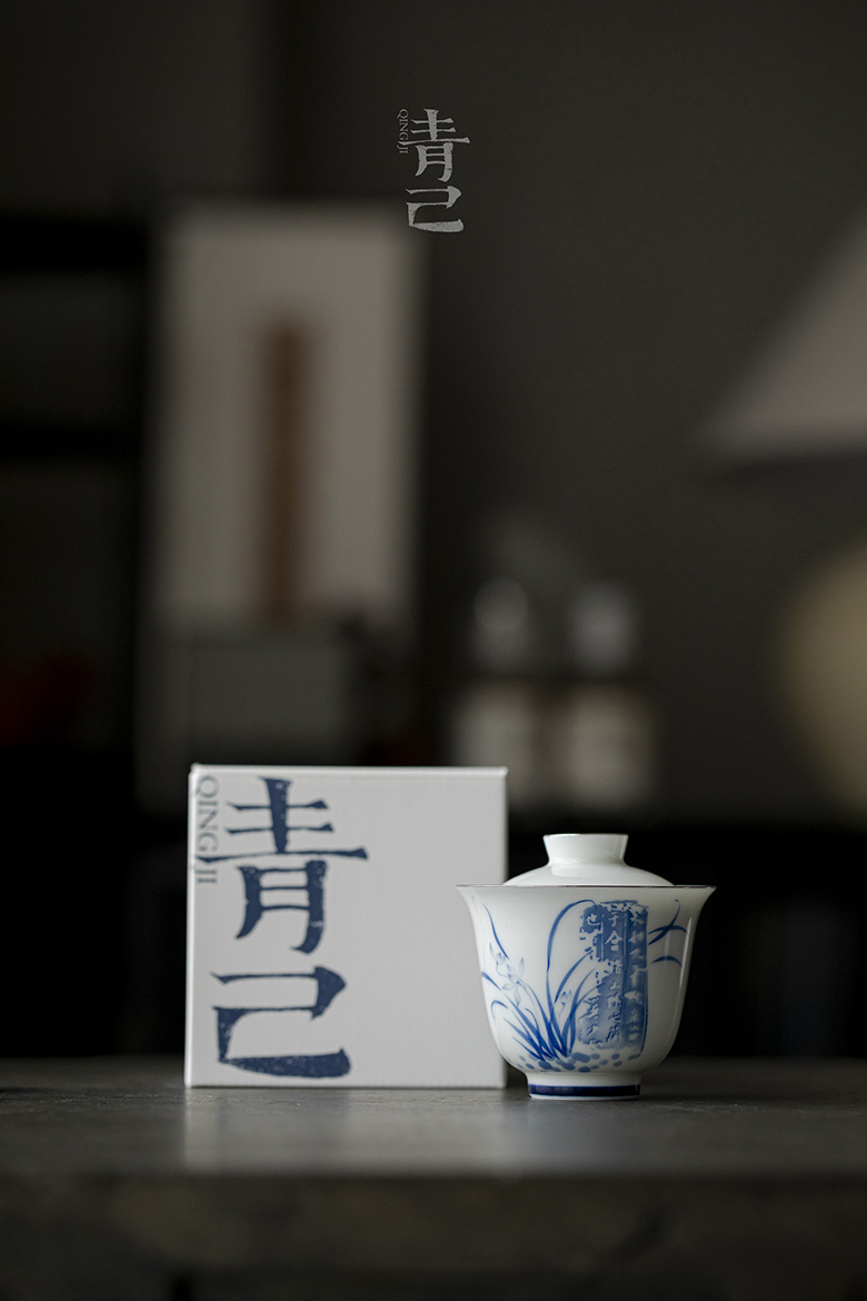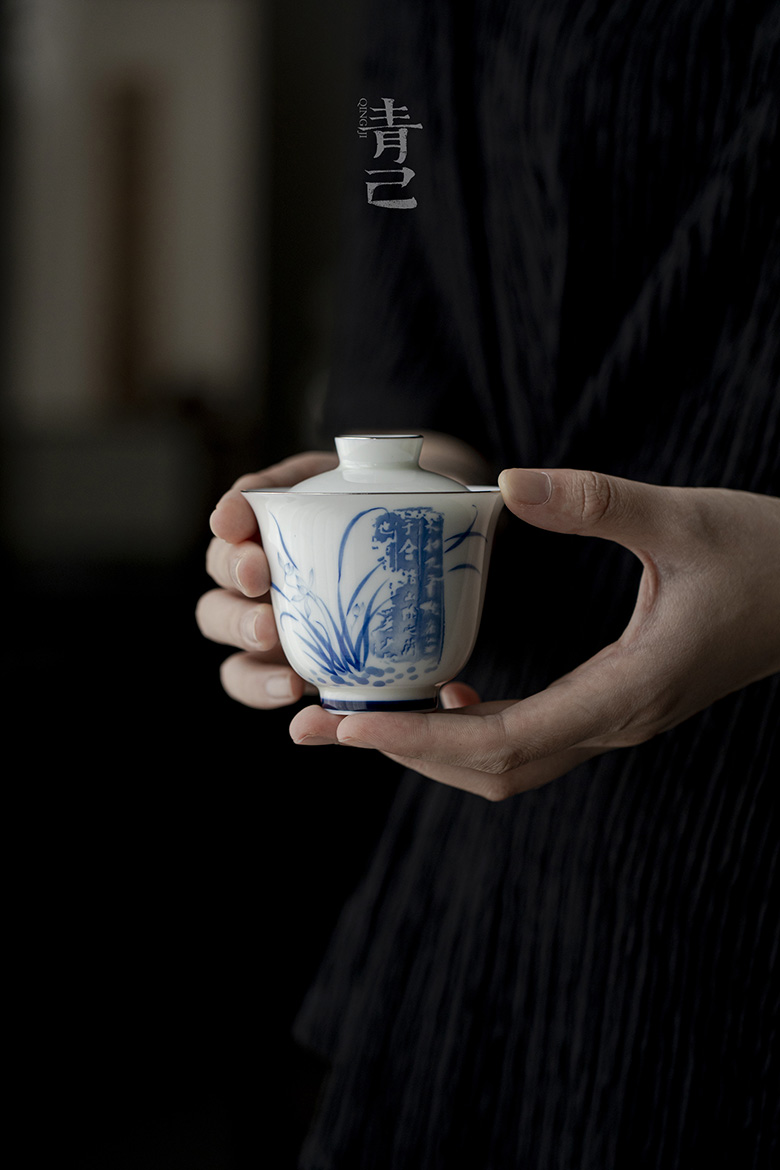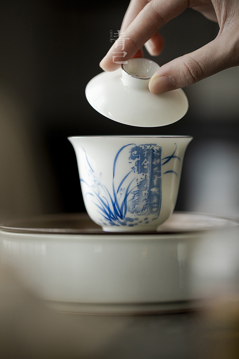 永利汇二十四器玉瓷盖碗青花手绘釉下彩白瓷茶具泡茶家用拓印兰亭序碗