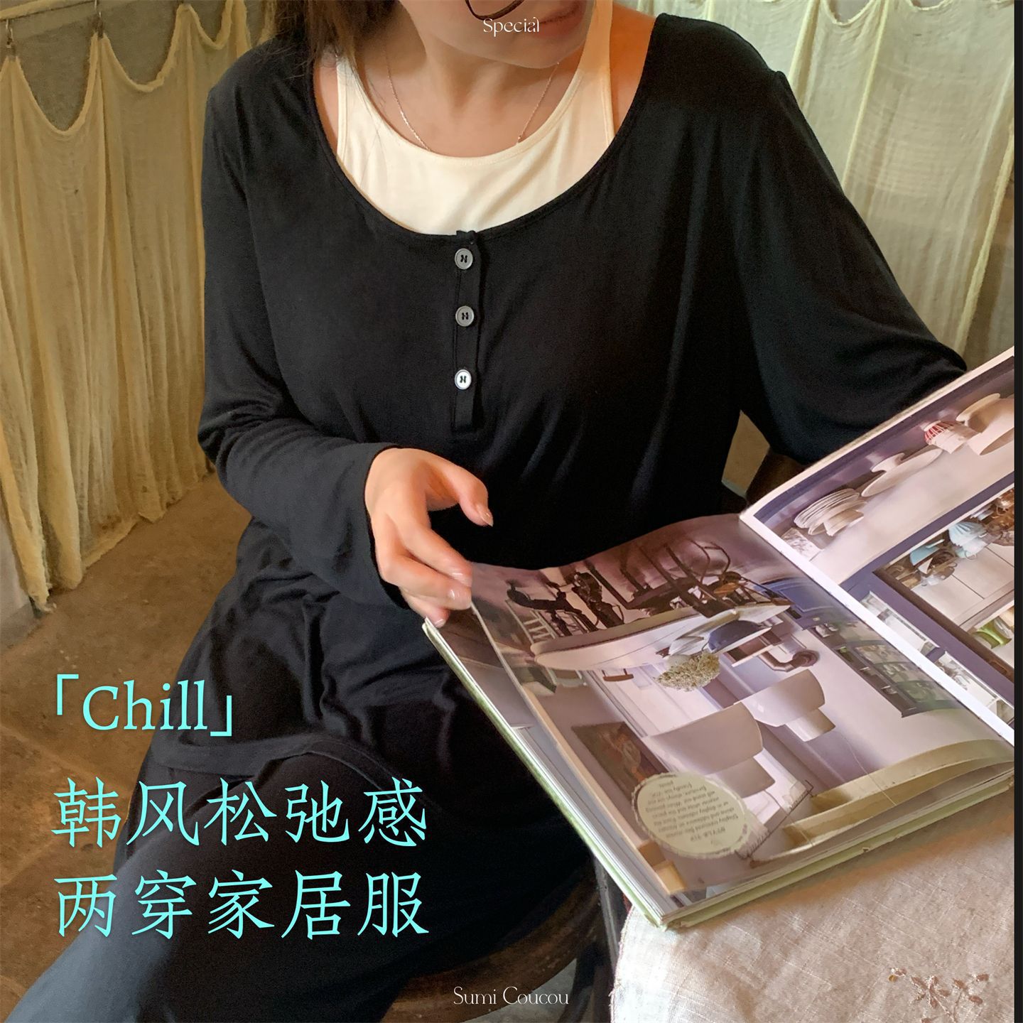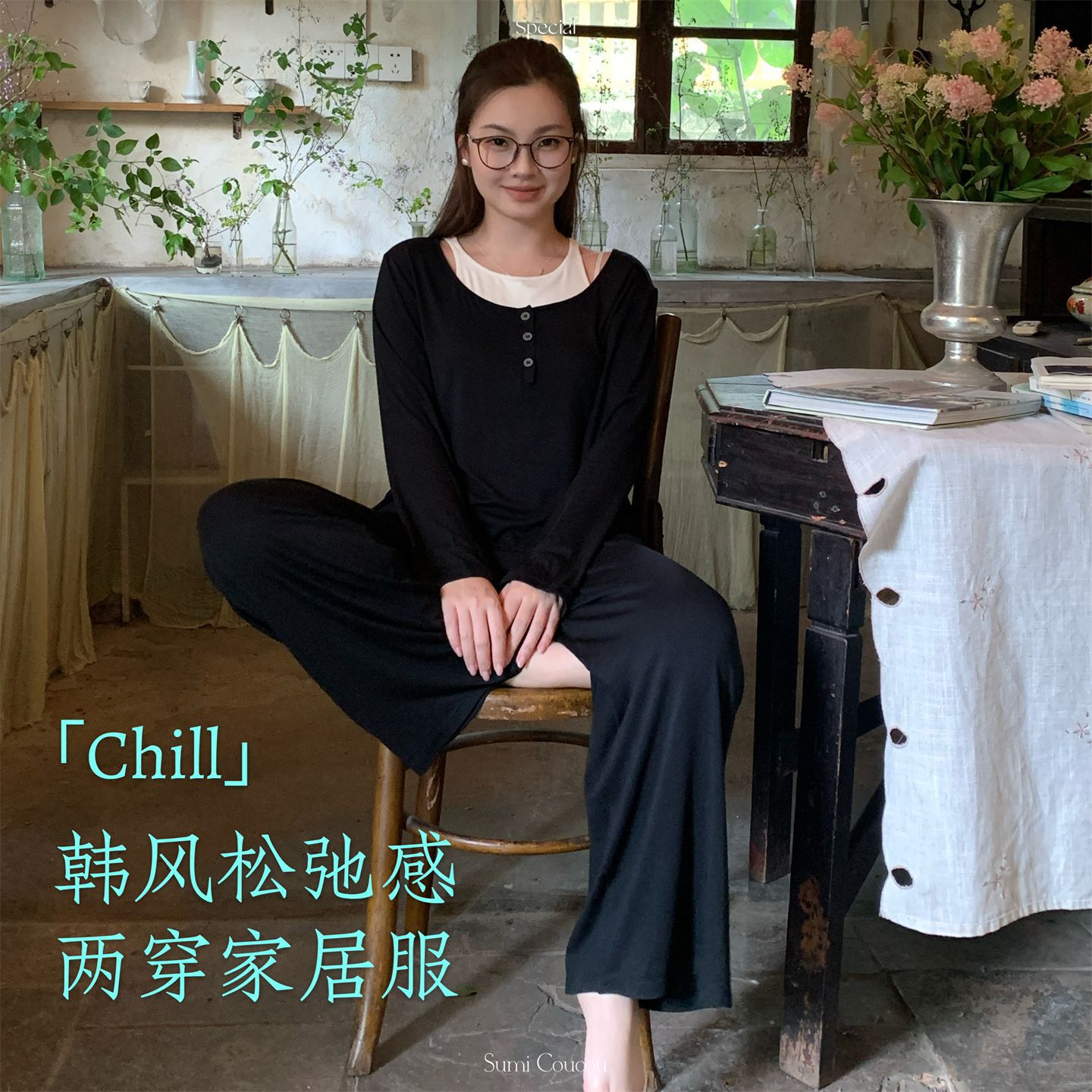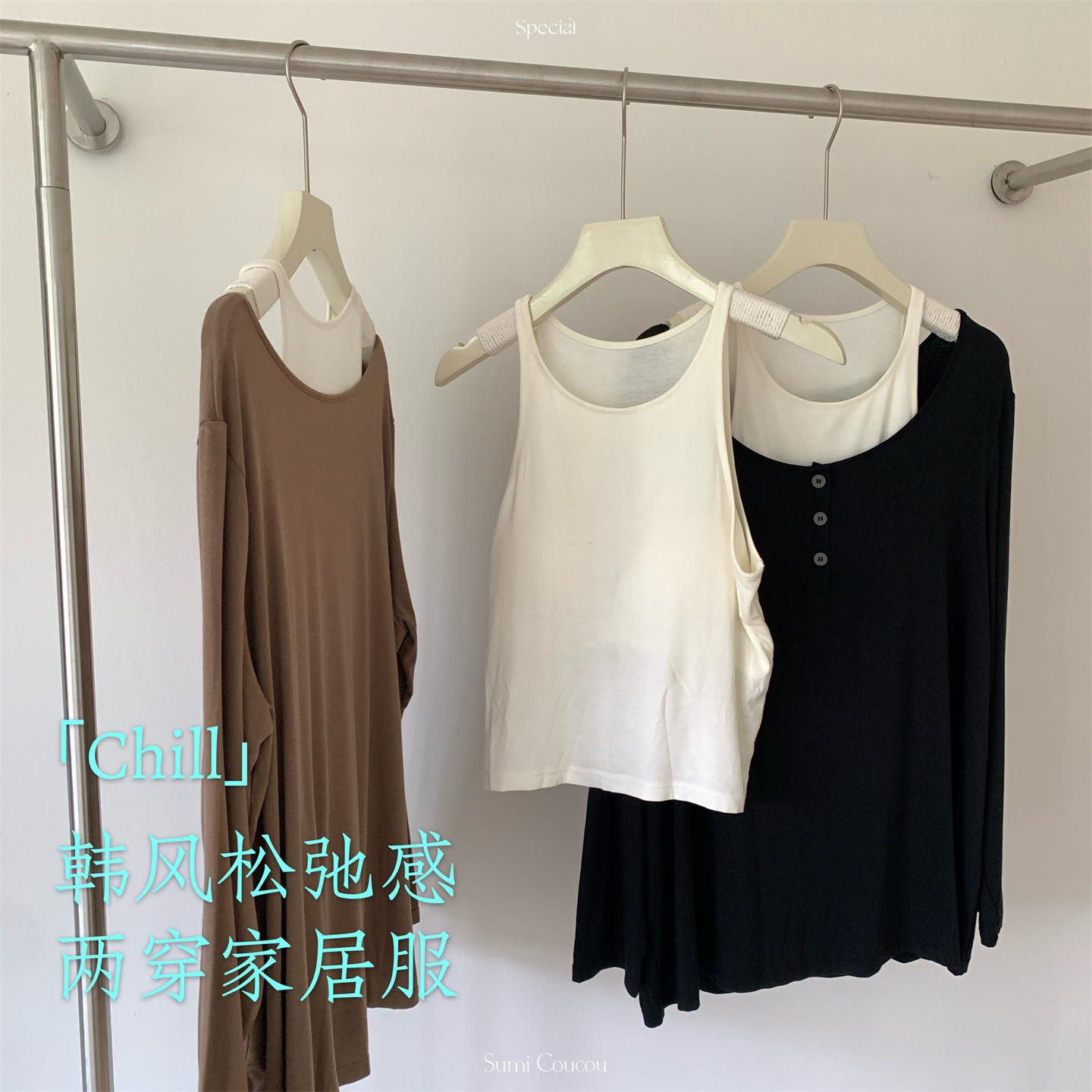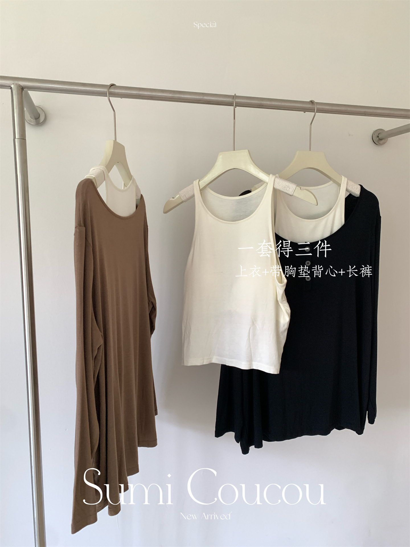韩风松弛感~可外穿保暖细羊毛家居服三件套 带胸垫背心+长袖+长裤韩系新款睡衣休闲套装