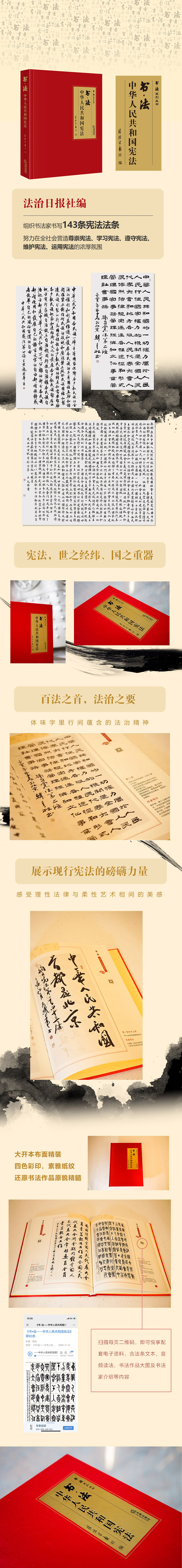 《中华人民共和国宪法》是我国的根本法,是治国安邦的总章程,是党领导国家事业发展的根本法治保障,具有*高的法律地位、法律权威、法律效力。宪法确立了我国的根本制度和根本任务,规定了我国公民的基本权利和义务,是全面依法治国的总依据。《书·法 中华人民共和国宪法》由法治日报社编,通过组织书法家书写143条宪法法条,努力在全社会营造尊崇宪法、学习宪法、遵守宪法、维护宪法、运用宪法的浓厚氛围,旨在引领和推动更多的人拿起笔来写法、学法,推动更多人成为弘扬法治精神、传播法治文化的支持者和参与者,使书写法律成为社会公众学习法律的有益方式,努力使尊法学法守法用法在全社会蔚然成风。