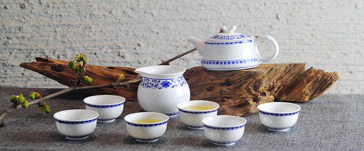 景德镇 国瓷红叶 8头手绘青花玲珑茶具如意富贵