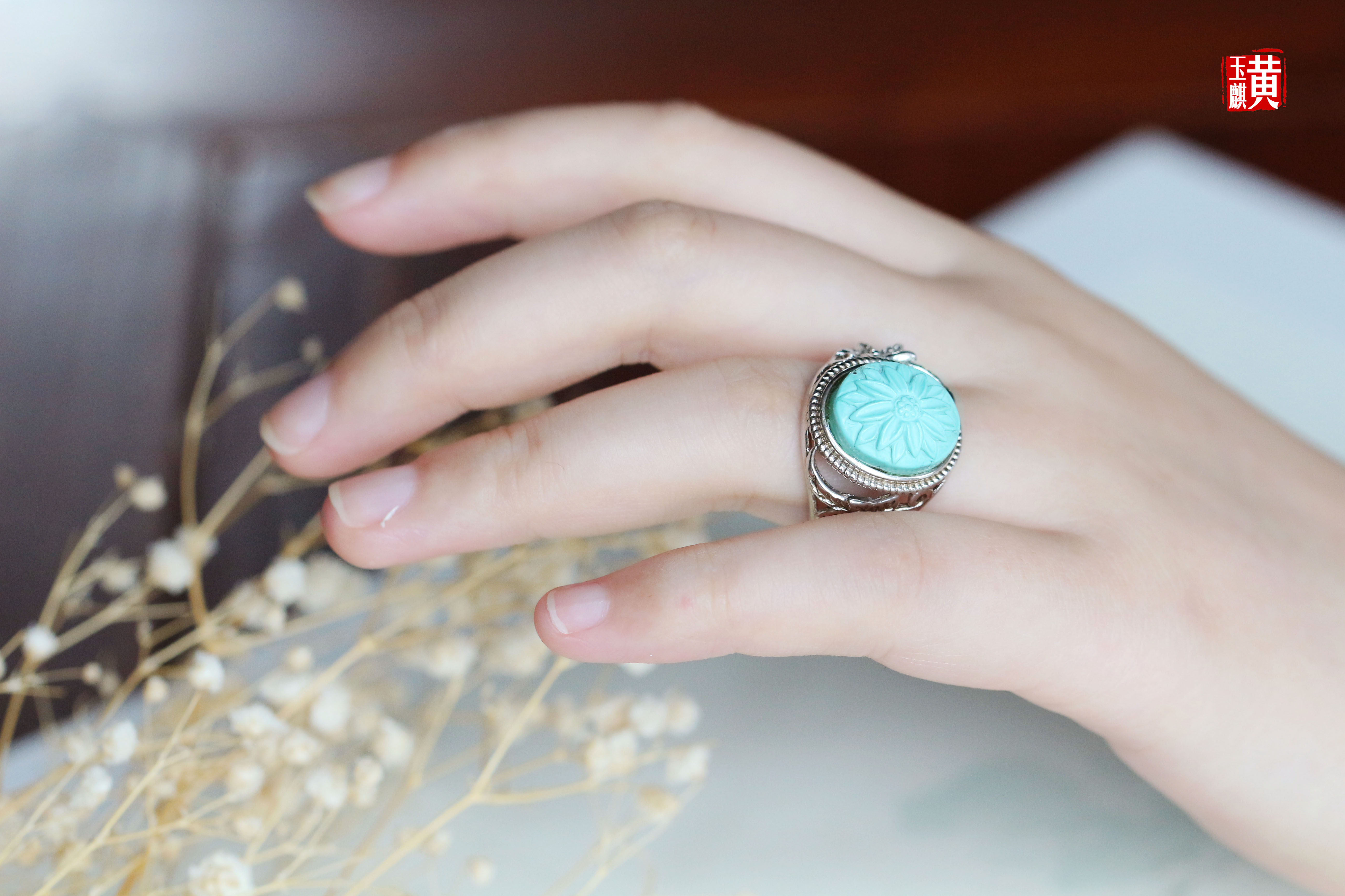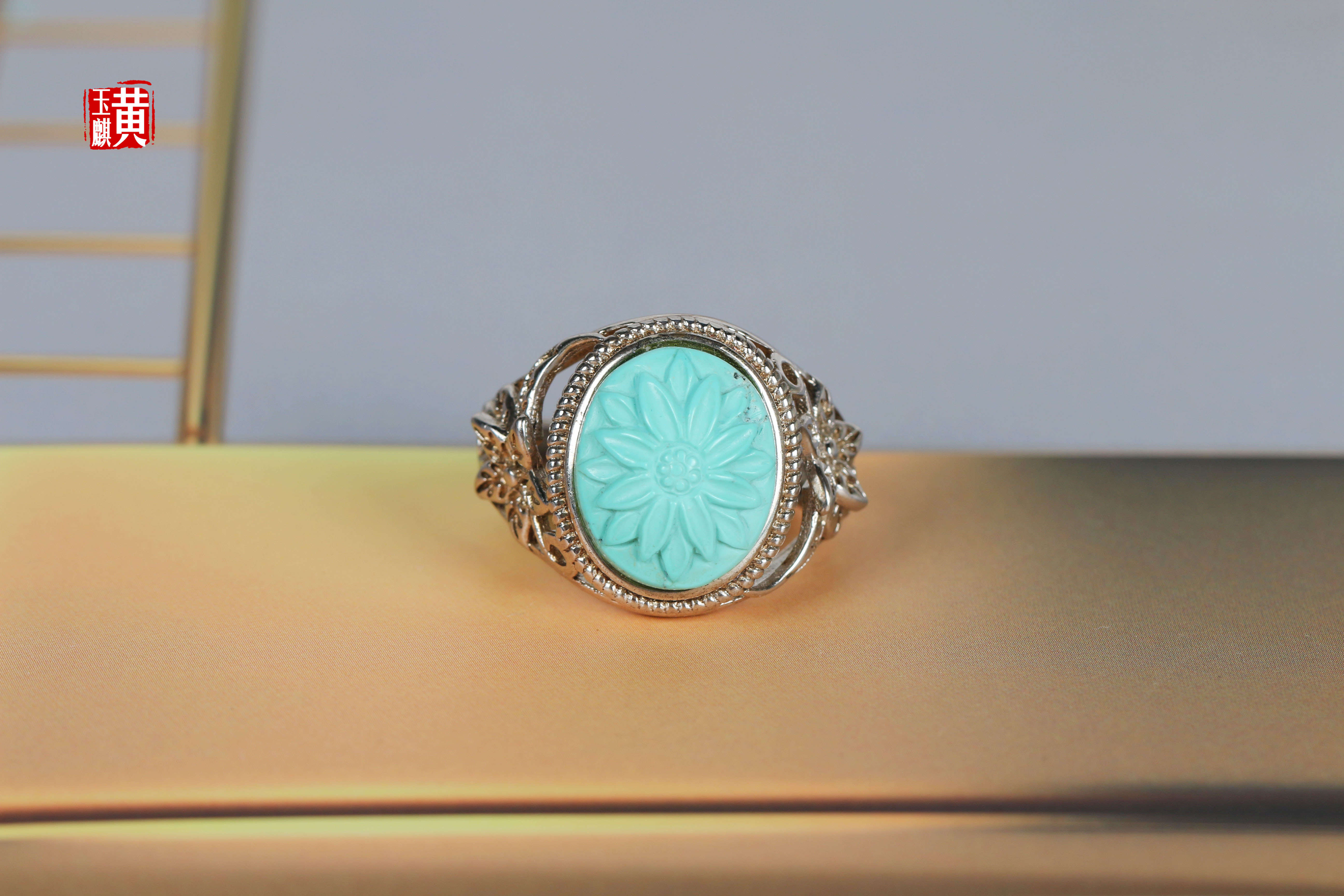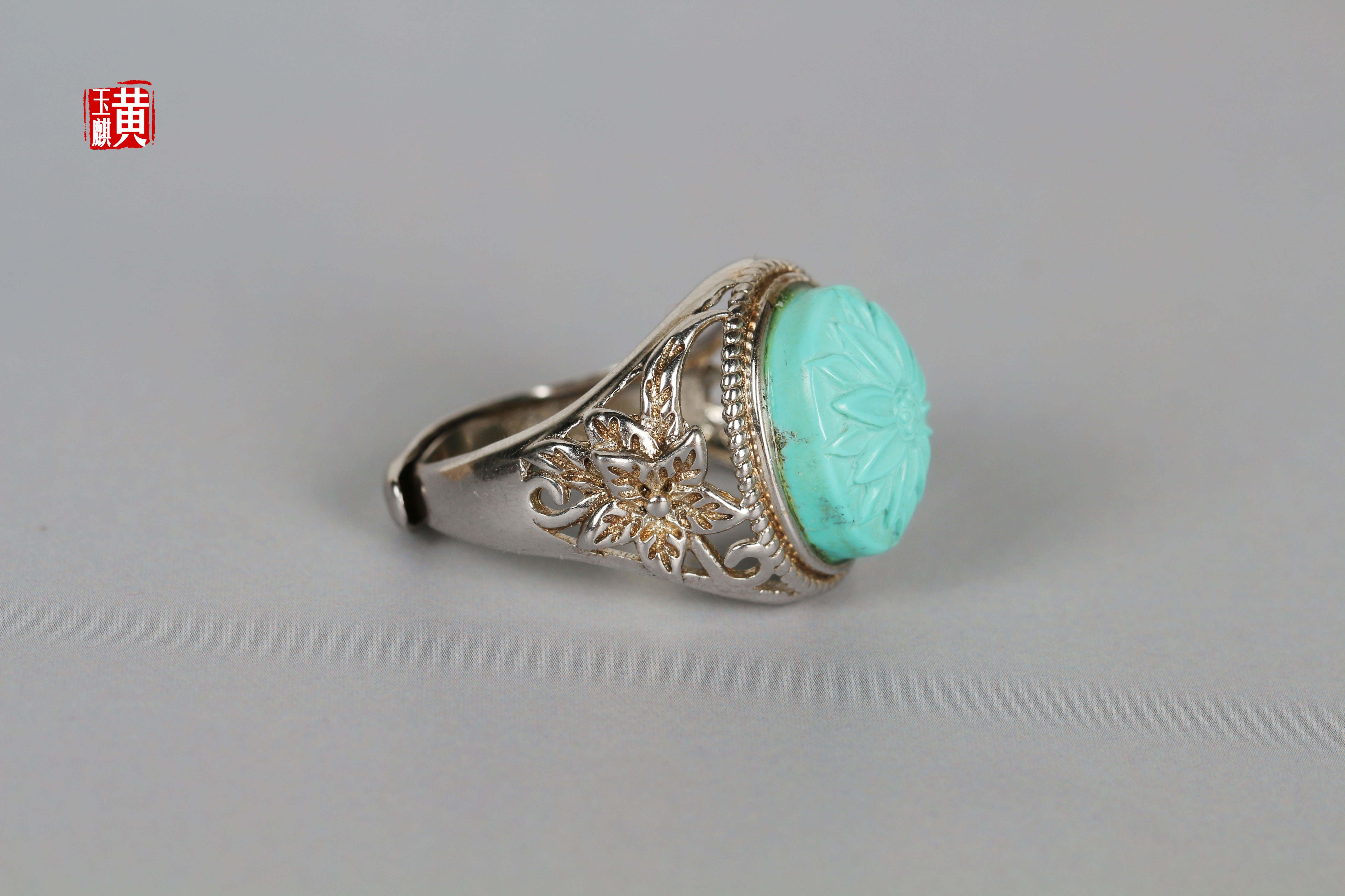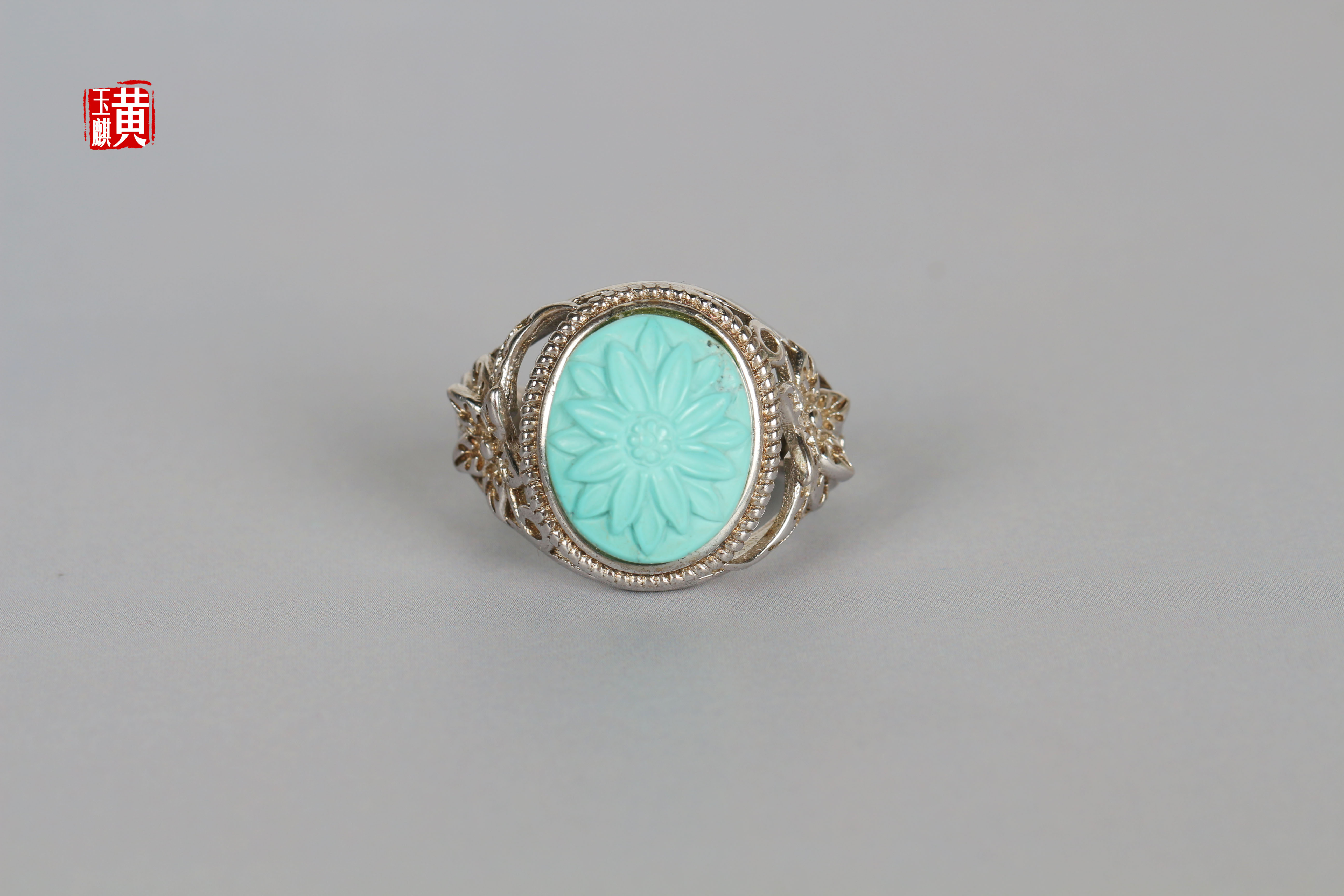 绿松戒指,蛋面饱满,高瓷,天空蓝,清新漂亮,无杂无裂,玉化程度高,浅浮雕天竺牡丹,优雅迷人,925银镶,活扣可调节,上手超美哒。
