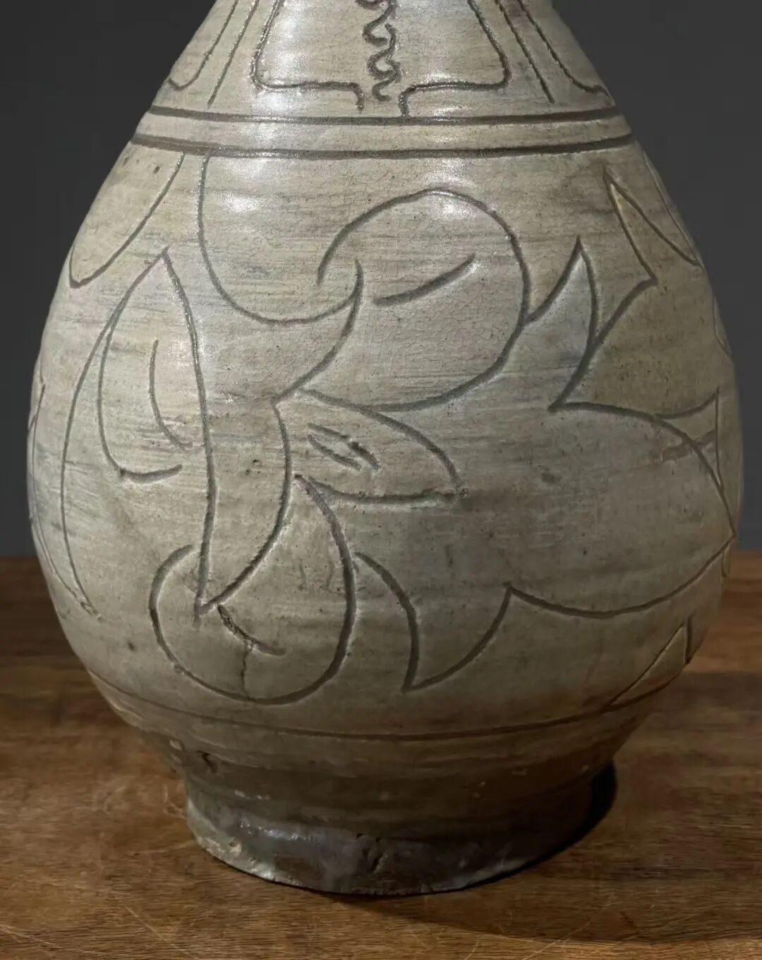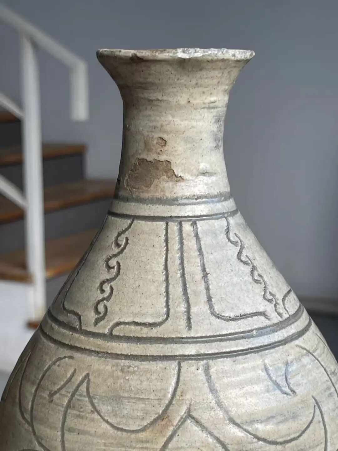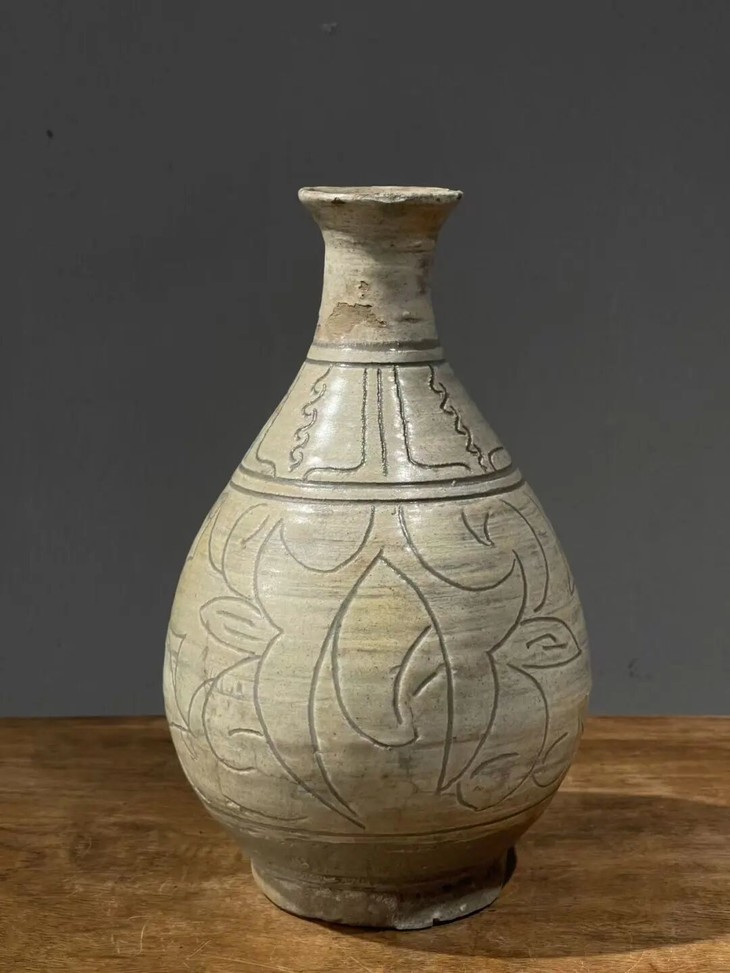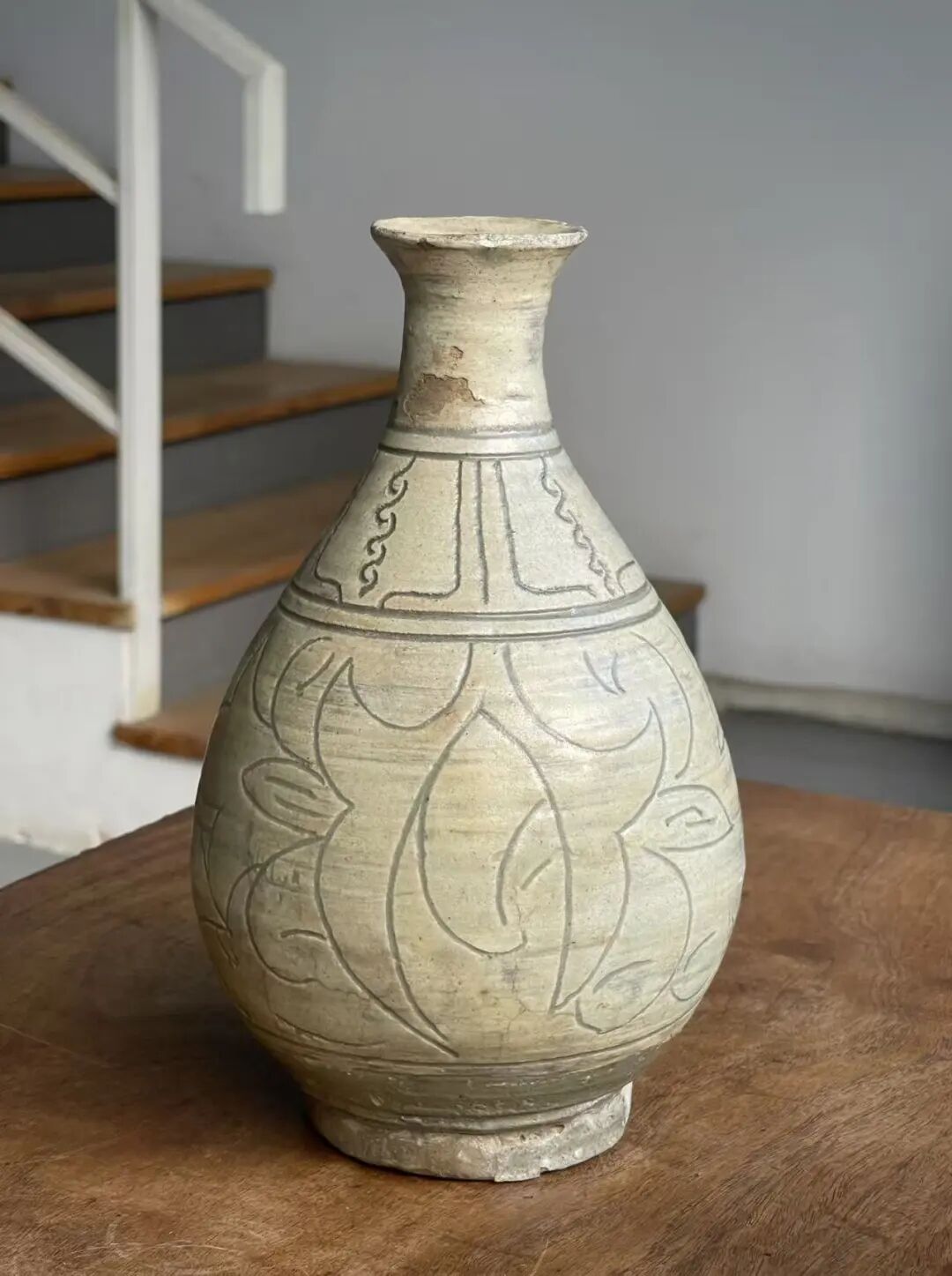 这是一件来自于朝鲜半岛的老玉壶春瓶,瓶身较圆渾,与明代之玉壶春瓶造型相似。此瓶之制作方式源于中原河北地区的磁州窑,灰陶土胎罩上白色化妆土,并以刀尖刻划豪迈生动的花卉纹,此类陶瓷是陶鲜半岛除高丽青瓷外较著名的品类,当地称之为“粉青“类陶瓷。对于日本古陶瓷工艺有涉猎的朋友应该都知道,日本陶艺中常用的“刷毛目“与“粉引”之陶瓷装饰手法正是来自粉青这类的朝鲜陶瓷。