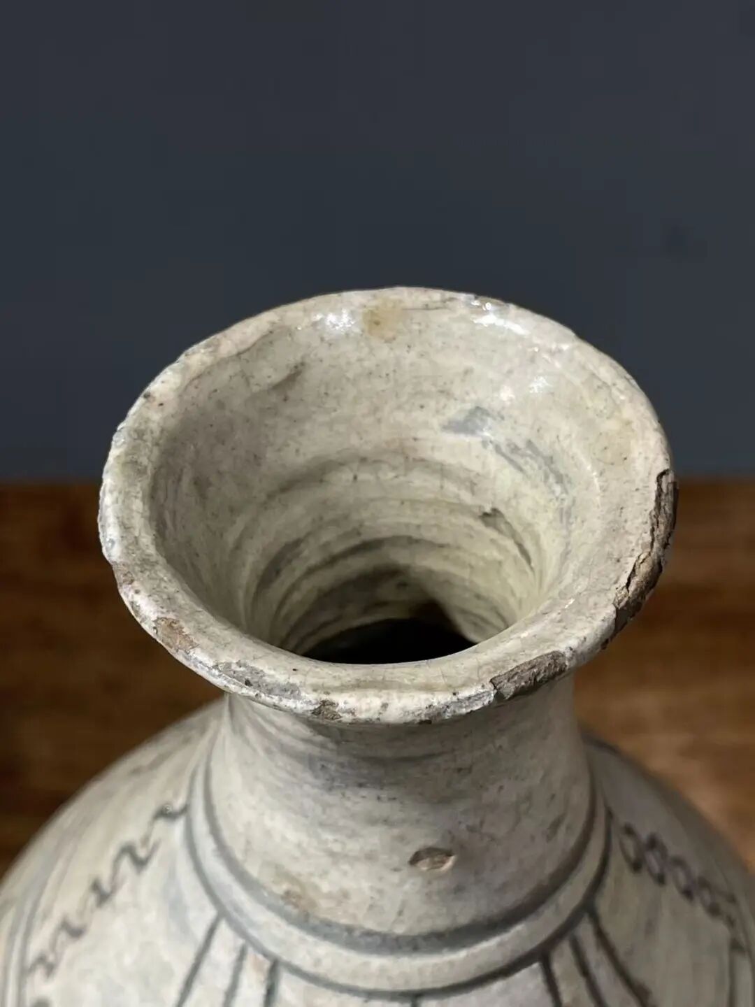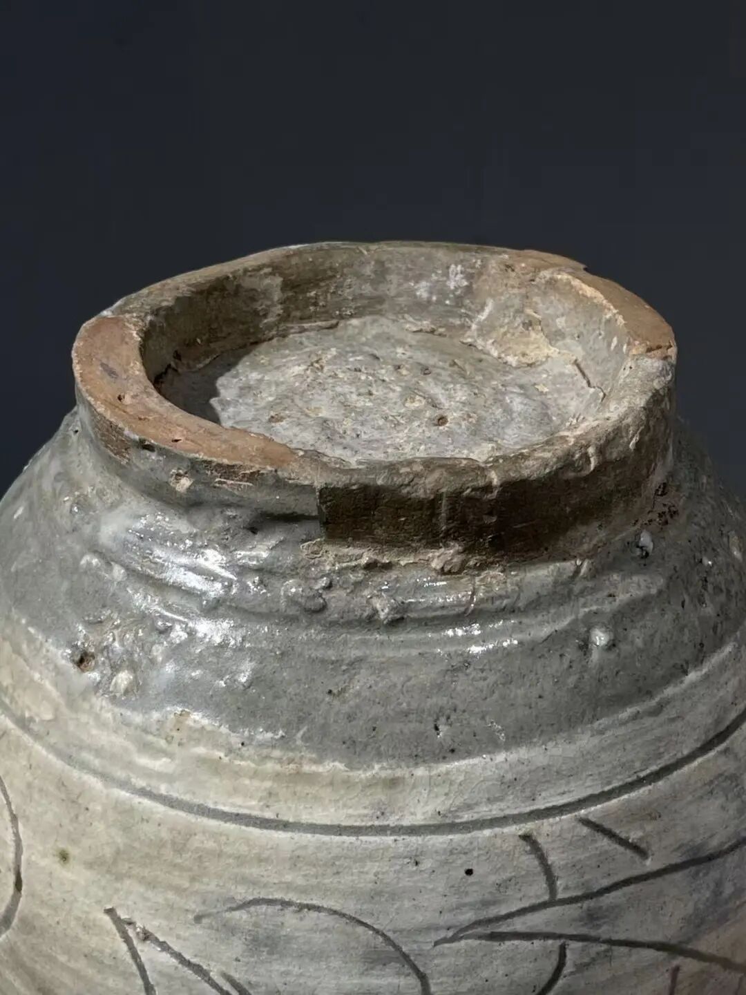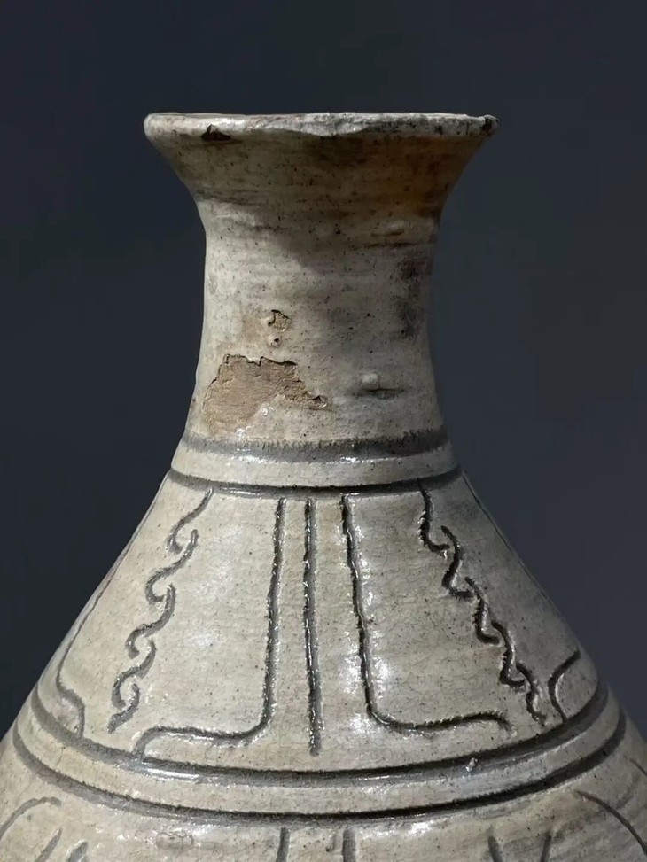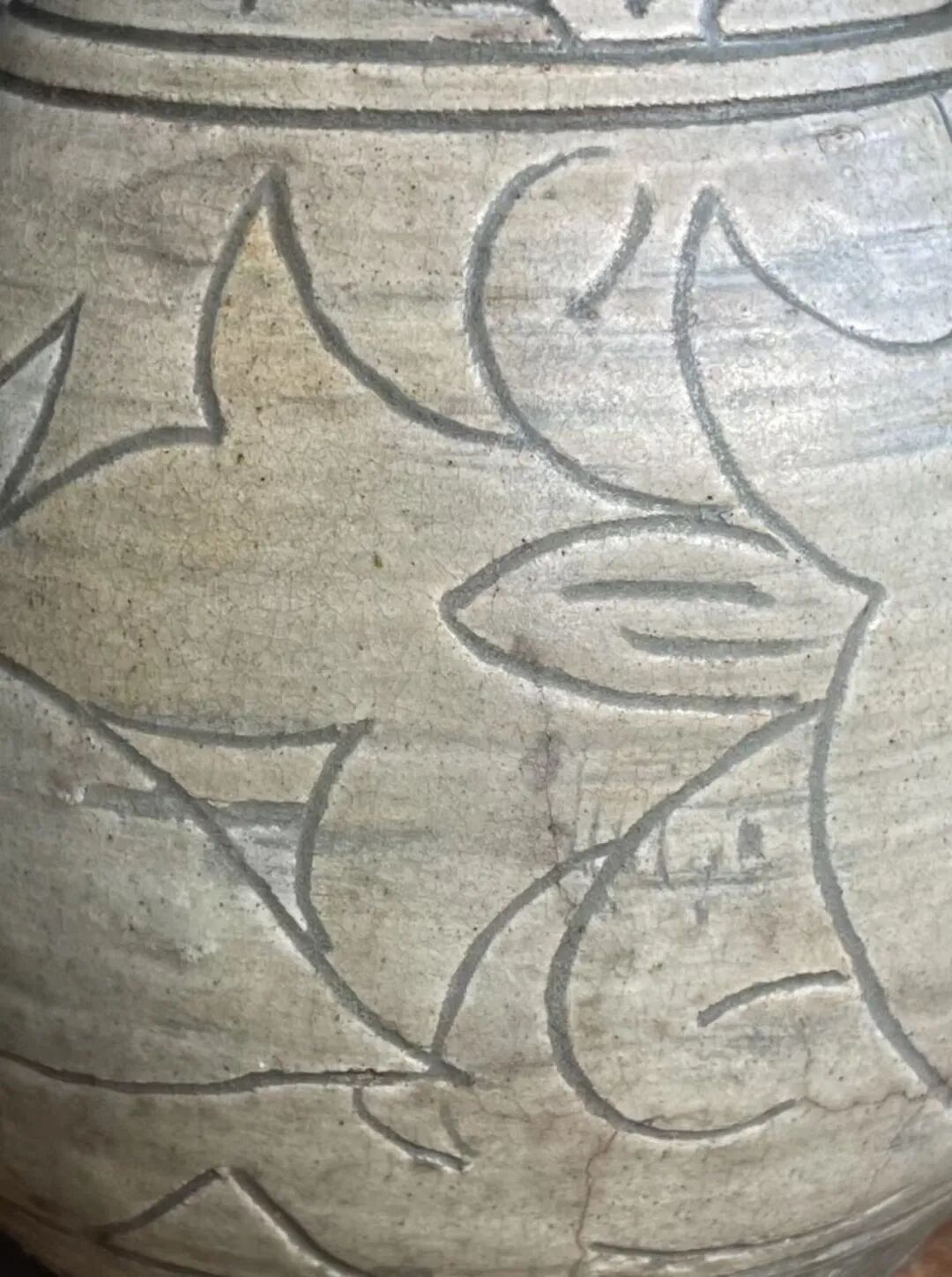 这是一件来自于朝鲜半岛的老玉壶春瓶,瓶身较圆渾,与明代之玉壶春瓶造型相似。此瓶之制作方式源于中原河北地区的磁州窑,灰陶土胎罩上白色化妆土,并以刀尖刻划豪迈生动的花卉纹,此类陶瓷是陶鲜半岛除高丽青瓷外较著名的品类,当地称之为“粉青“类陶瓷。对于日本古陶瓷工艺有涉猎的朋友应该都知道,日本陶艺中常用的“刷毛目“与“粉引”之陶瓷装饰手法正是来自粉青这类的朝鲜陶瓷。