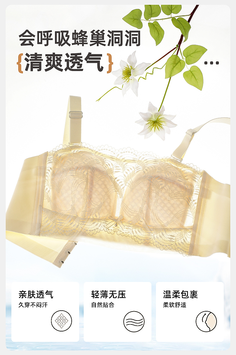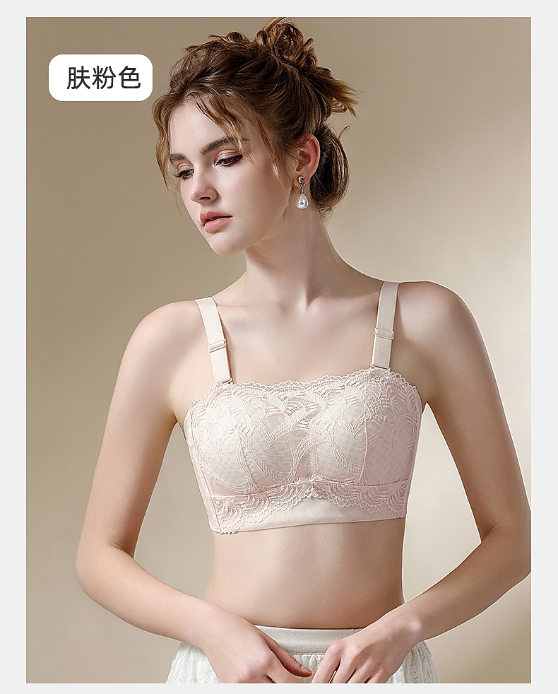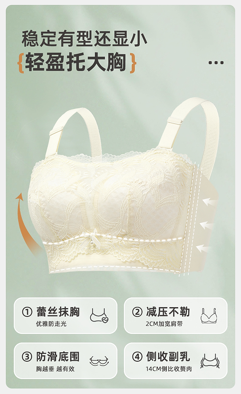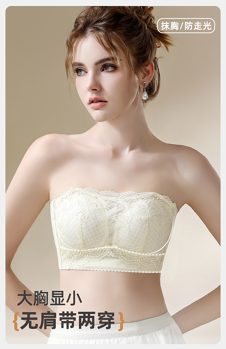 雅黛俪女士内衣大胸显小显瘦轻薄透气蕾丝可拆卸肩带抹胸式文胸春夏新款胸罩
