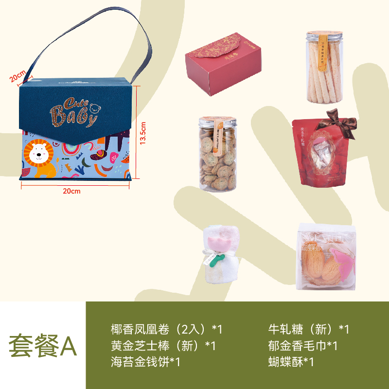 套餐A:蝴蝶酥*1、黄金芝士棒*1、海苔金钱饼*1、牛轧糖(新)*1、椰香凤凰卷(2入)*1、郁金香毛巾*1