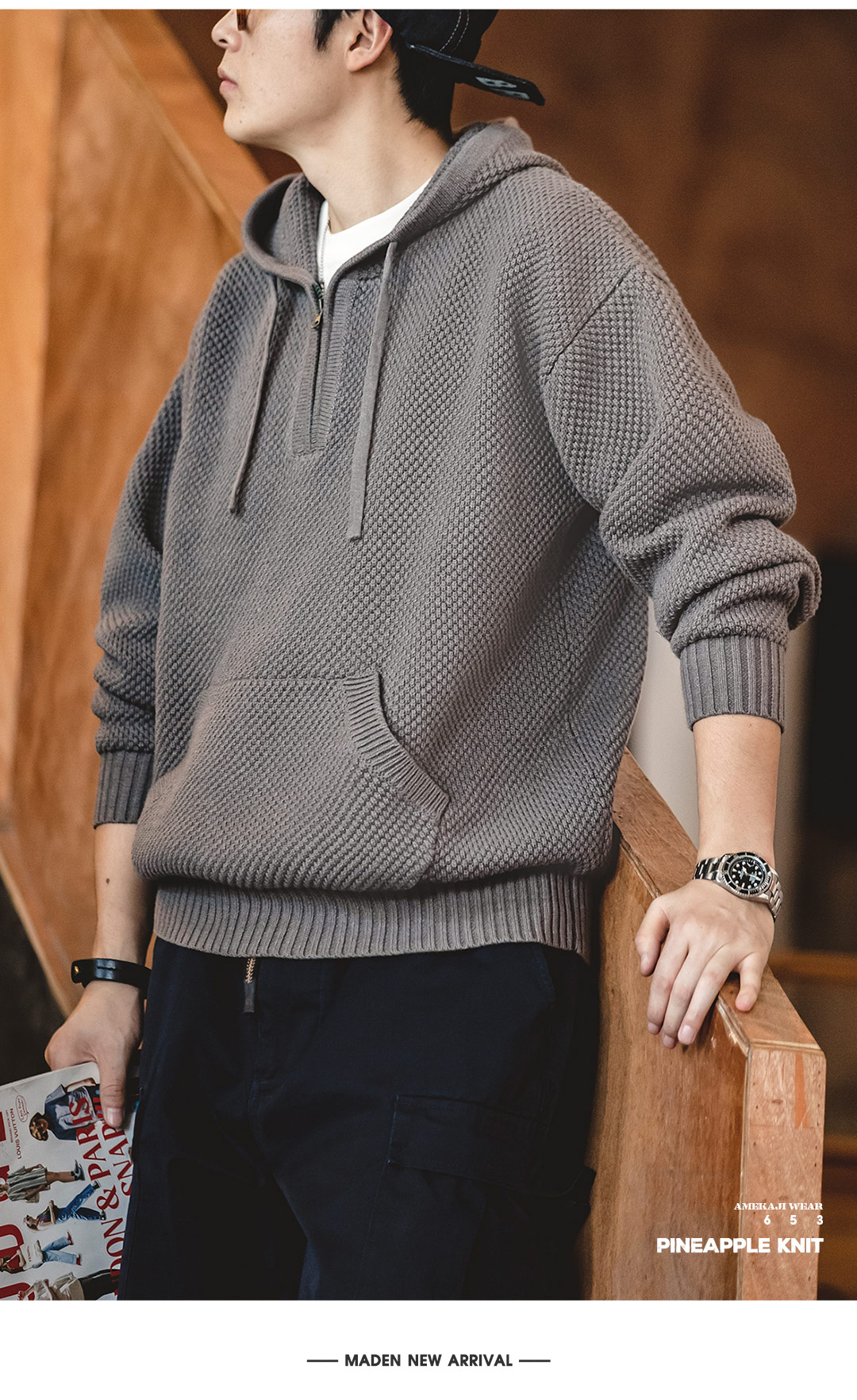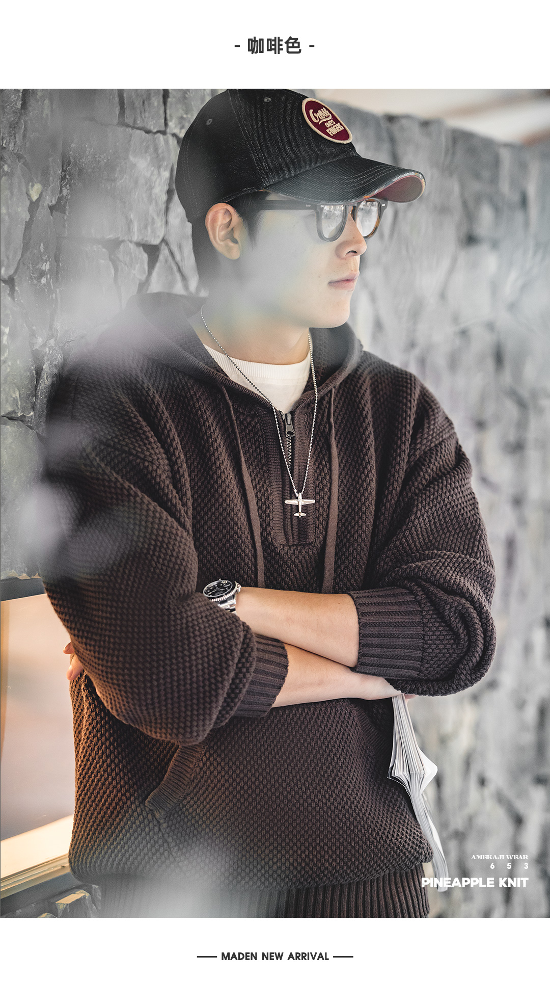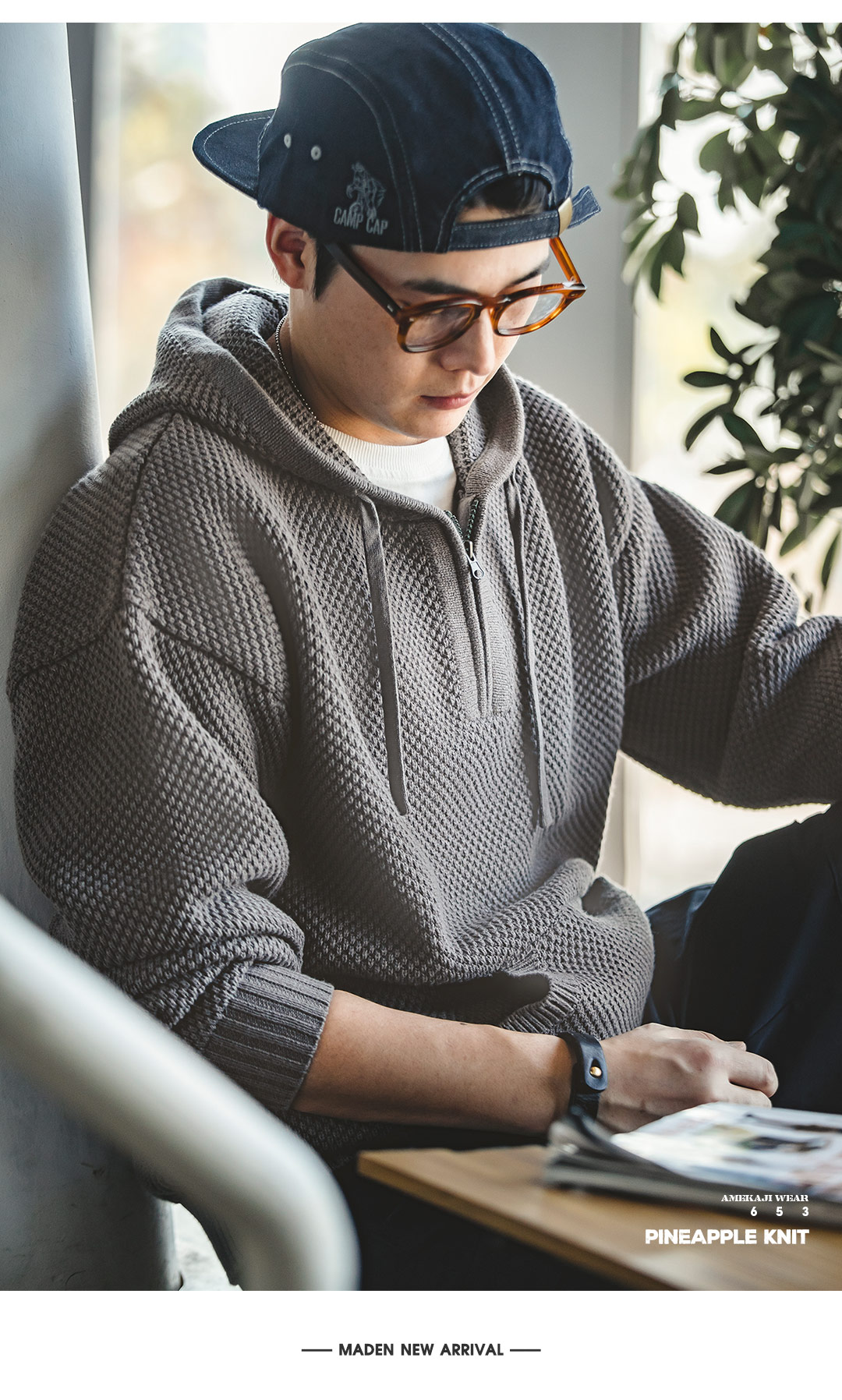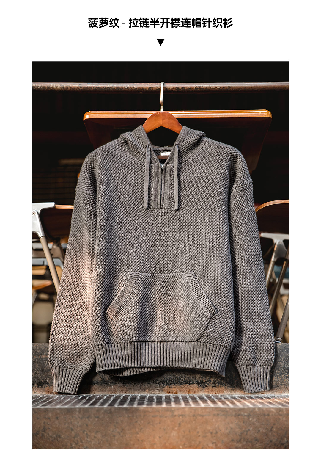 工装优选 美式休闲半拉链菠萝纹针织衫连帽立体加厚套头毛衣男秋