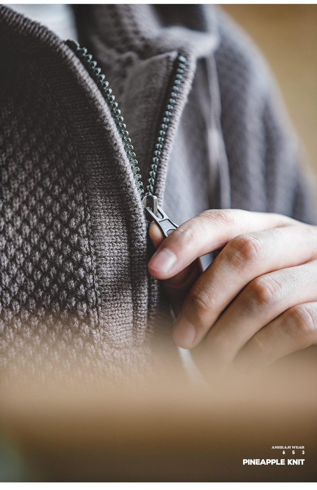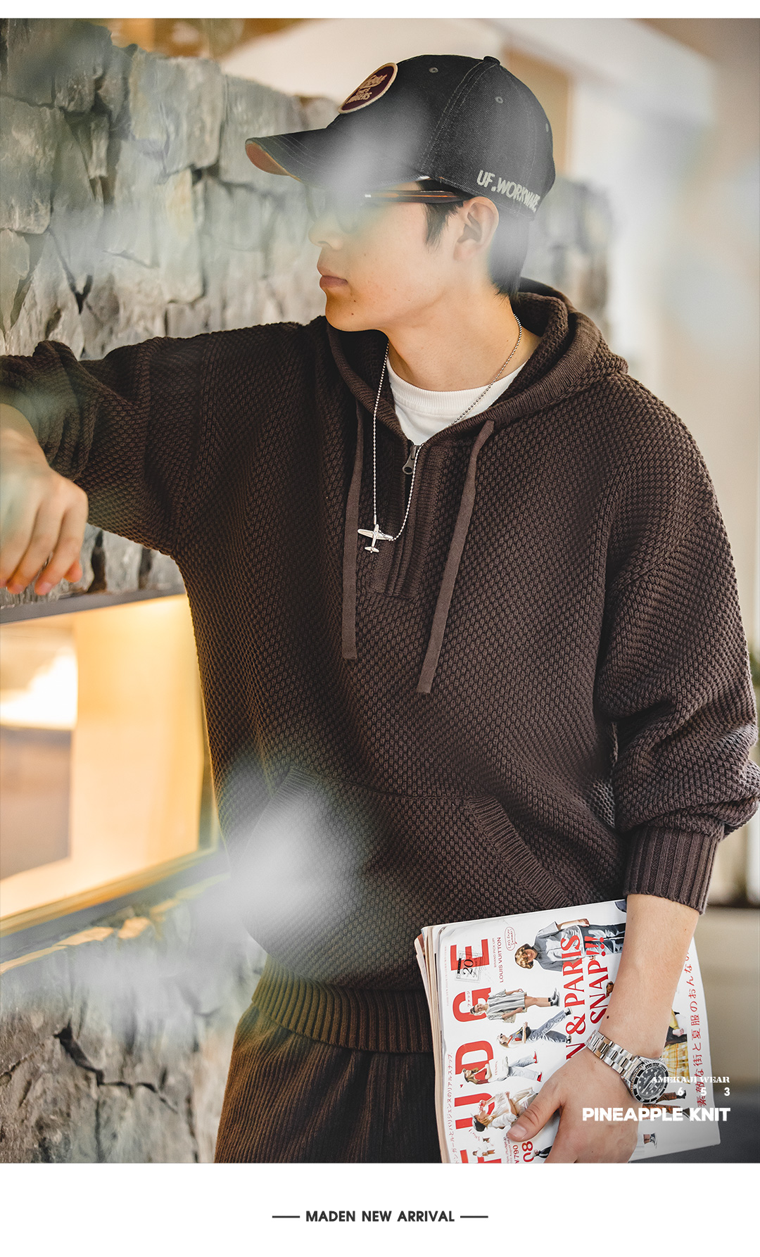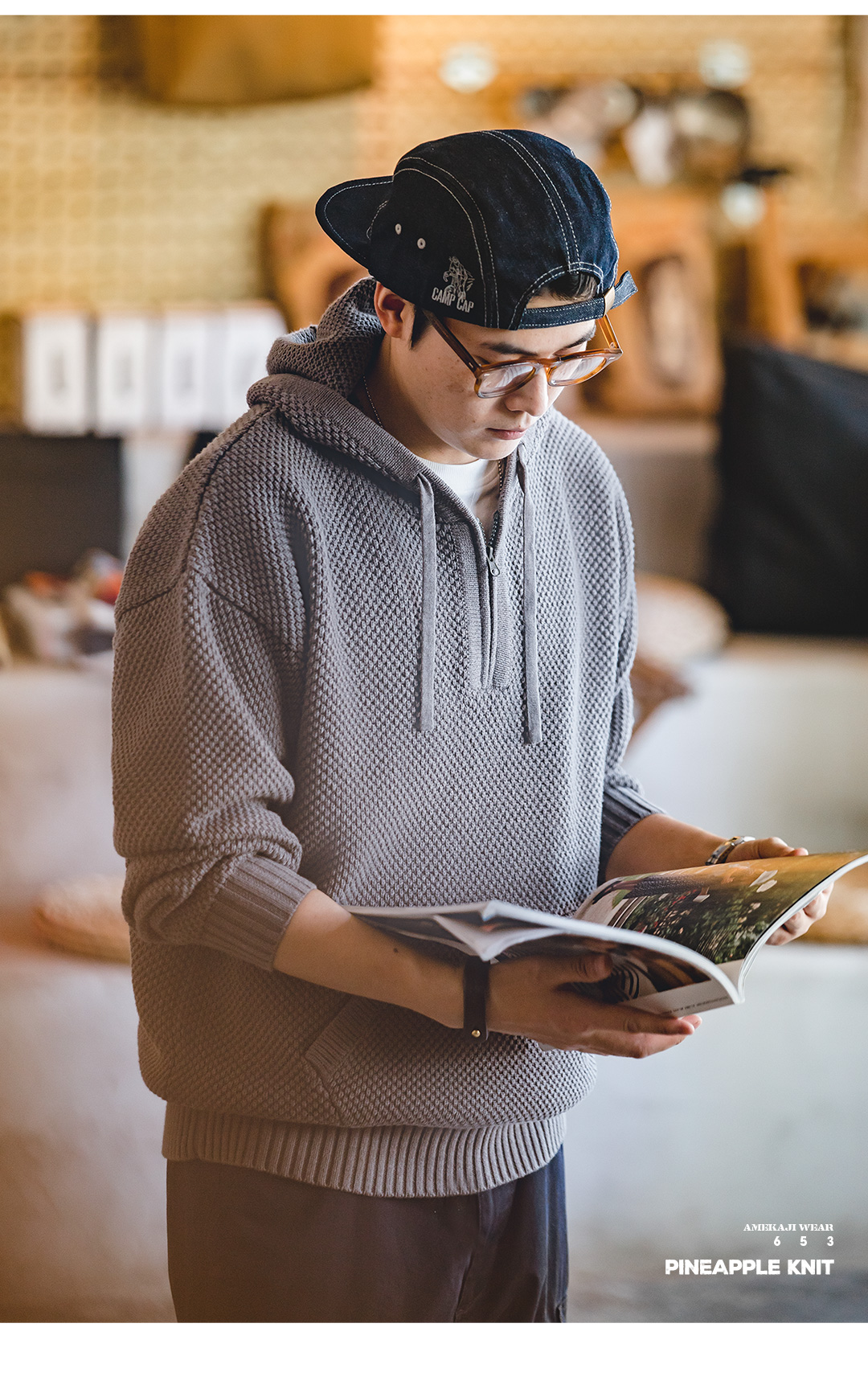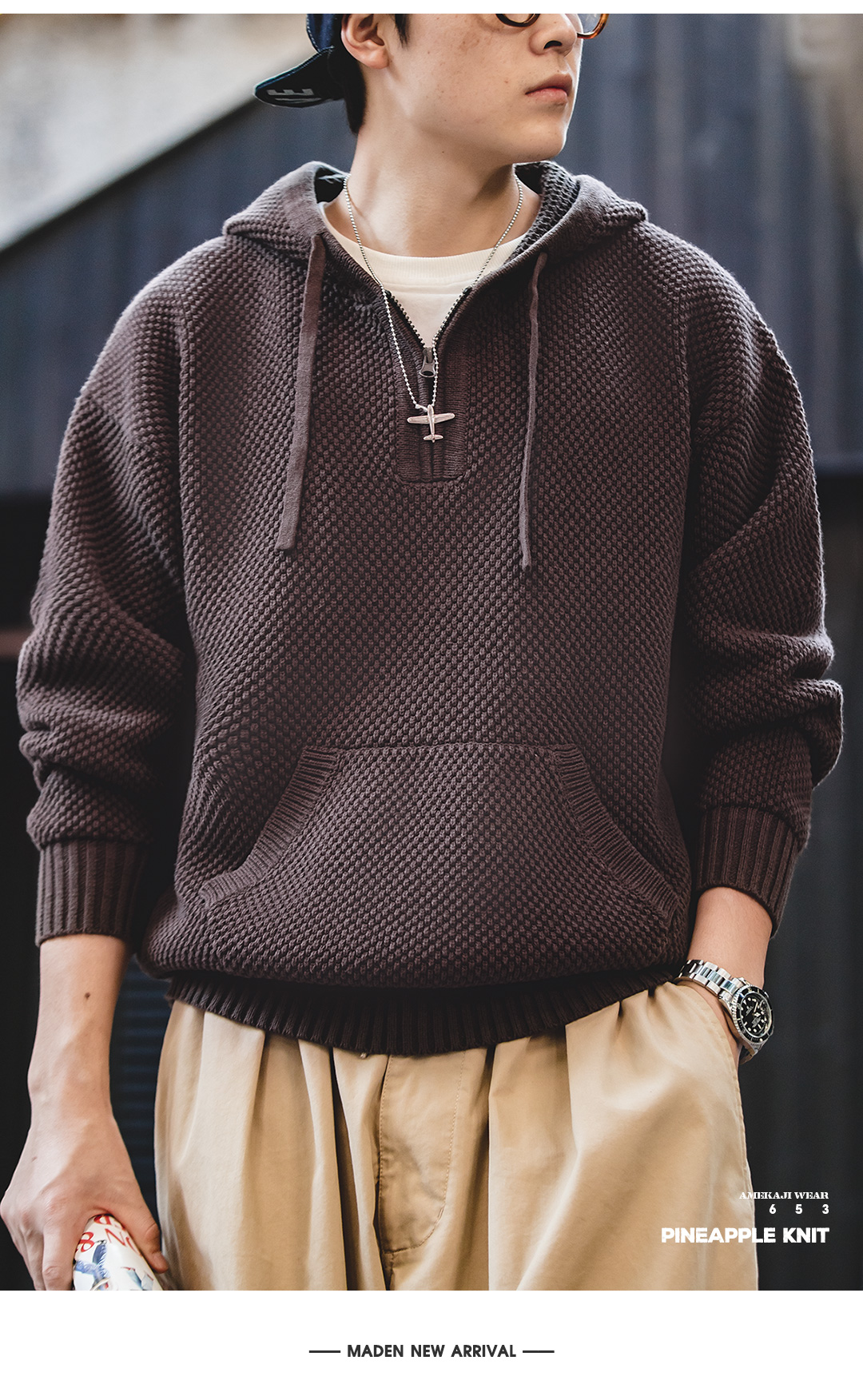 工装优选 美式休闲半拉链菠萝纹针织衫连帽立体加厚套头毛衣男秋