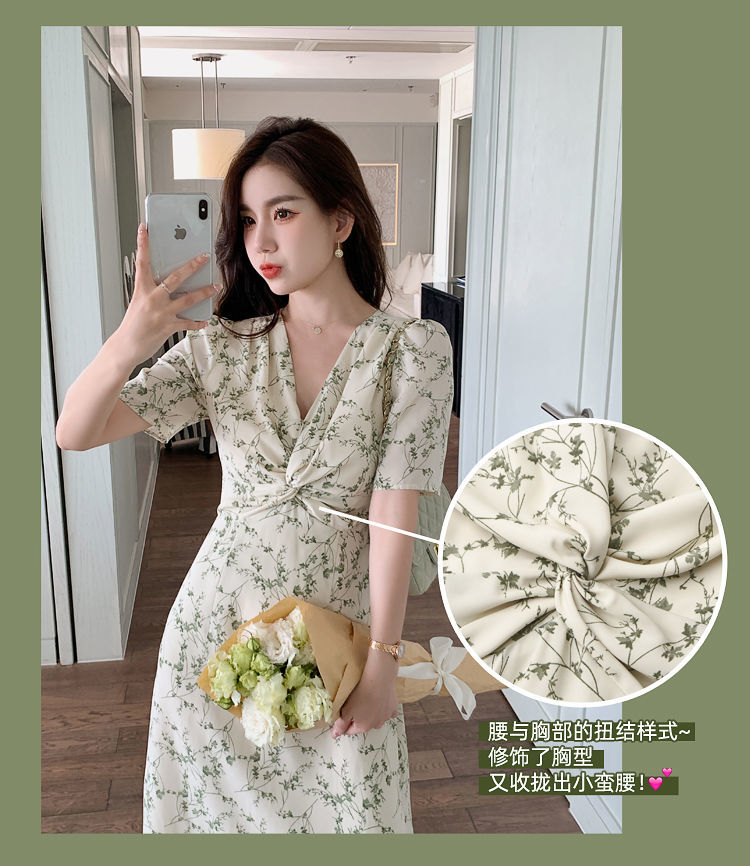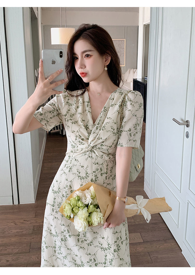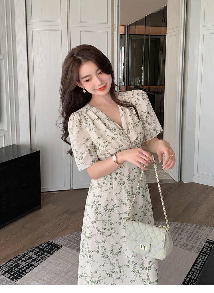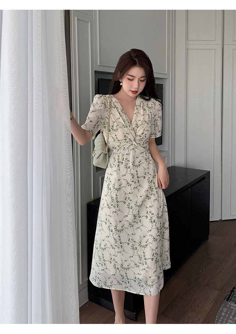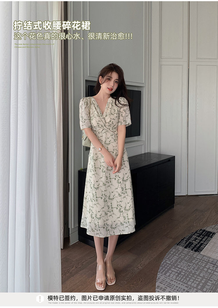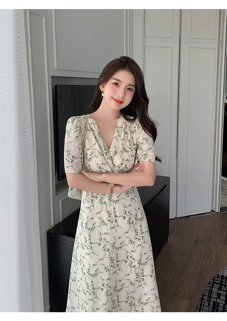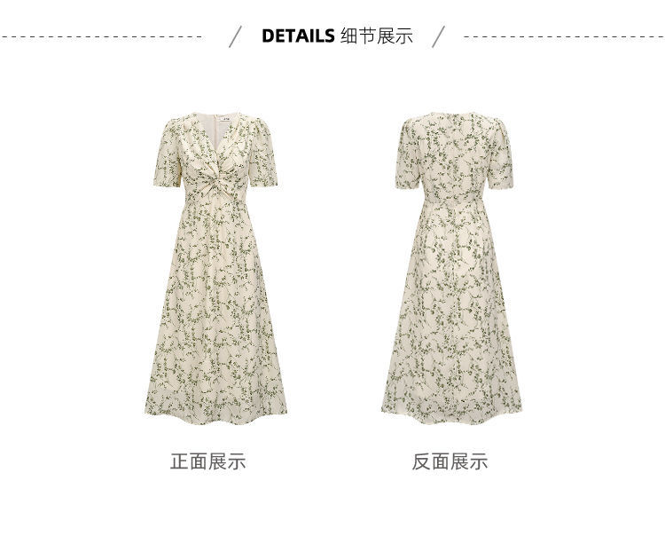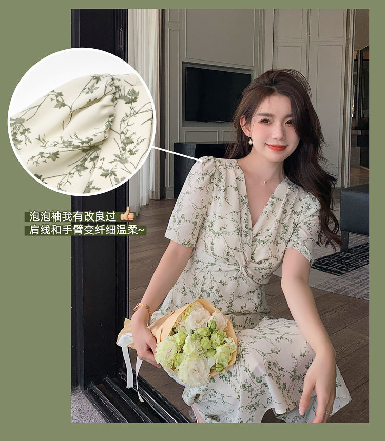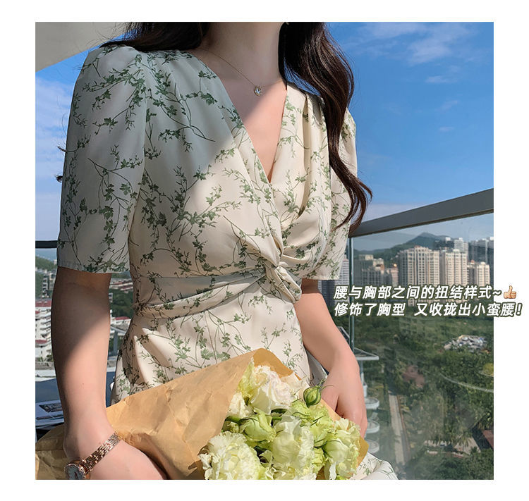 新款初恋温柔风绿色碎花裙V领连衣裙短袖雪纺a字裙女夏季wyt17
