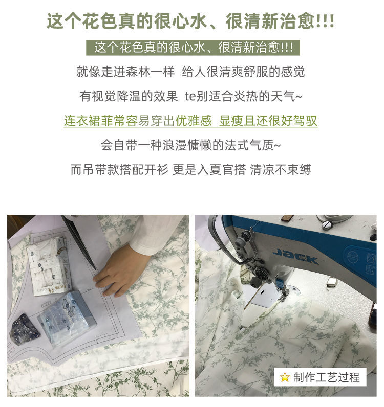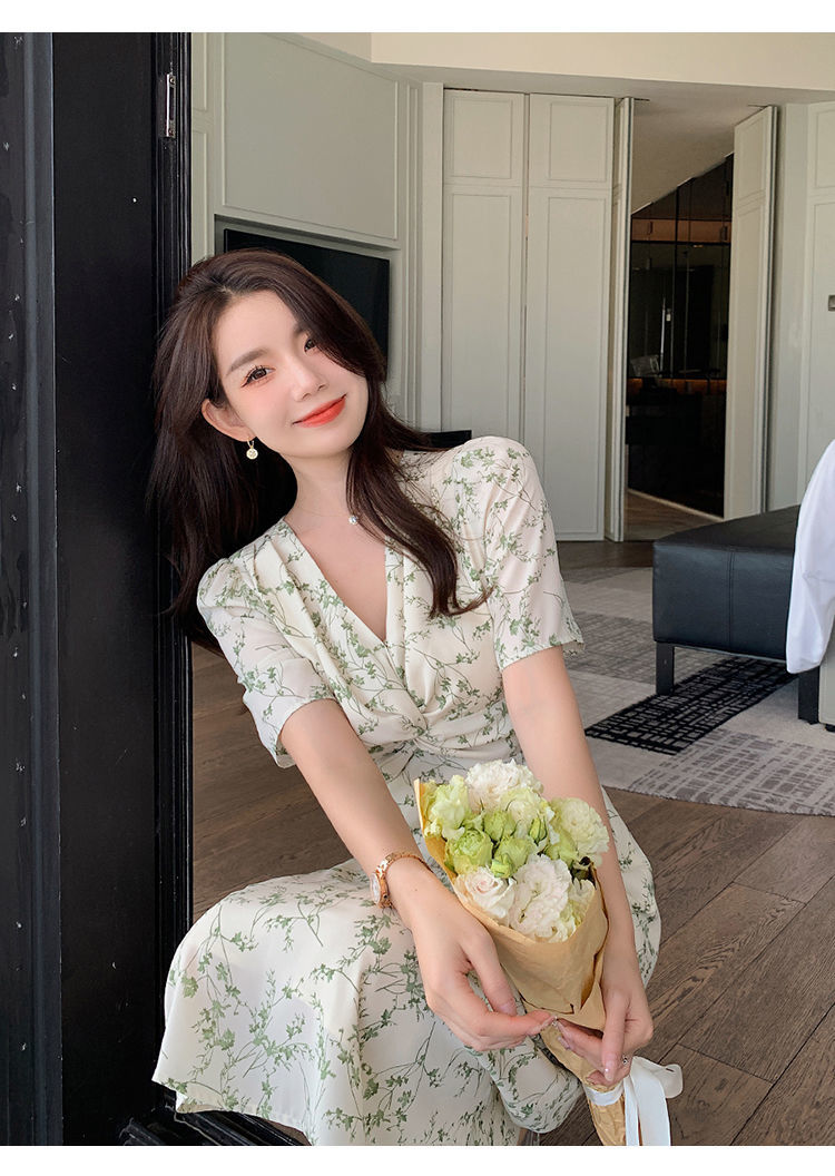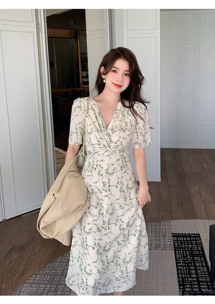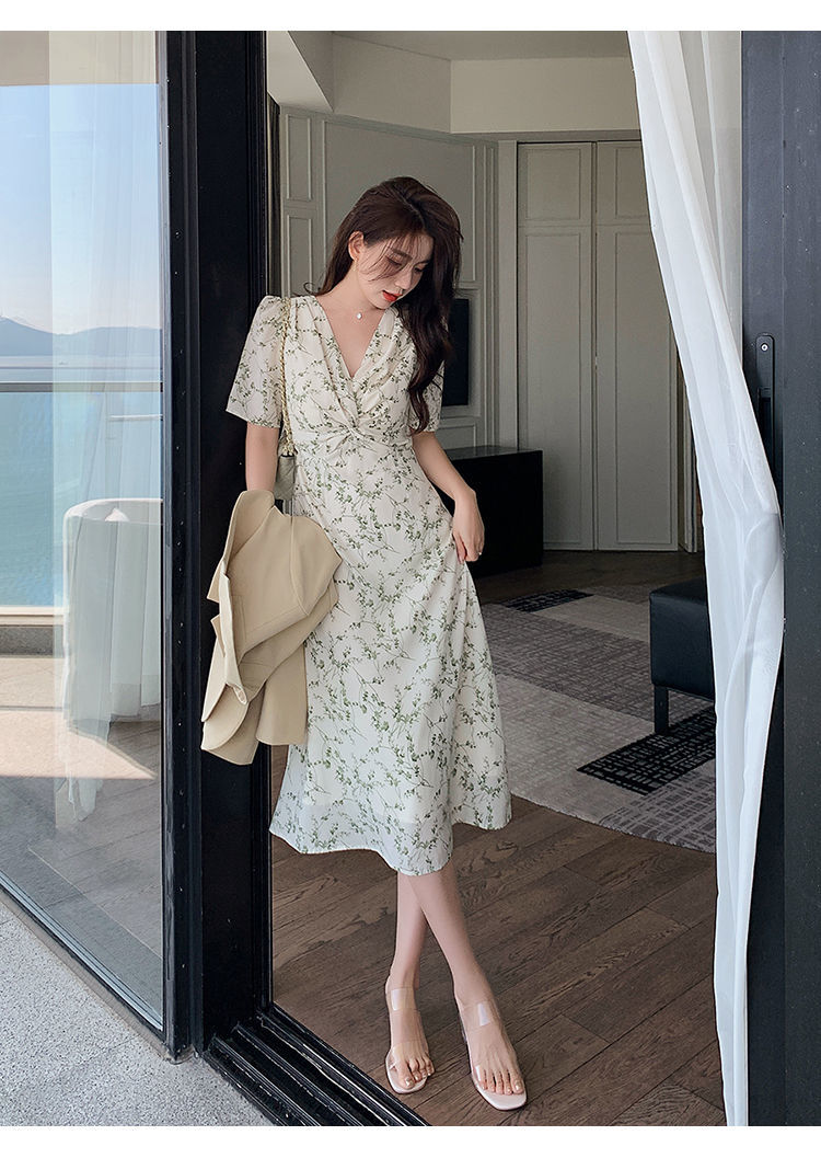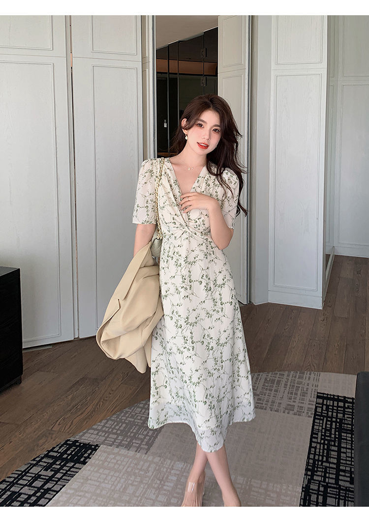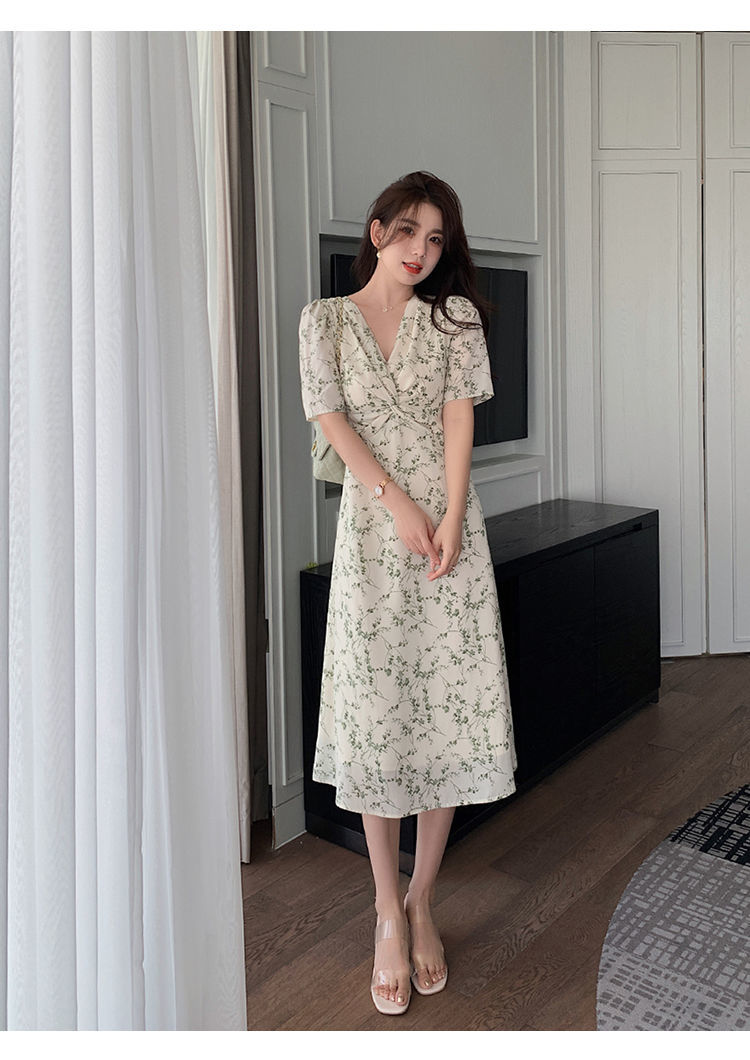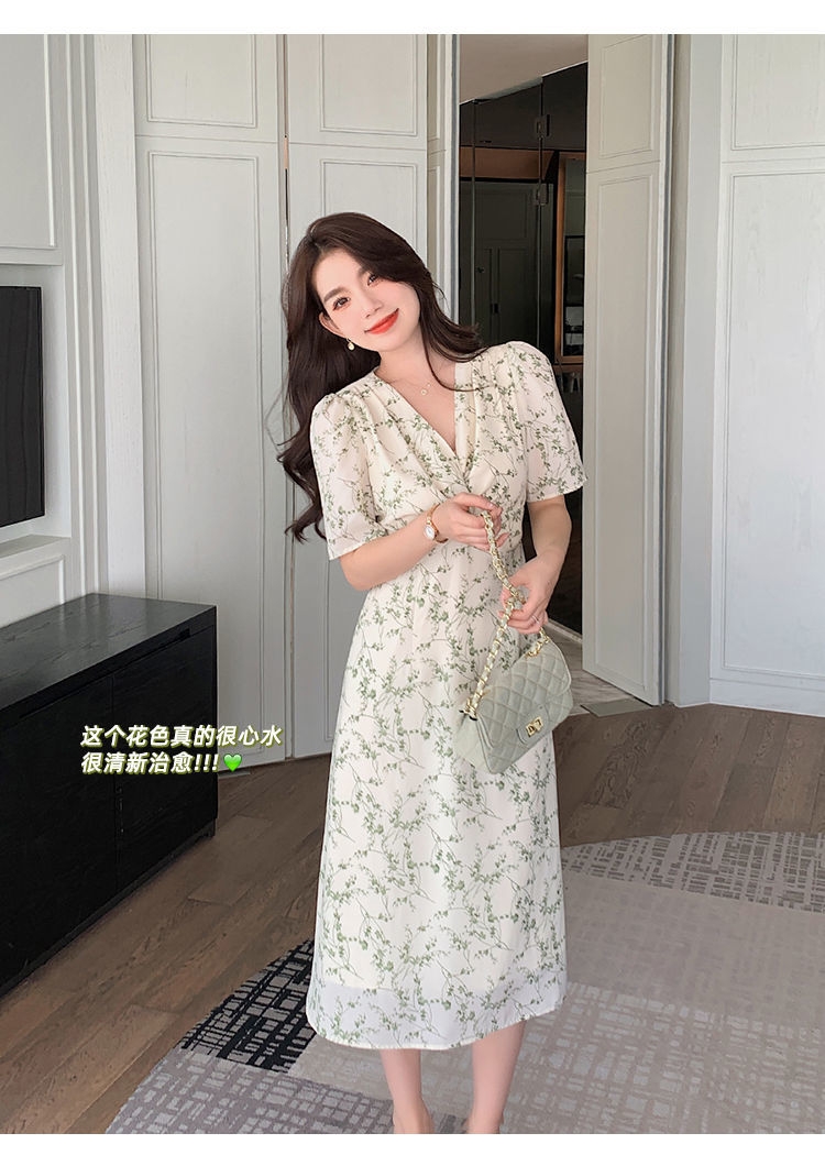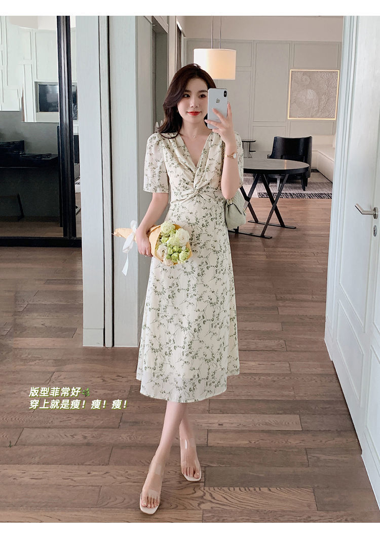 新款初恋温柔风绿色碎花裙V领连衣裙短袖雪纺a字裙女夏季wyt17