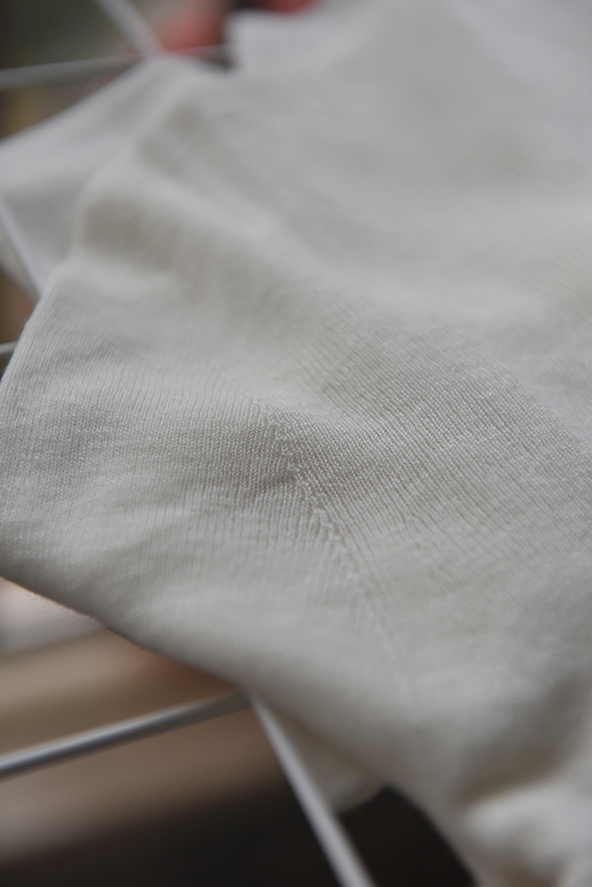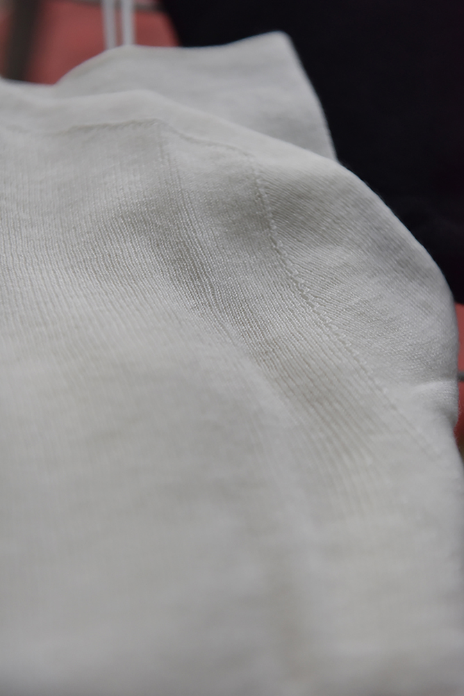 日本岛精一体成型工艺,它不像普通针织衫有前后片需要人工拼接,整件衣服采用3D无缝技术,衣身两侧没有接缝,全部一体织成,没有内里边缝对肌肤的摩擦,且领口和衣摆处均为隐形收边,所以才能打造出完美的裸穿效果。