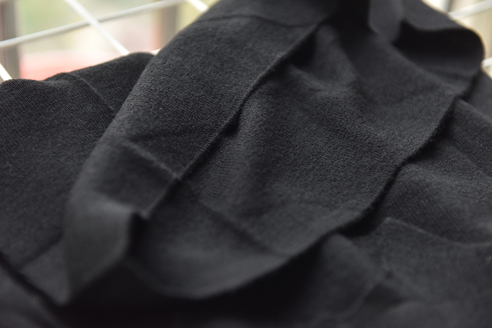 今天的堆领水波纹,是采用3D集圈针织工艺,让织针钩住新纱线,但不脱圈,旧线圈仍留在针钩上,下一次成圈时,多个线圈一起脱圈,形成了拉紧和放松的区域,从而产生凹凸的犹如水波纹的肌理,这种织法让保暖效果增加三分之一。