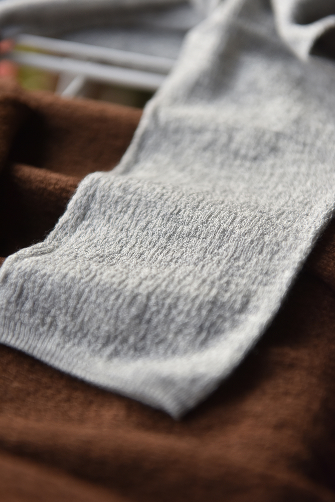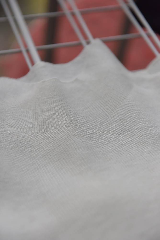 而半高领螺纹,则是通过将织针按前后交替排列,让两面都具有清晰的纵向纹路,弹性极大,不易卷边,我们这款的螺纹是18针超细螺纹,显瘦效果加倍。