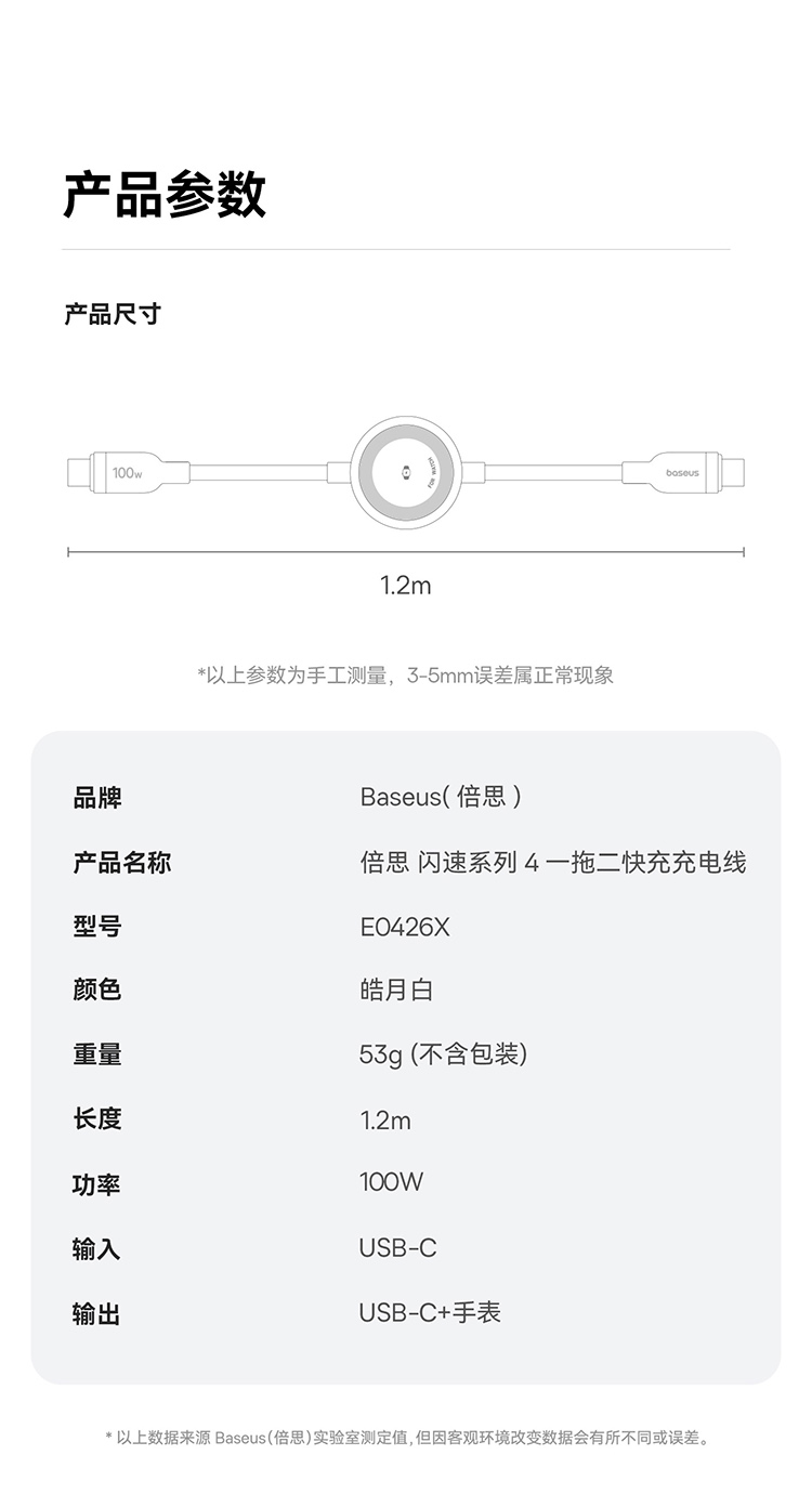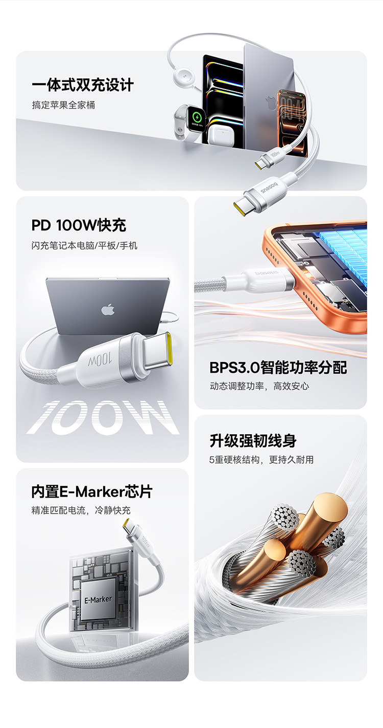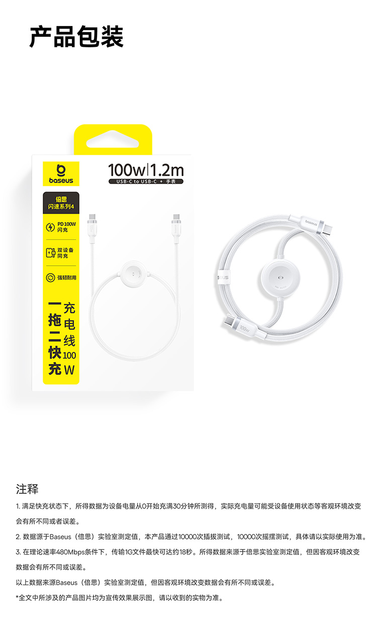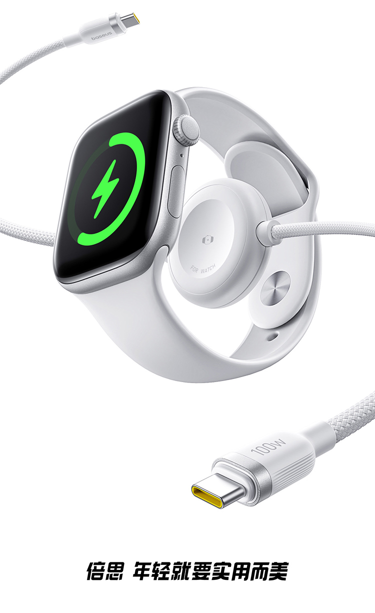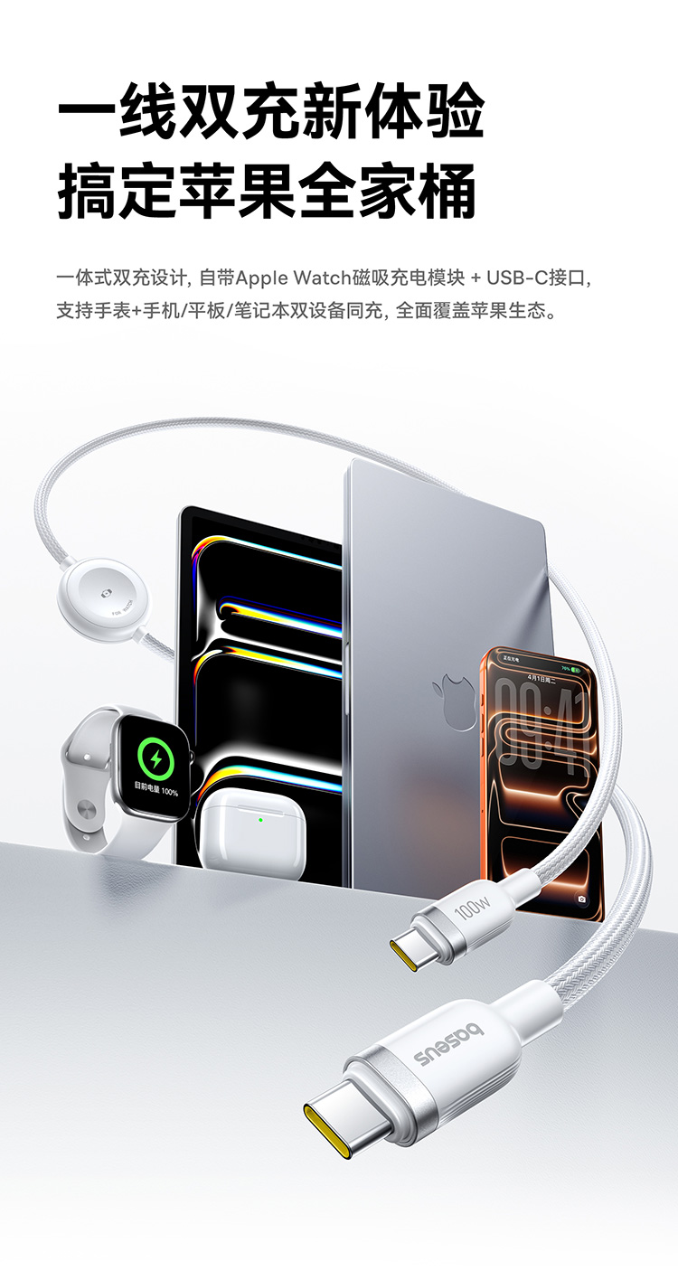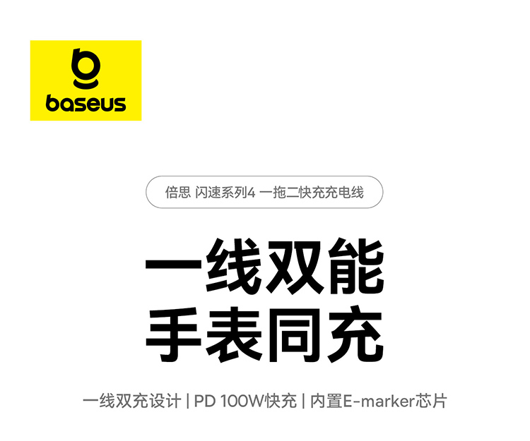 倍思 闪速系列4 一拖二快充充电线 USB-C to USB-C + 手表 100W