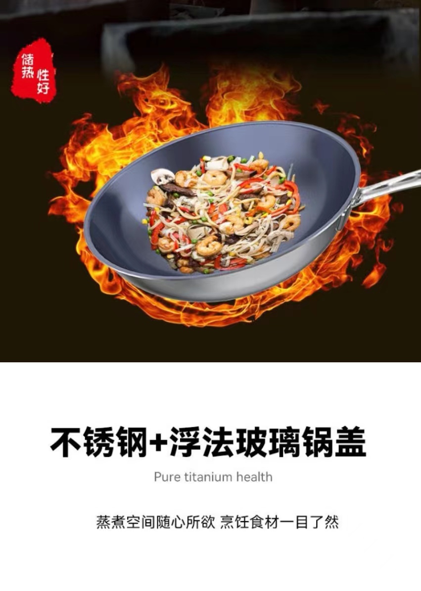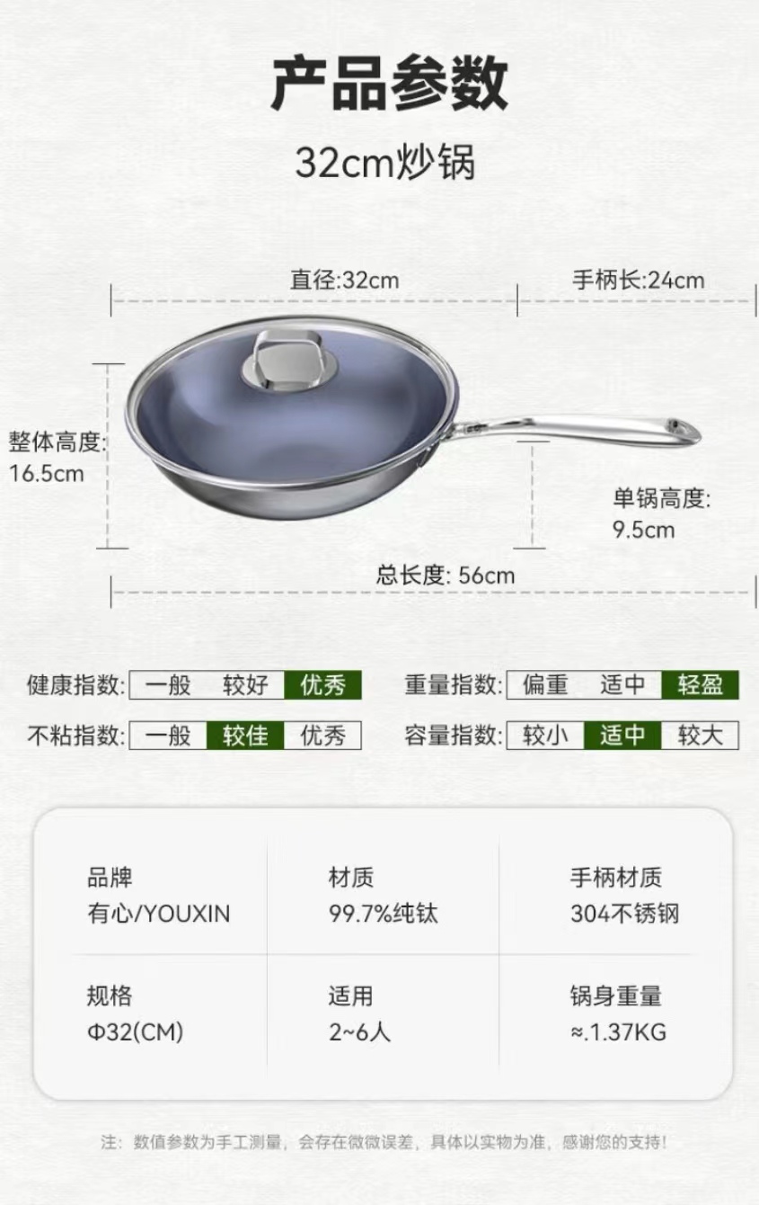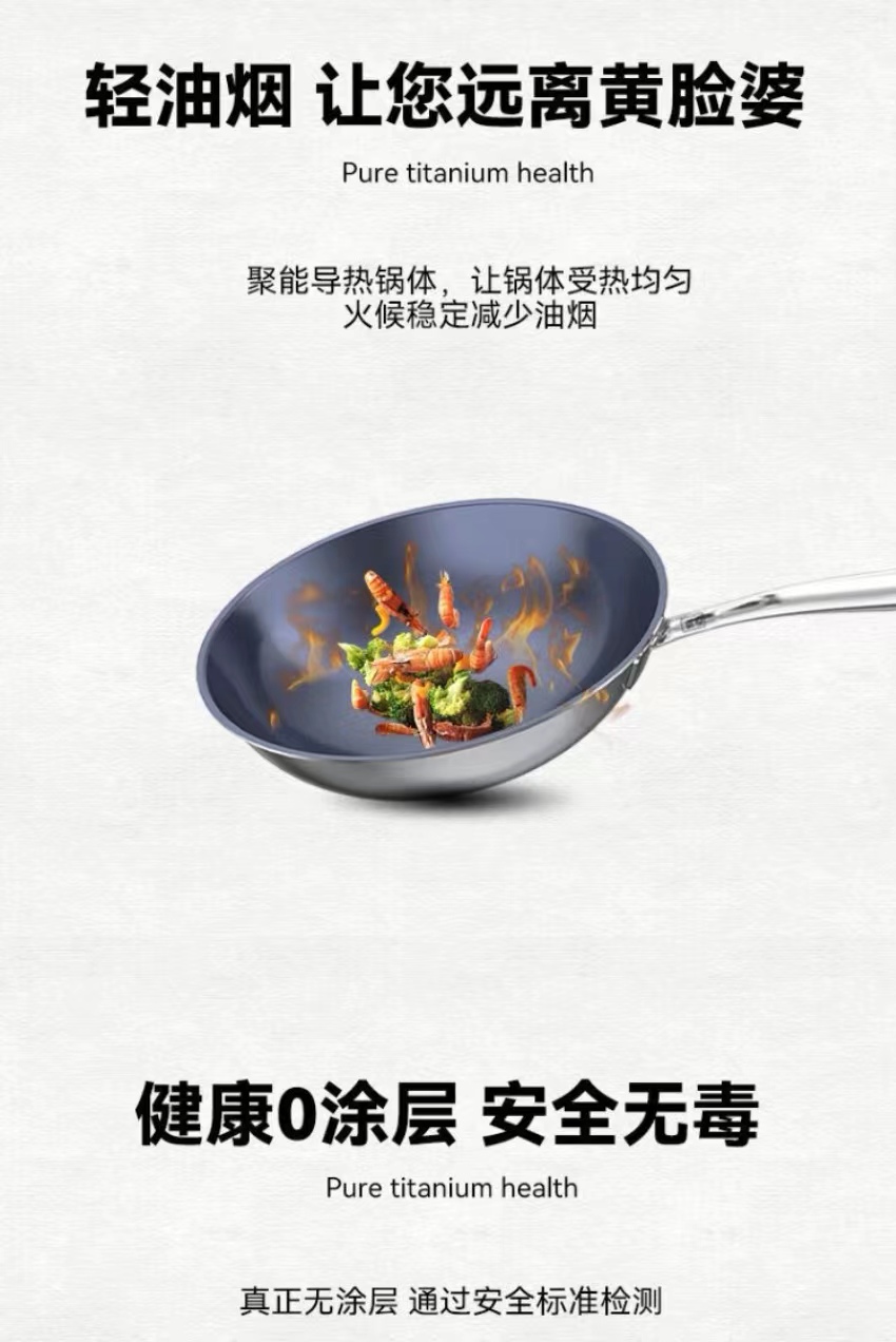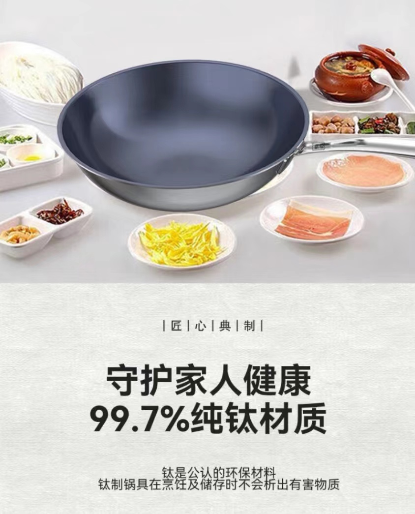 有心钛锅蓝钻纯钛锅 炒菜锅家用 无涂层物理不易粘 电磁炉燃气灶通用【超燃工艺】蓝钻升级版