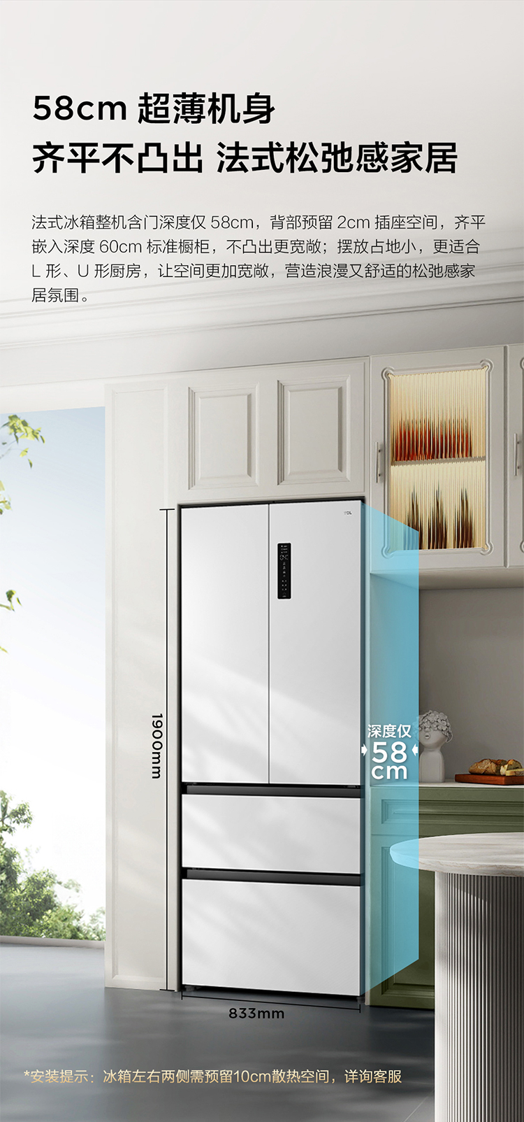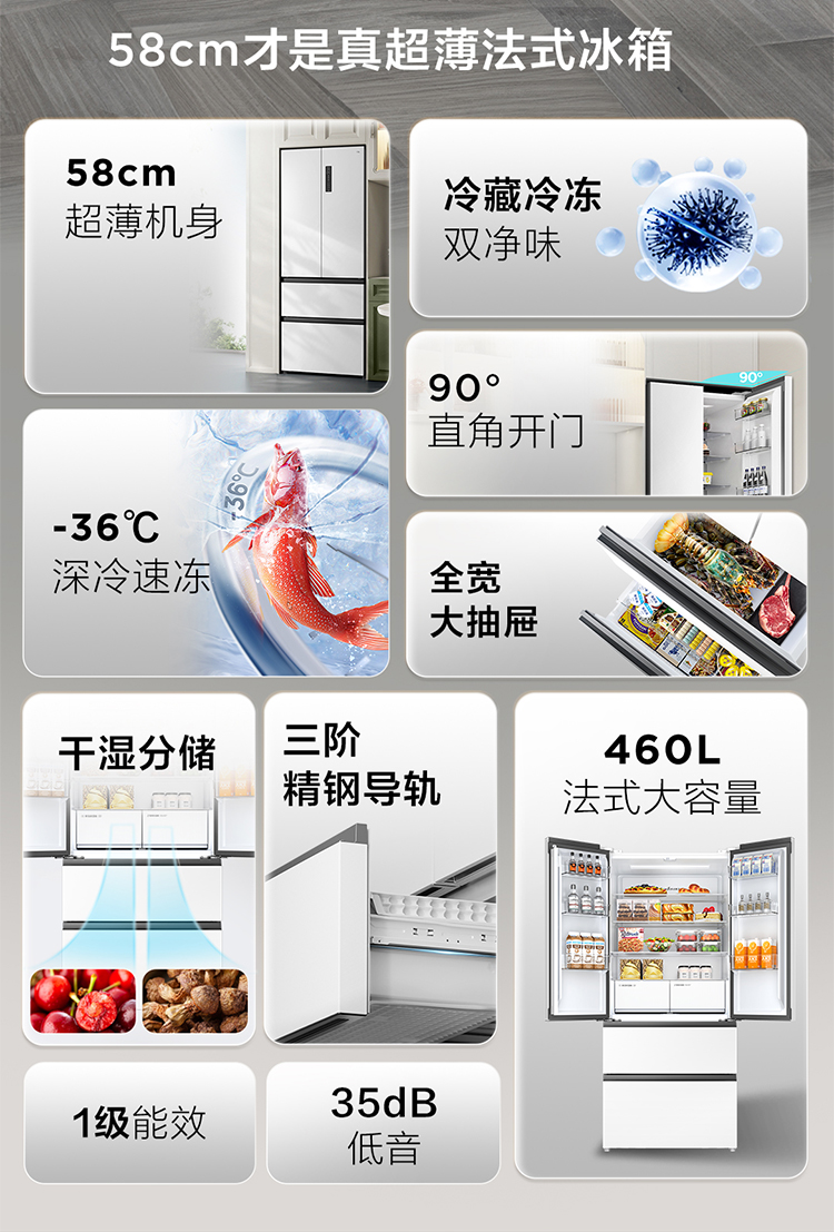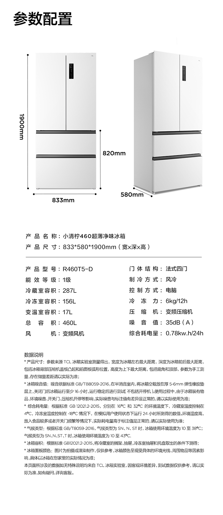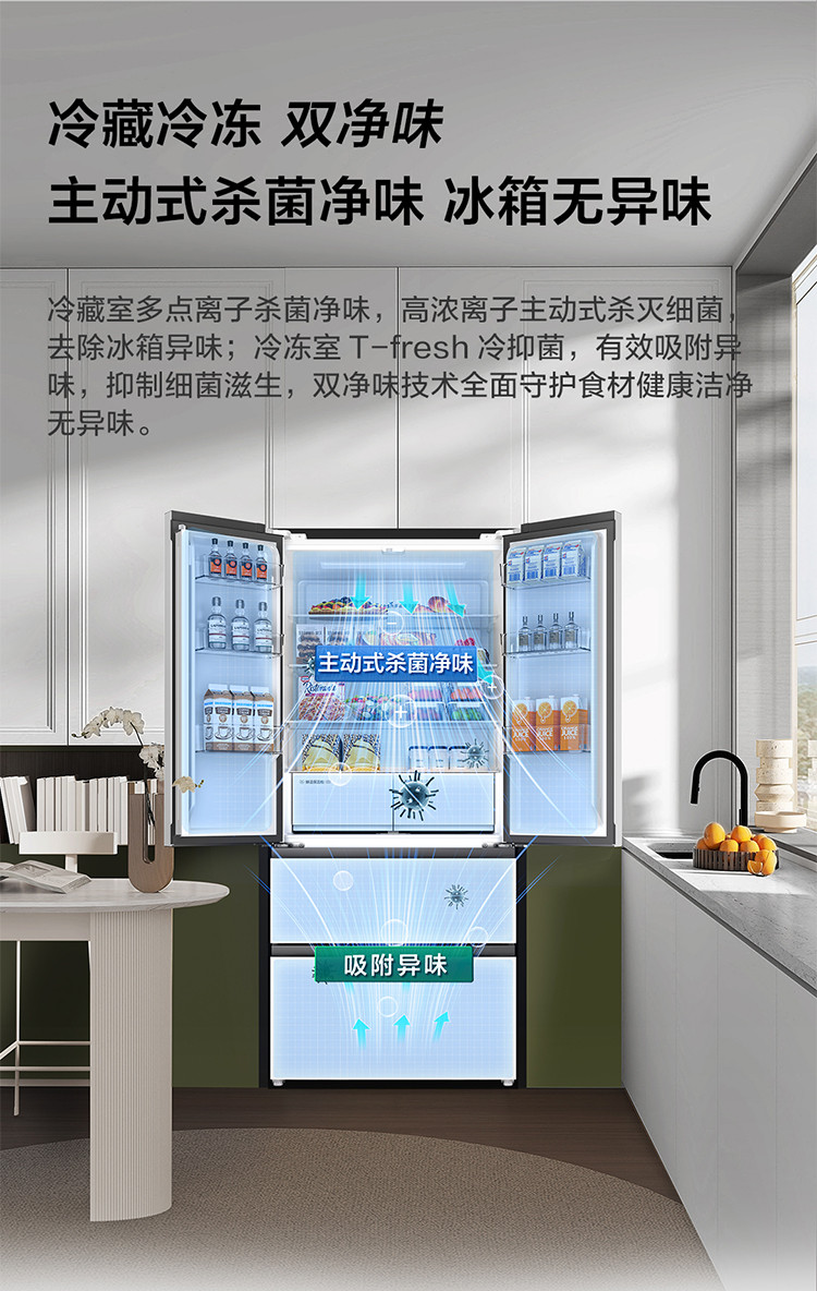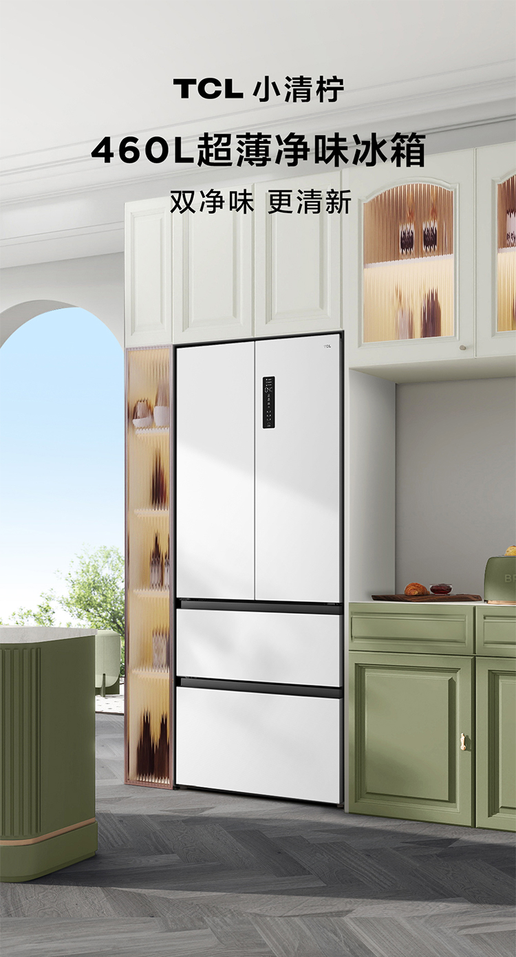 TCL小清柠460升法式多门四开门双净味58cm超薄机身一级能效冰箱 R460T5-D