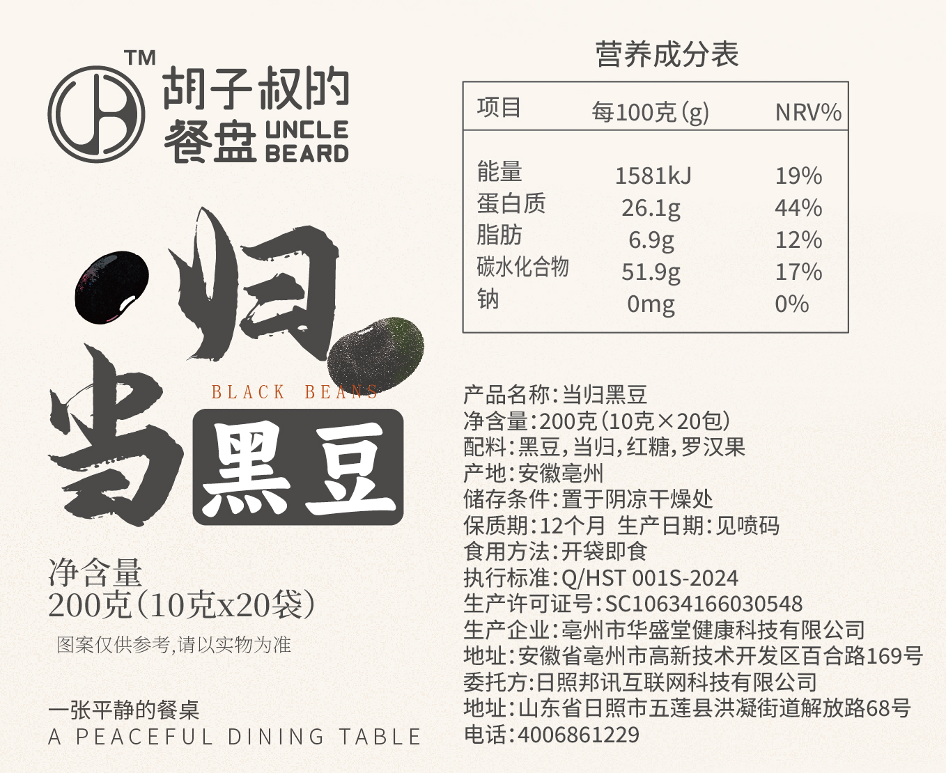 【配料】有机黑豆、当归(3年以上)、有机红糖、罗汉果