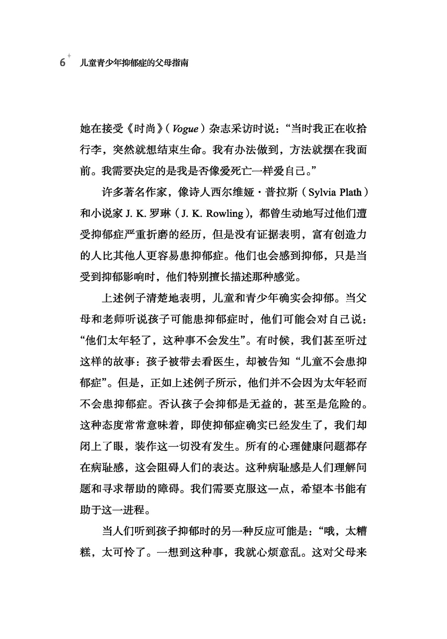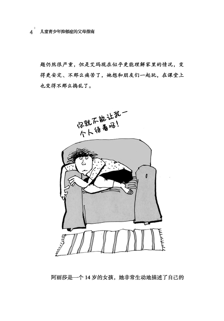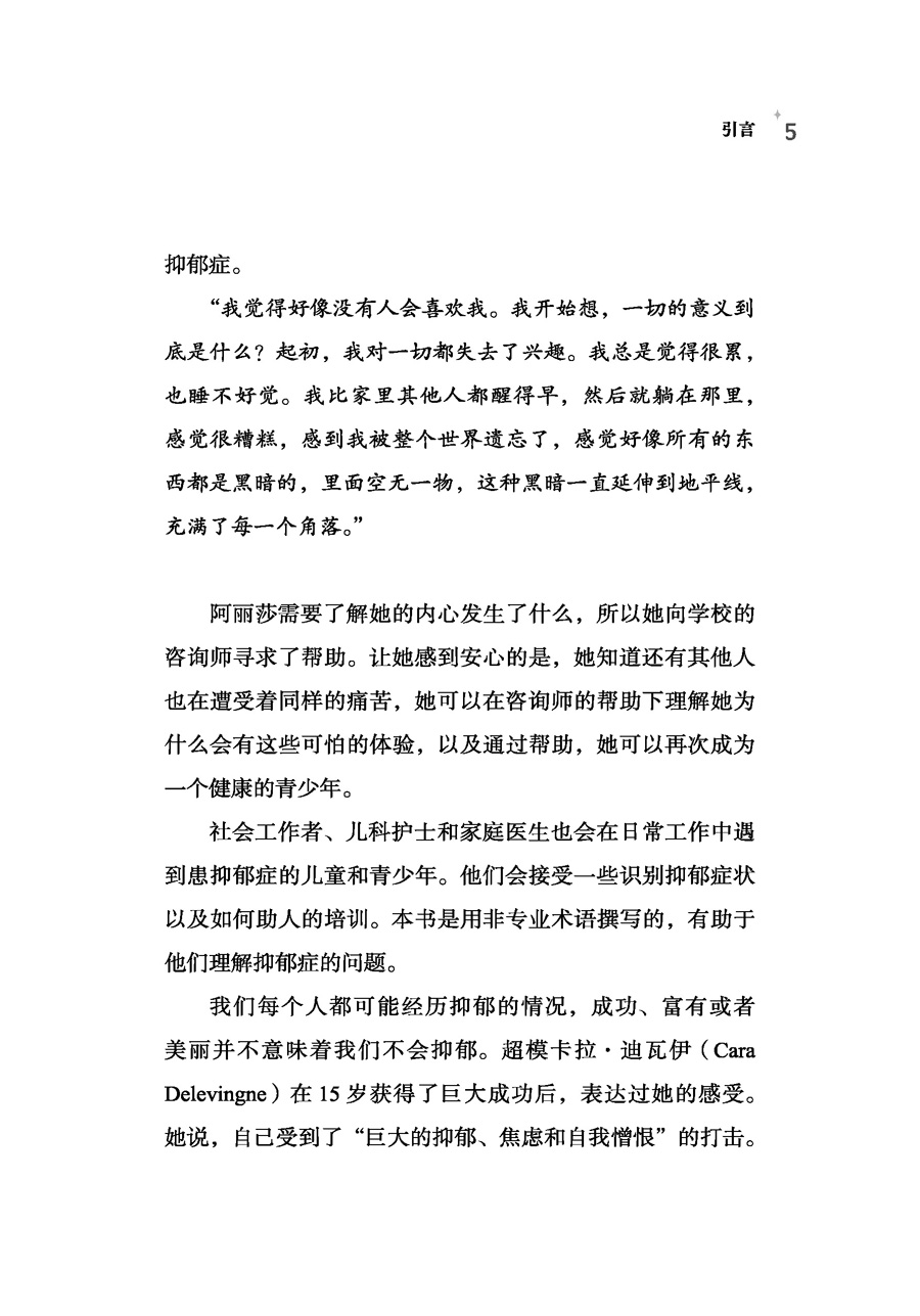 本书试图告诉家庭、学校和社会:抑郁症可能发生在任何人身上,它是由遗传和环境共同诱发、全世界都为之困扰的疾病。另外,它还告诉我们,孩子面对的世界并非成年人所想的那么无忧无虑——容貌焦虑、同伴拒绝、完美主义、父母否定、不当惩罚等,都潜藏在孩子的世界里,如果孩子们不能及时得到理解和支持,极易引发抑郁症。本书作者深入浅出,从实操的角度告诉父母如何识别、理解抑郁症,以及在遭遇抑郁症时该如何应对,可以说是一本关于儿童青少年抑郁症的“父母宝典”。