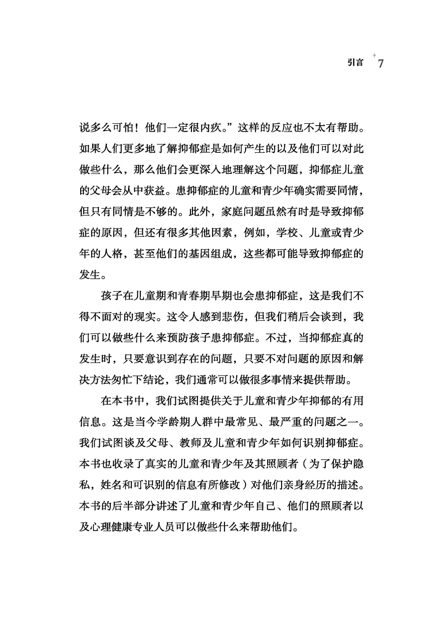 为什么抑郁症对一些人有影响,而对另一些人没有影响,这仍然是个谜,但重要的是记住,有很多方法可以应对它。这种狡诈又恶毒的疾病最致命的伎俩之一,就是让我们相信我们所遭受的绝望是我们的错:我们要为自己所处的这种状态付一定的责任,我们不配幸福。这就是为什么他人提供的、有依据的帮助如此重要。本书有很多有用的信息,不仅是针对儿童和青少年抑郁症孩子,也针对他们的家长和老师,多方位的支持能让孩子更快地走出抑郁。
